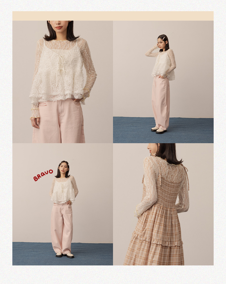 姵萱聯名 配色木耳邊透膚蕾絲上衣-杏 S/M/L