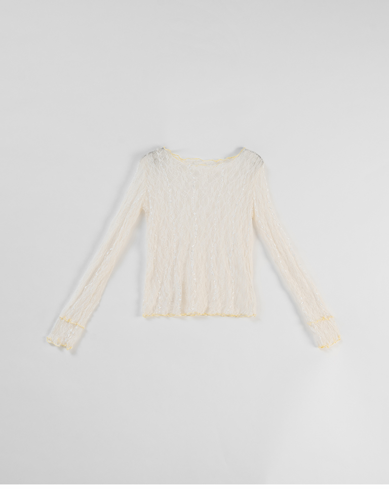 S~L身形實測!分尺寸皺皺木耳邊透膚高領長袖上衣