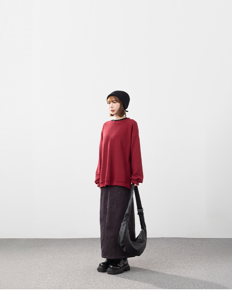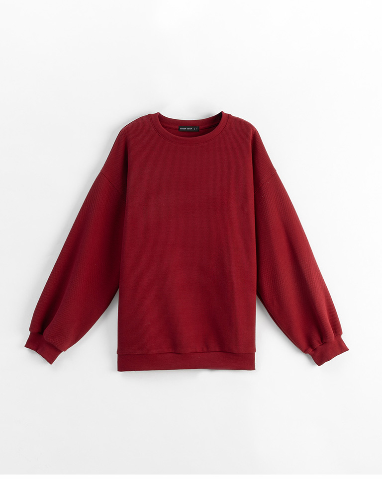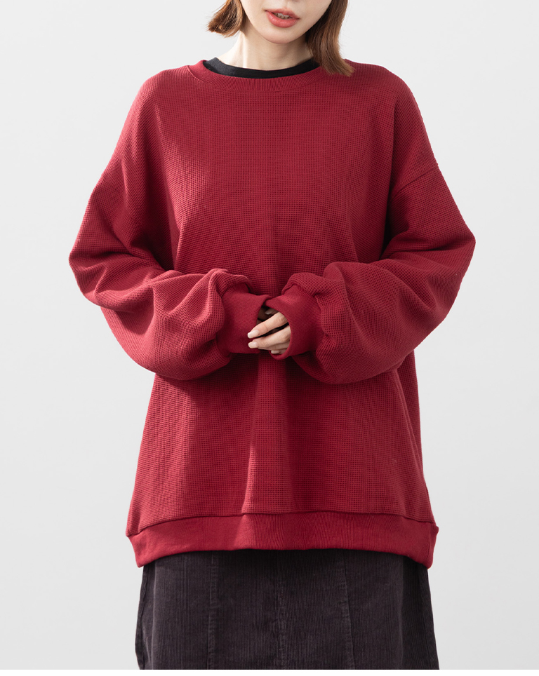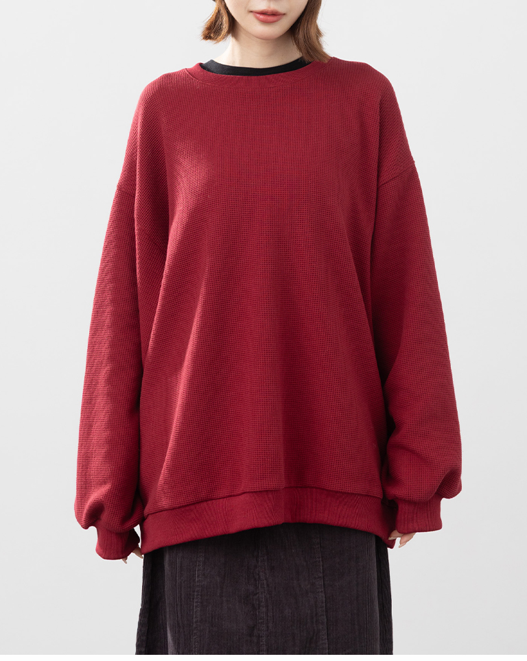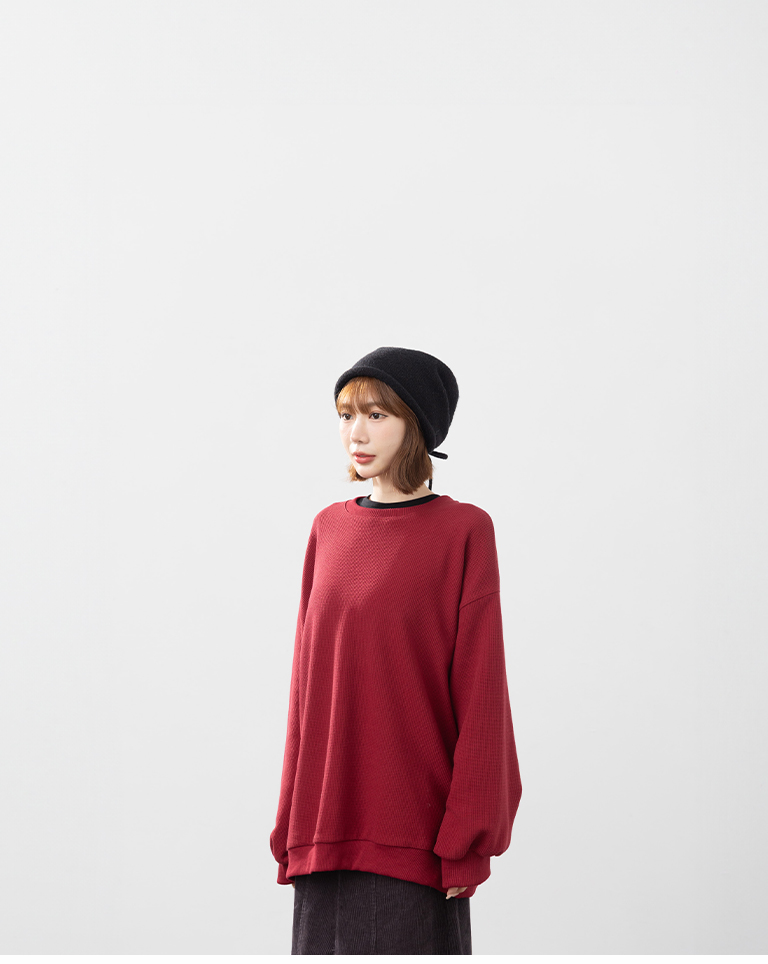 華夫格休閒寬版長袖衛衣-紅
