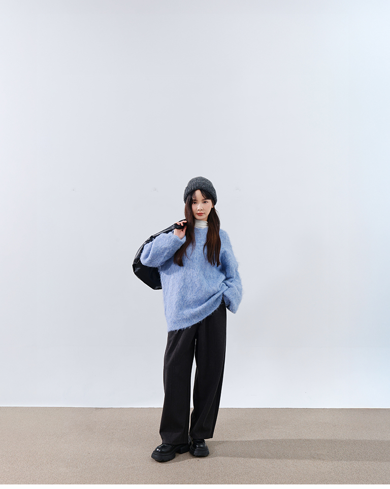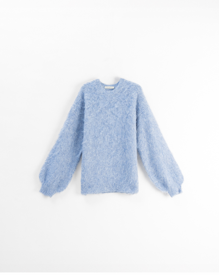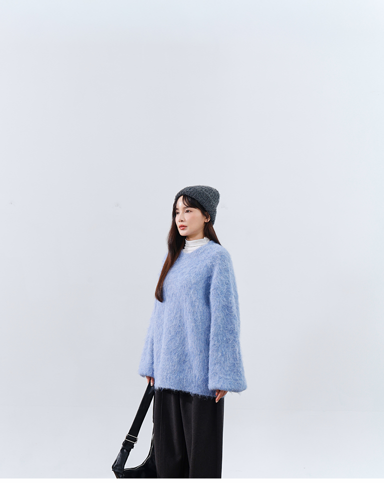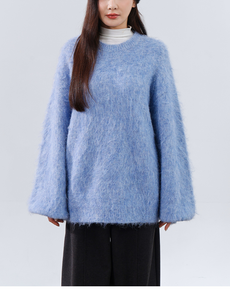 質感花紗絨毛寬版針織毛衣-藍