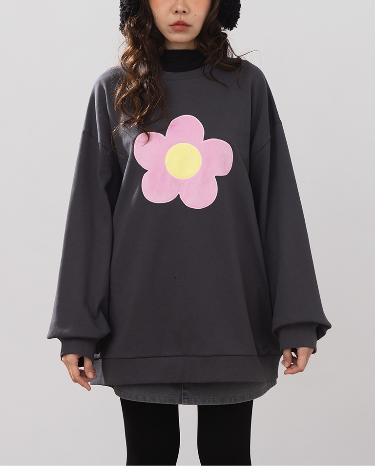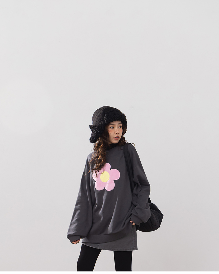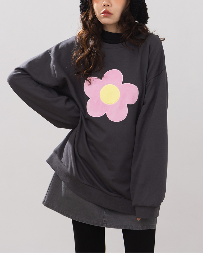 立體磨毛花花長袖衛衣-深灰