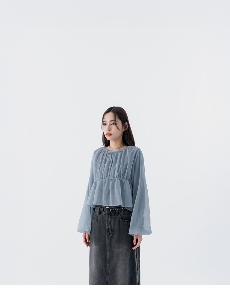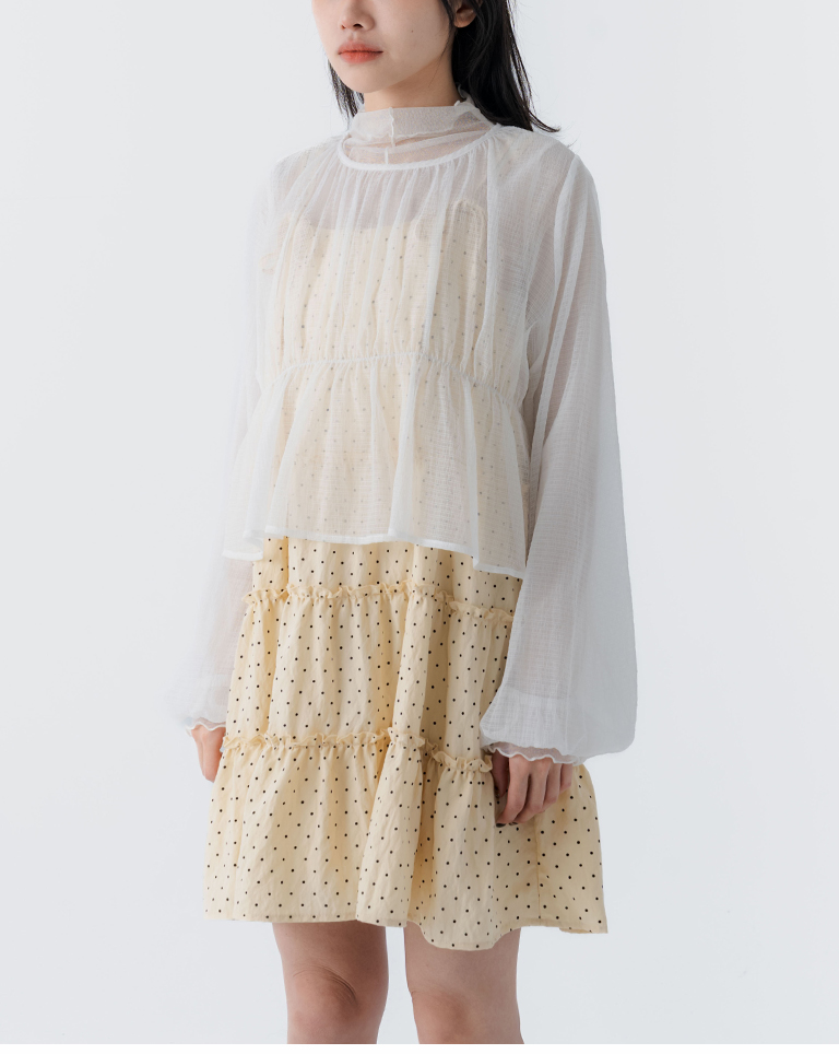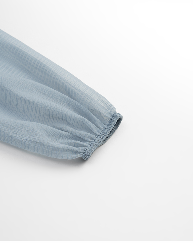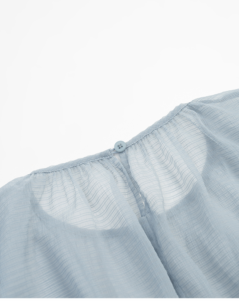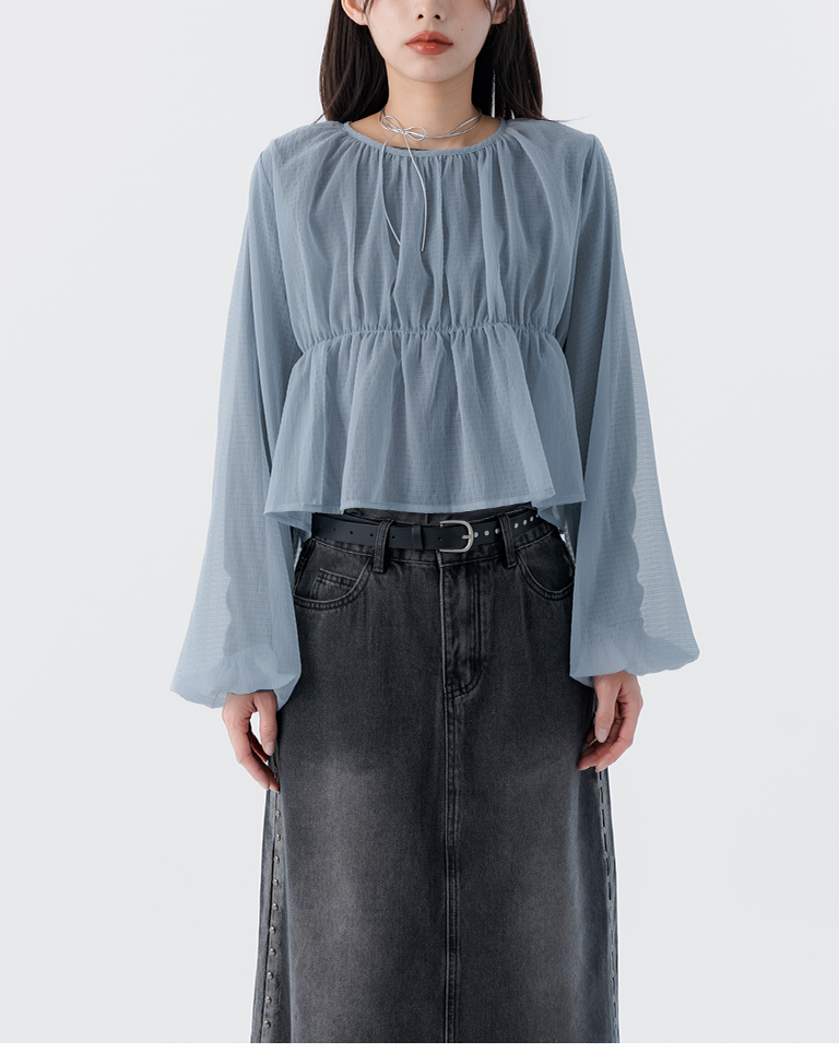 透紗格紋紋理澎袖傘襬罩衫上衣