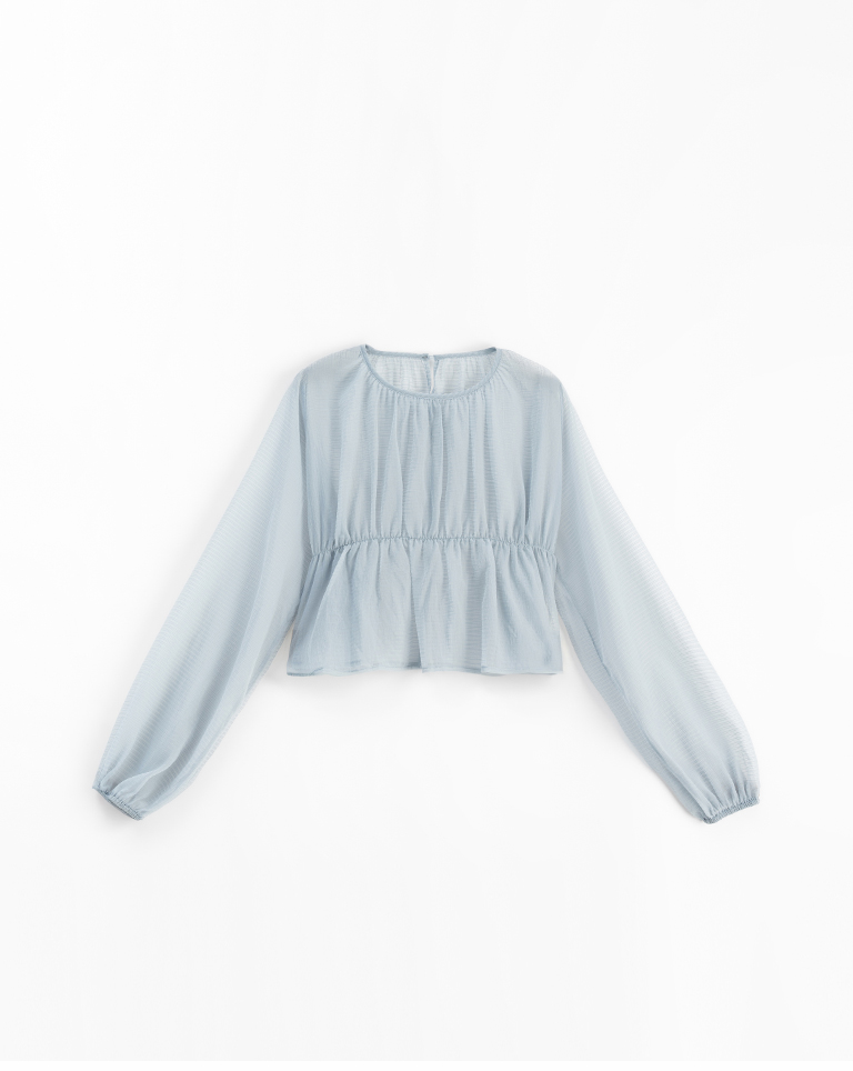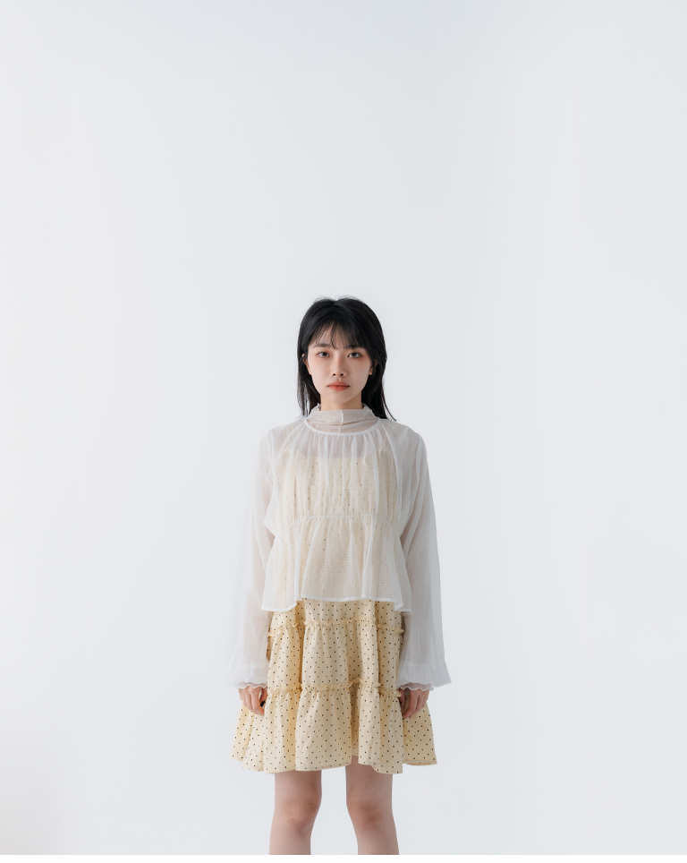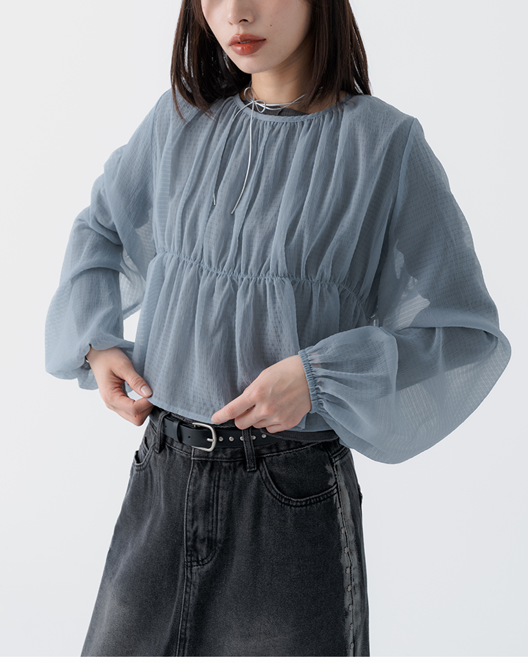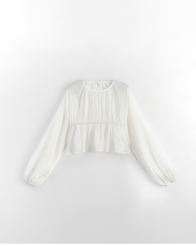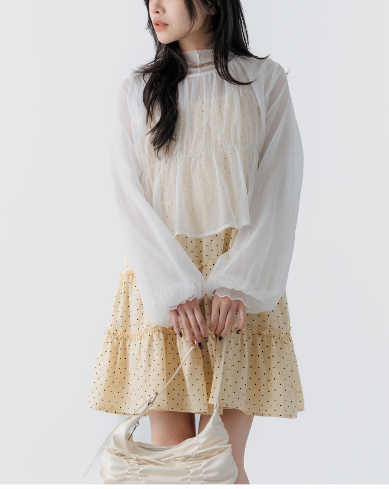 透紗格紋紋理澎袖傘襬罩衫上衣