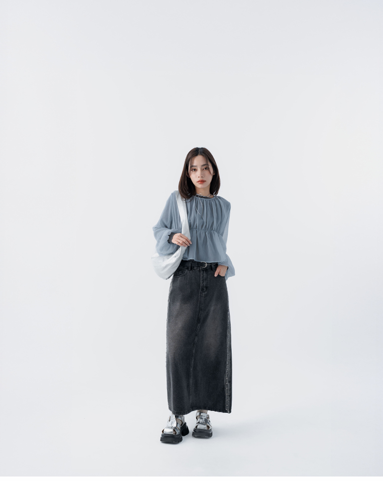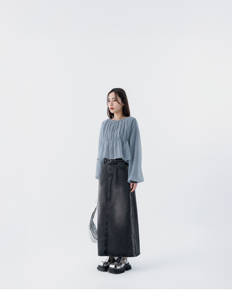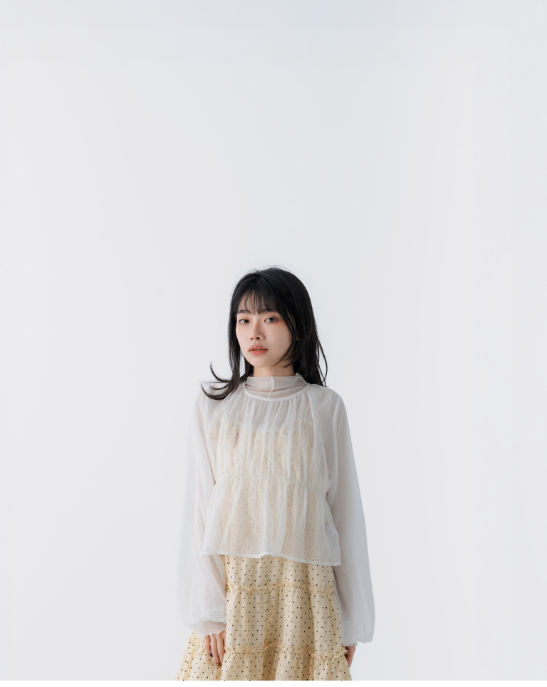 S~L身形實測!分尺寸皺皺木耳邊透膚高領長袖上衣