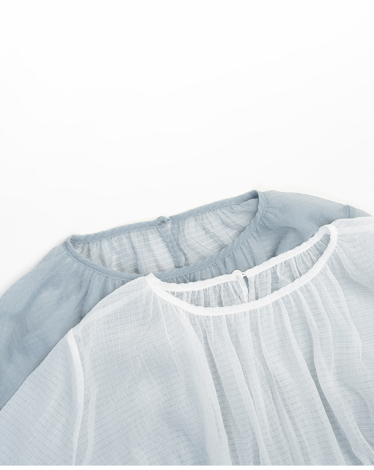 透紗格紋紋理澎袖傘襬罩衫上衣 兩色售