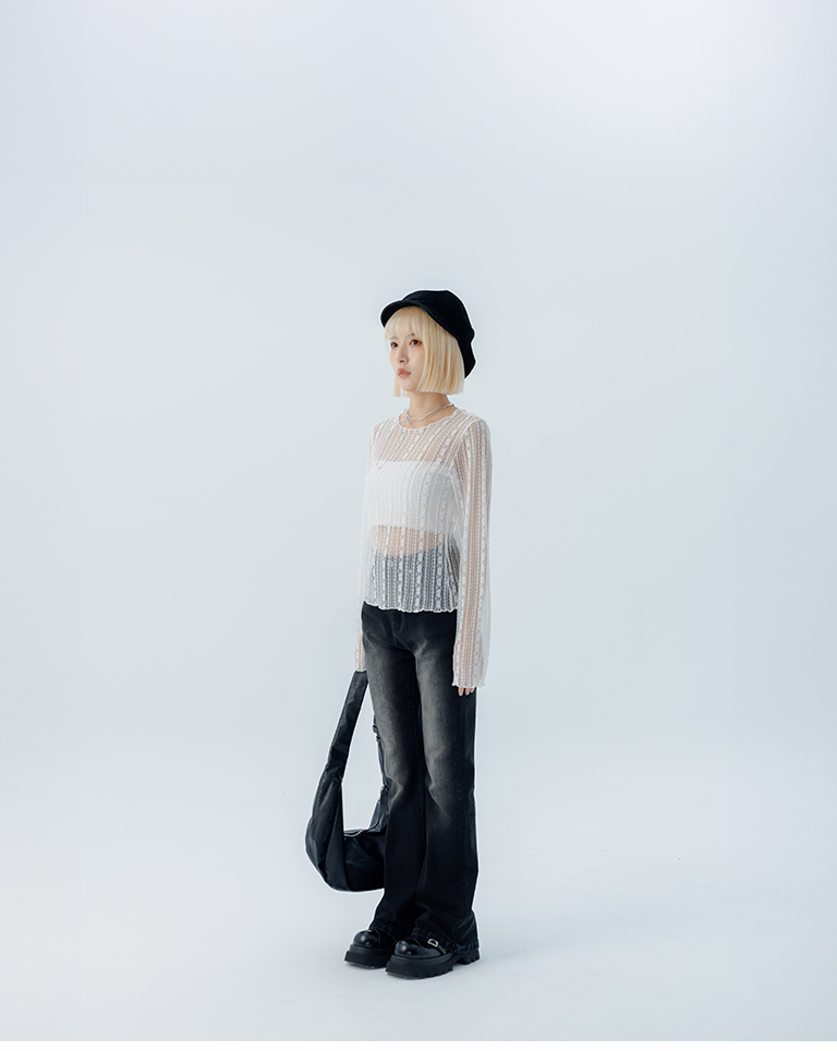 S~L身形實測!分尺寸皺皺木耳邊透膚高領長袖上衣