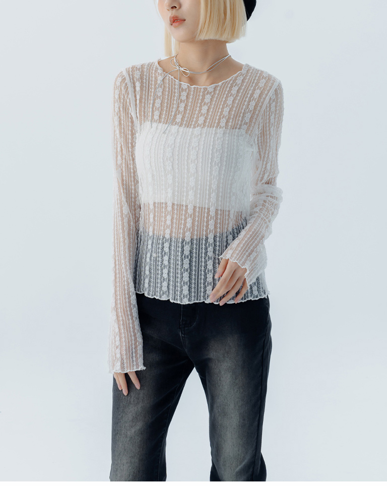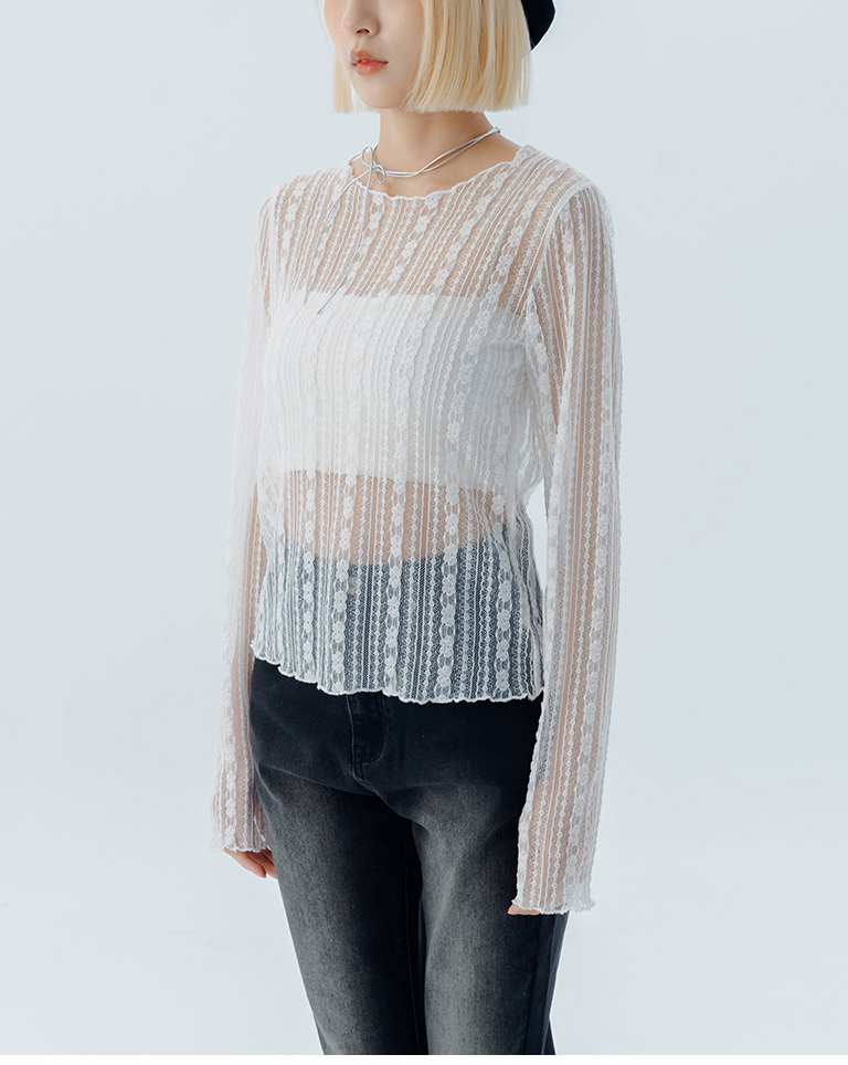 蕾絲透膚木耳邊設計上衣-白 S/M