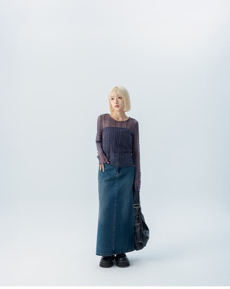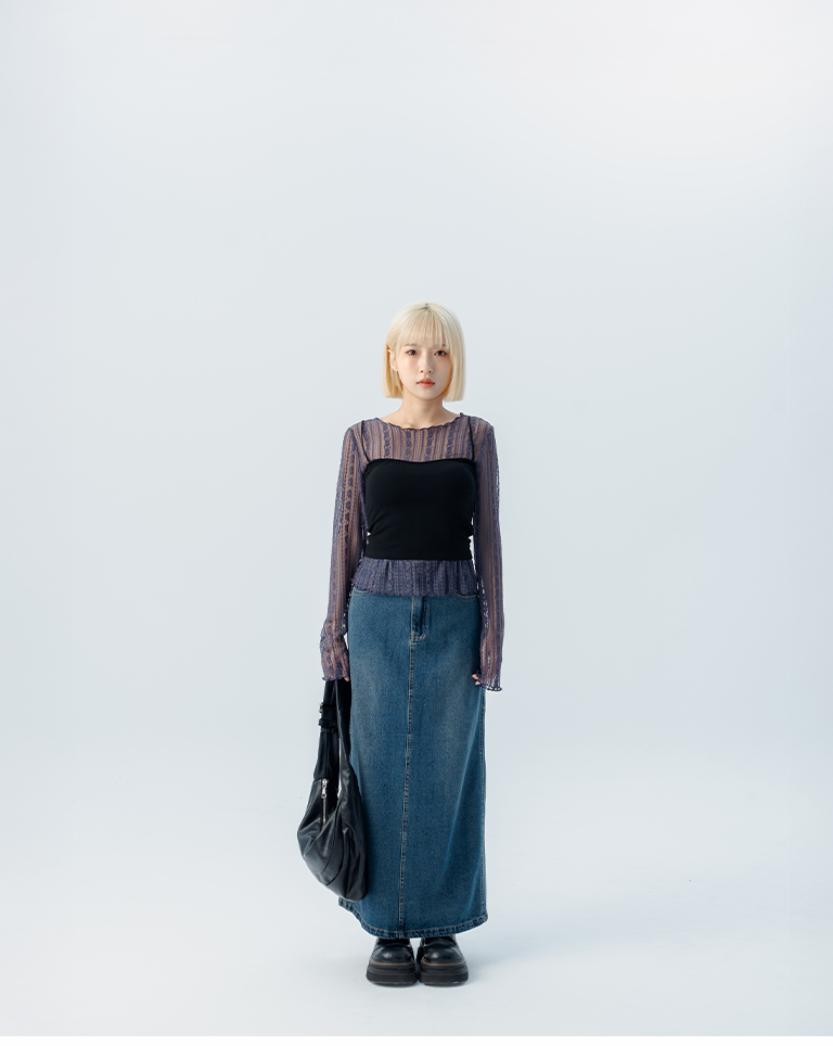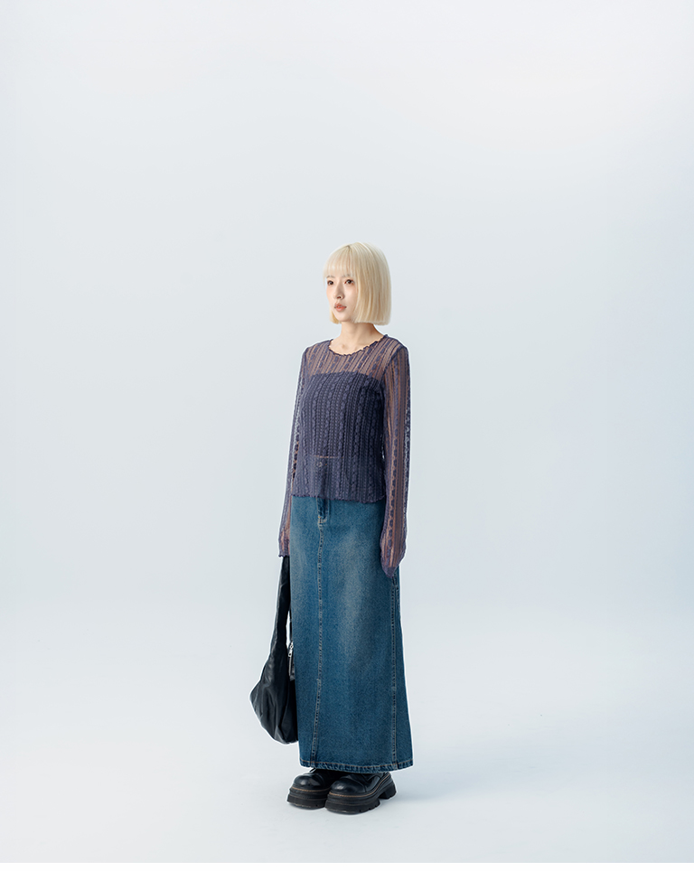 S~L身形實測!分尺寸皺皺木耳邊透膚高領長袖上衣
