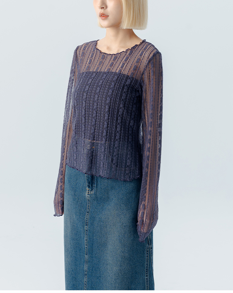 蕾絲透膚木耳邊設計上衣-紫 S/M