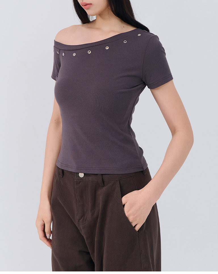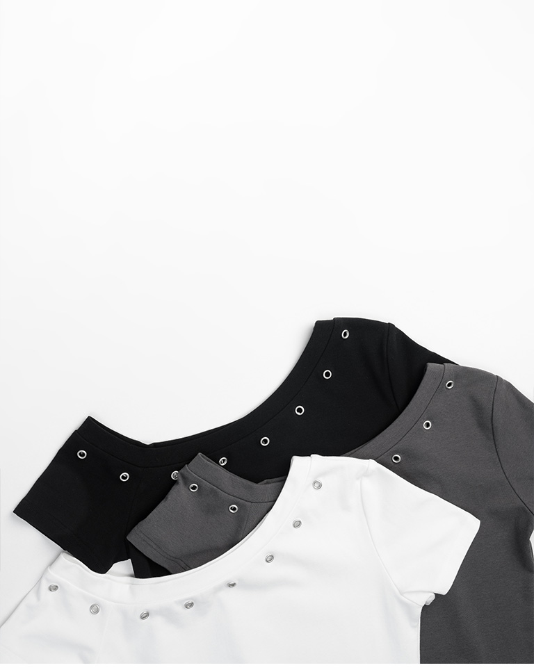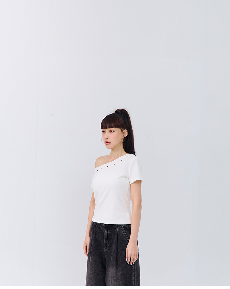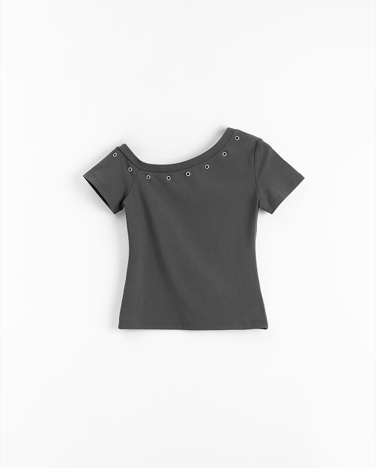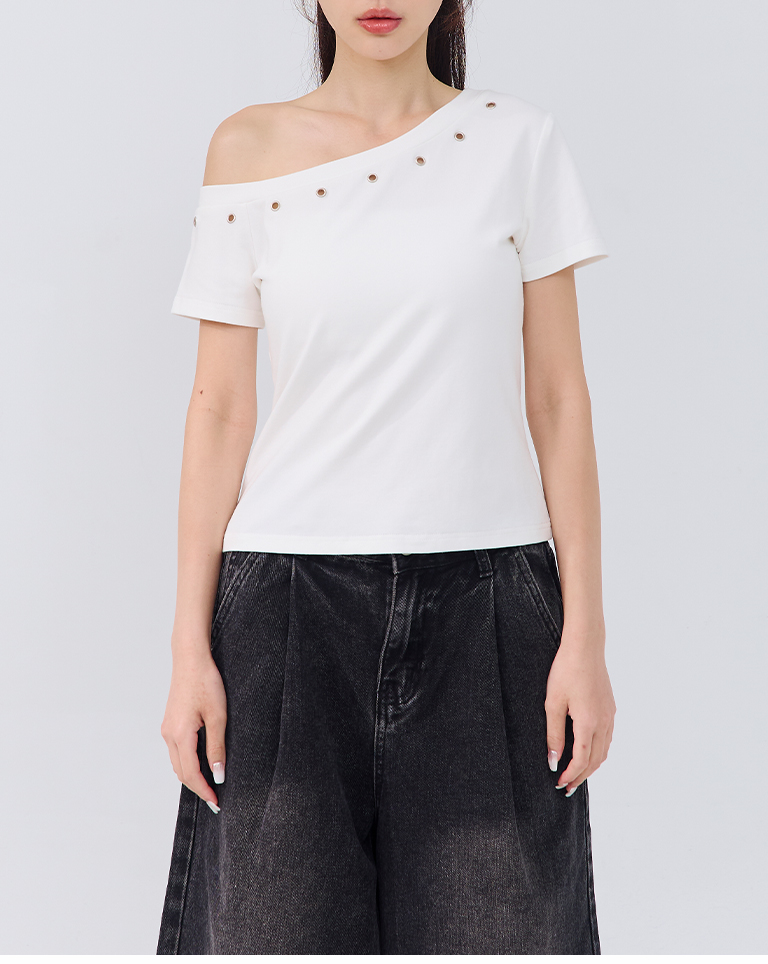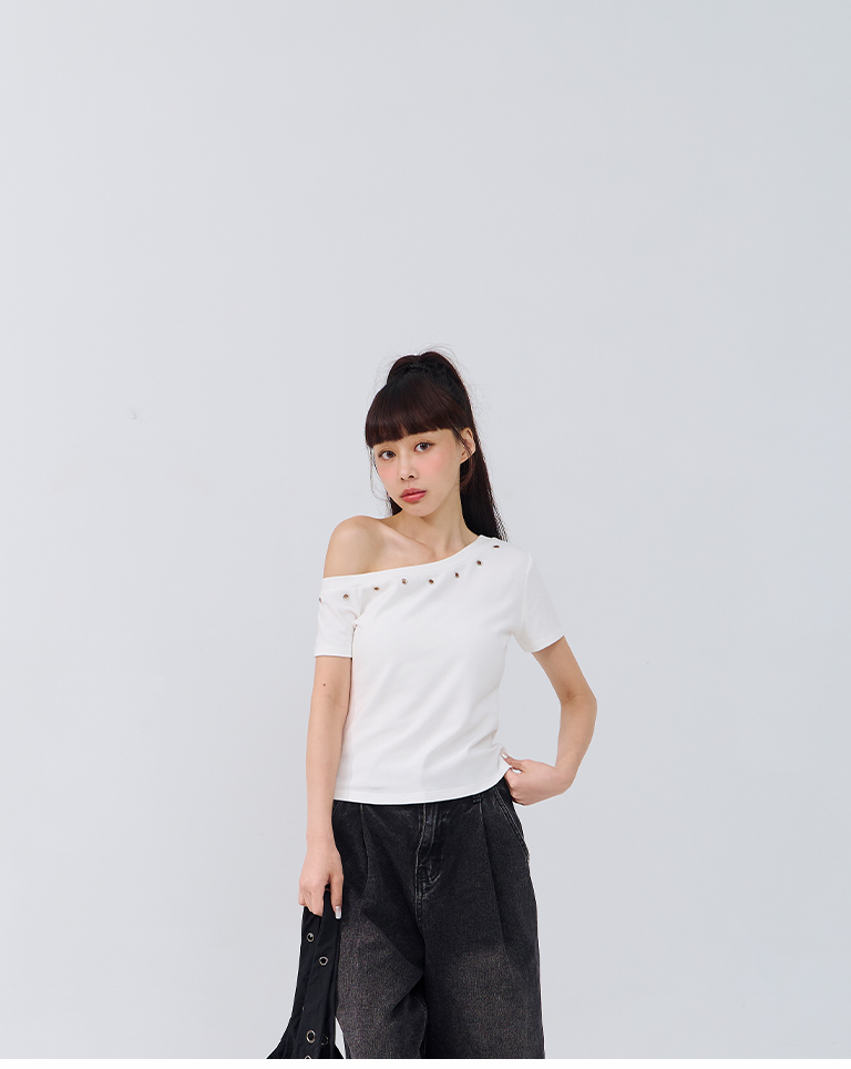 金屬釘釦設計斜肩上衣 三色售