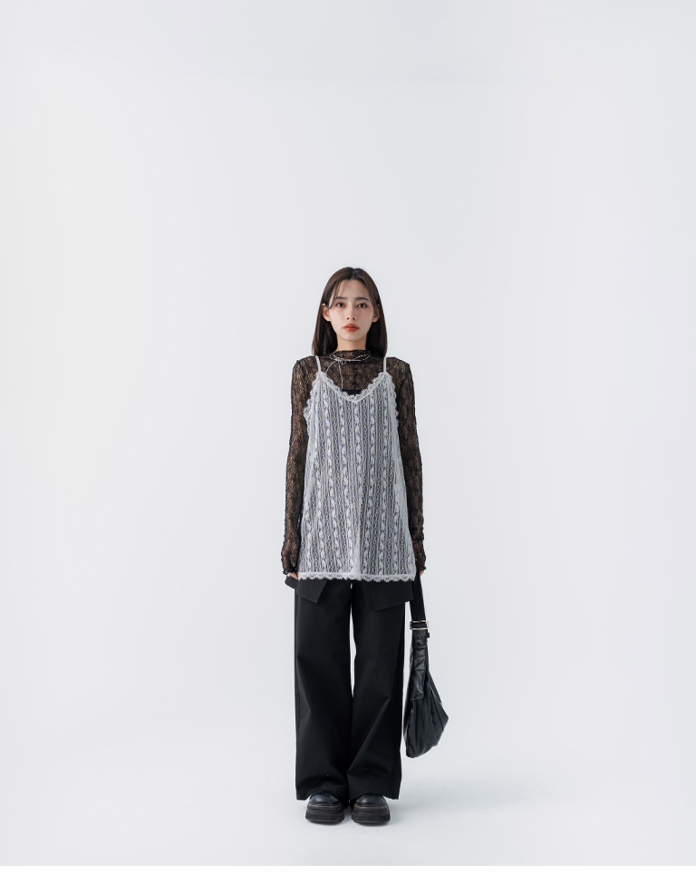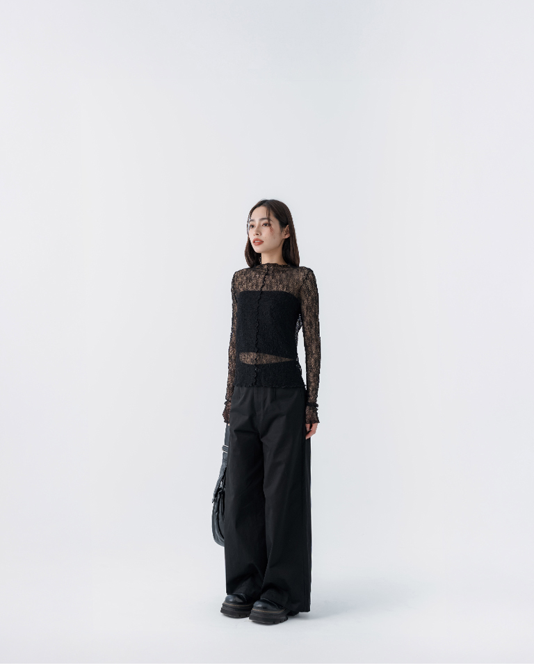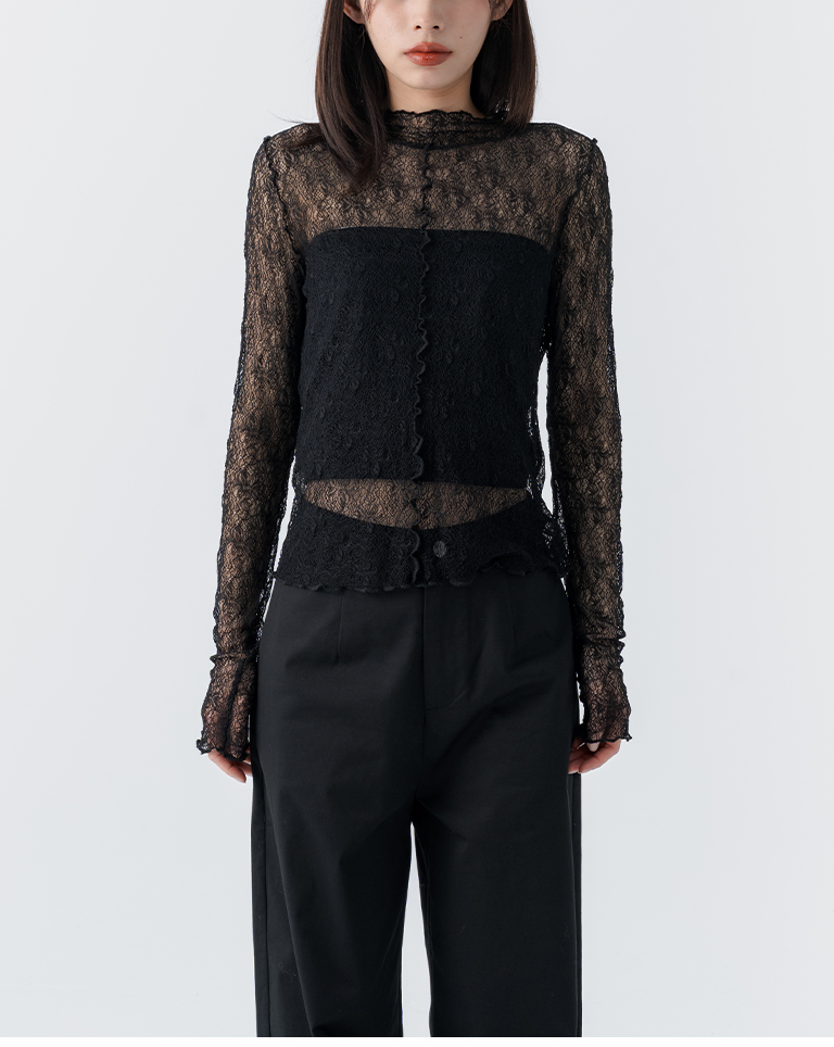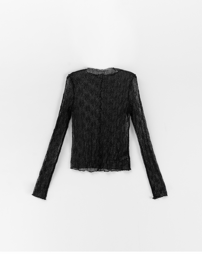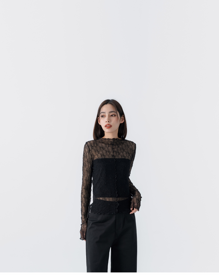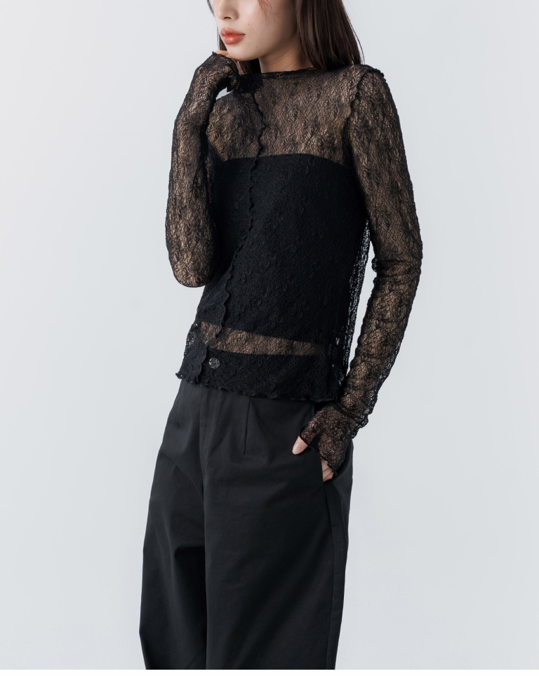 蕾絲緹花透膚木耳邊長袖上衣-黑