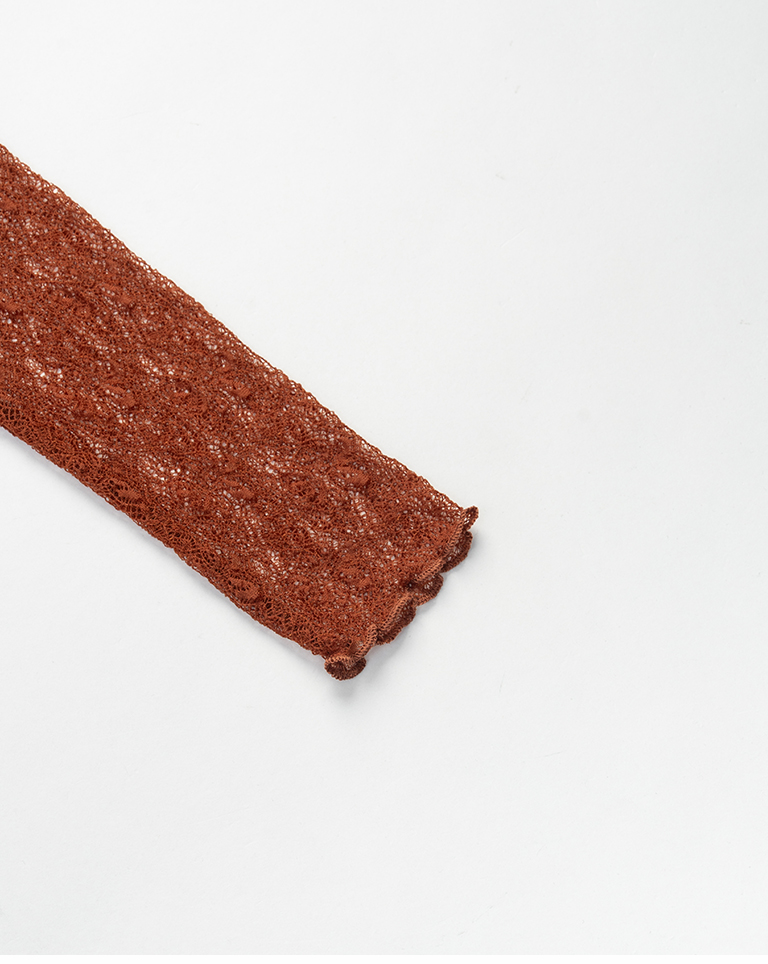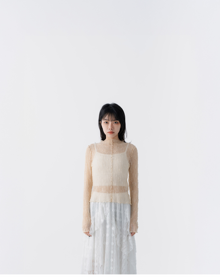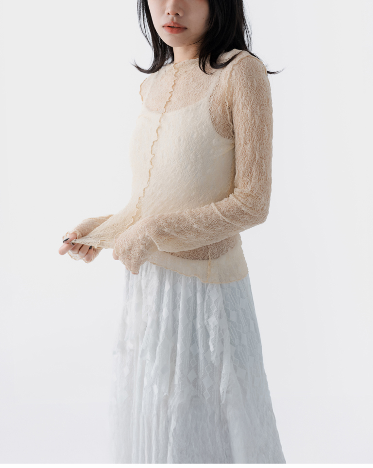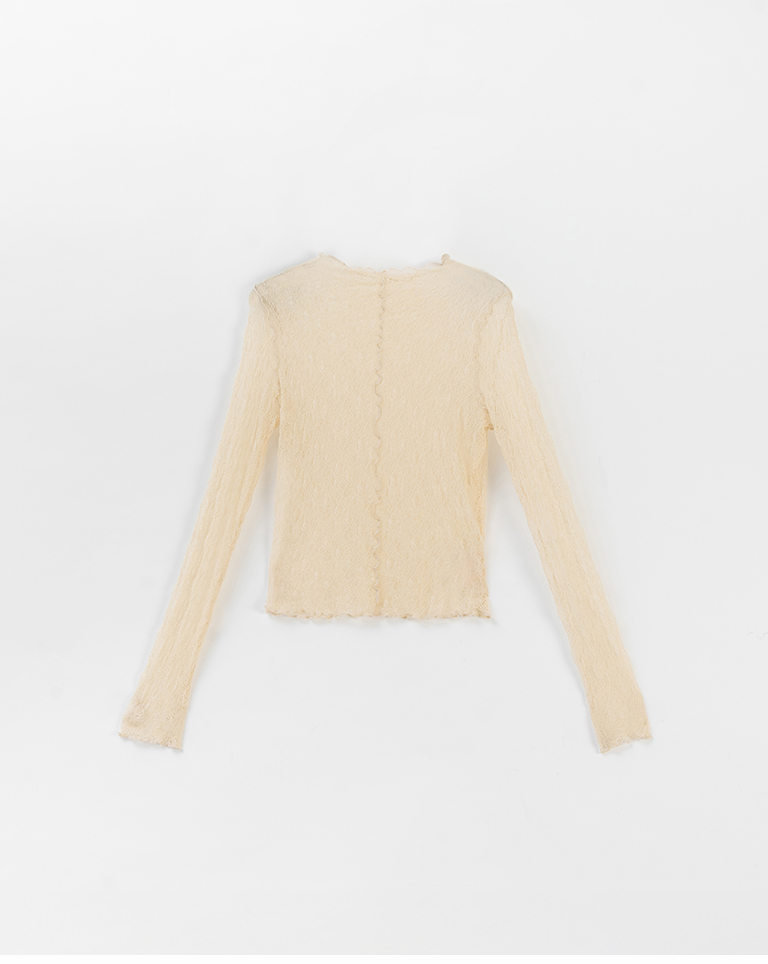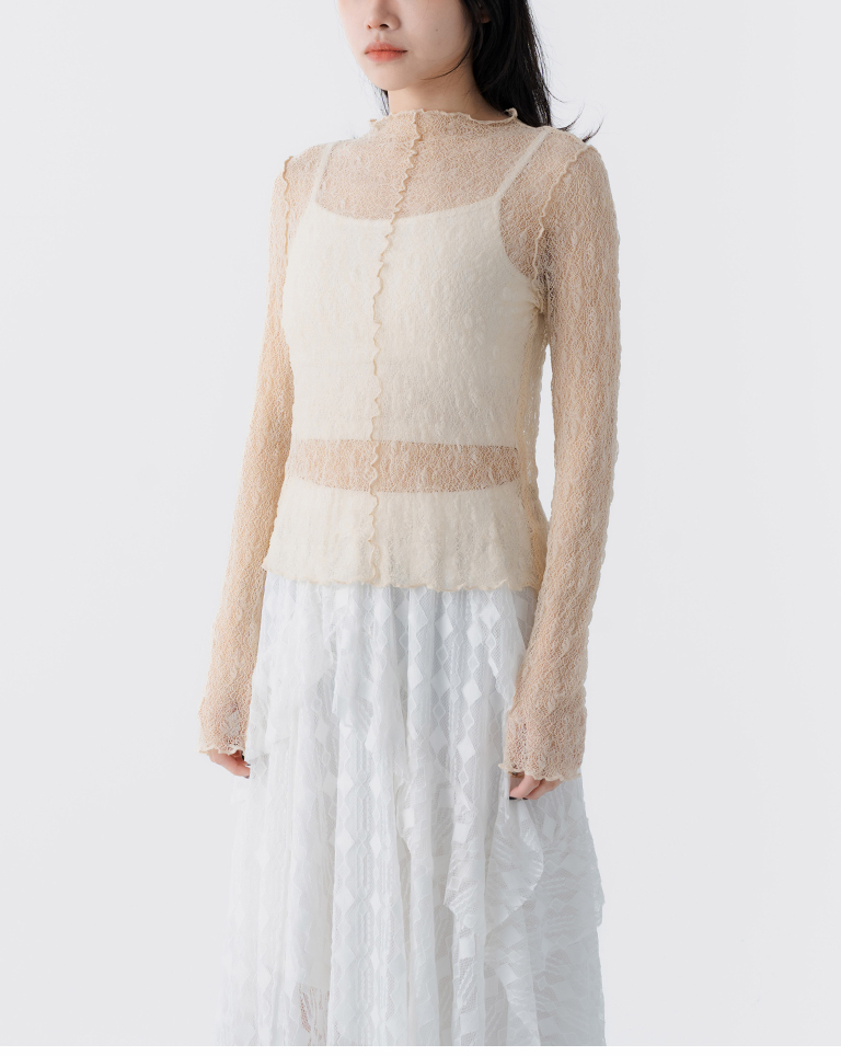 蕾絲緹花透膚木耳邊長袖上衣-杏
