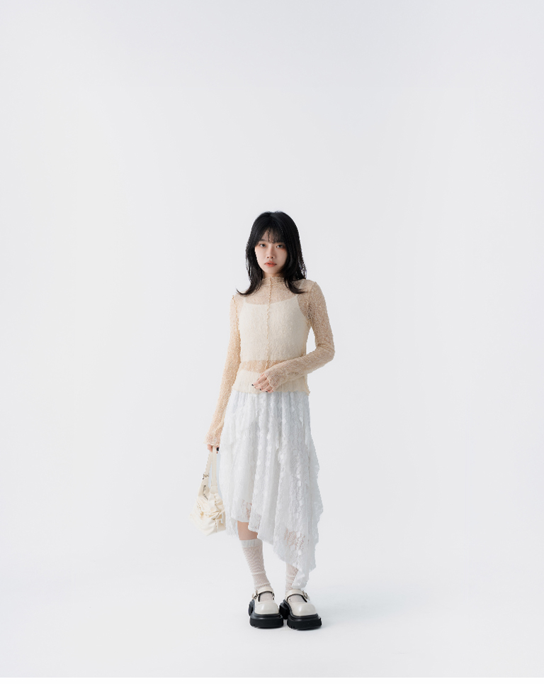 S~L身形實測!分尺寸皺皺木耳邊透膚高領長袖上衣