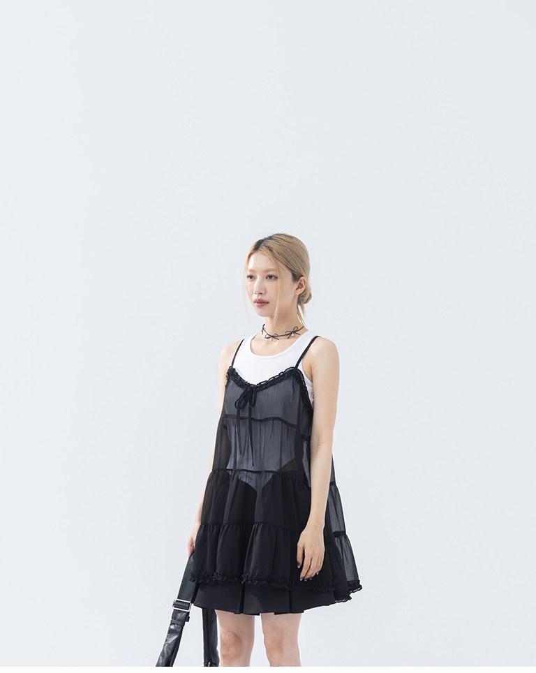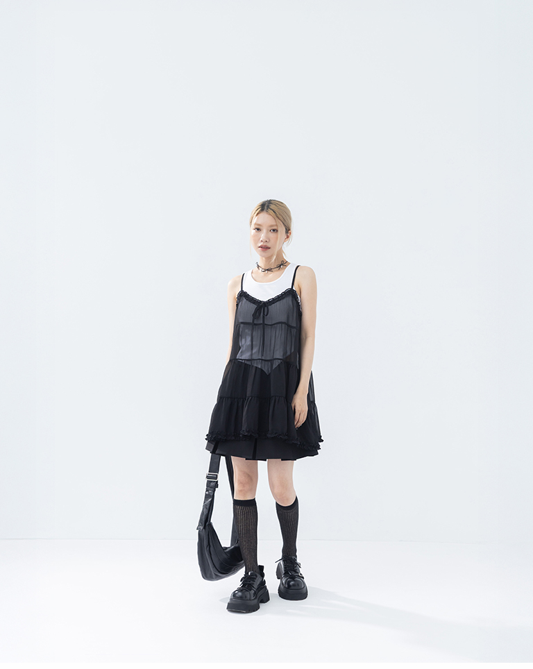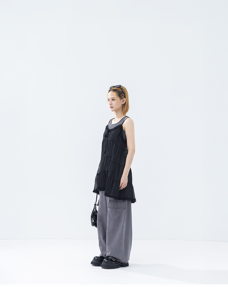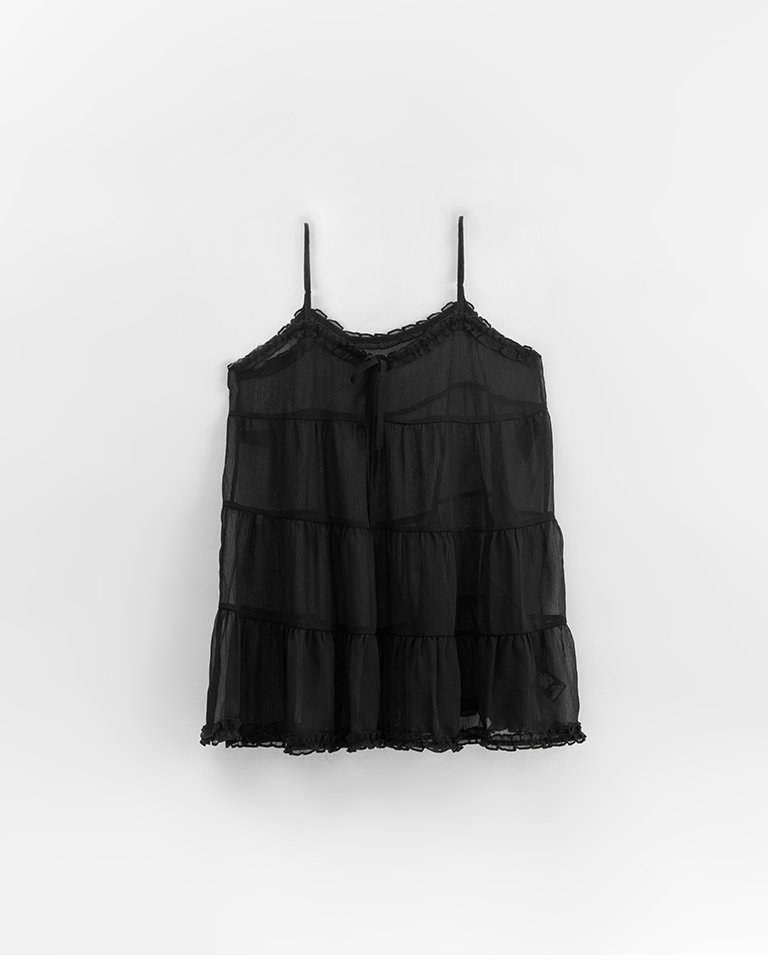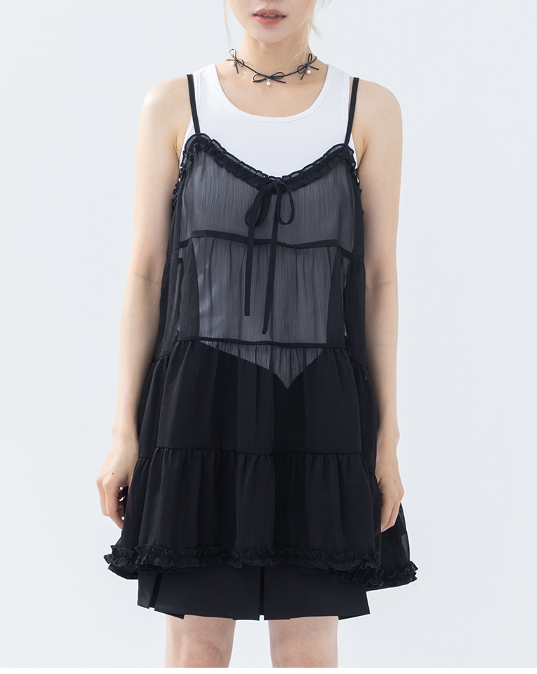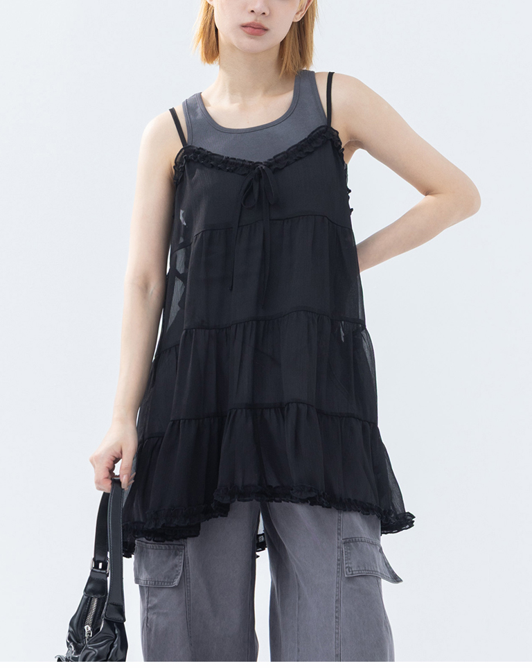 V領荷葉透紗蛋糕細肩罩衫背心-黑