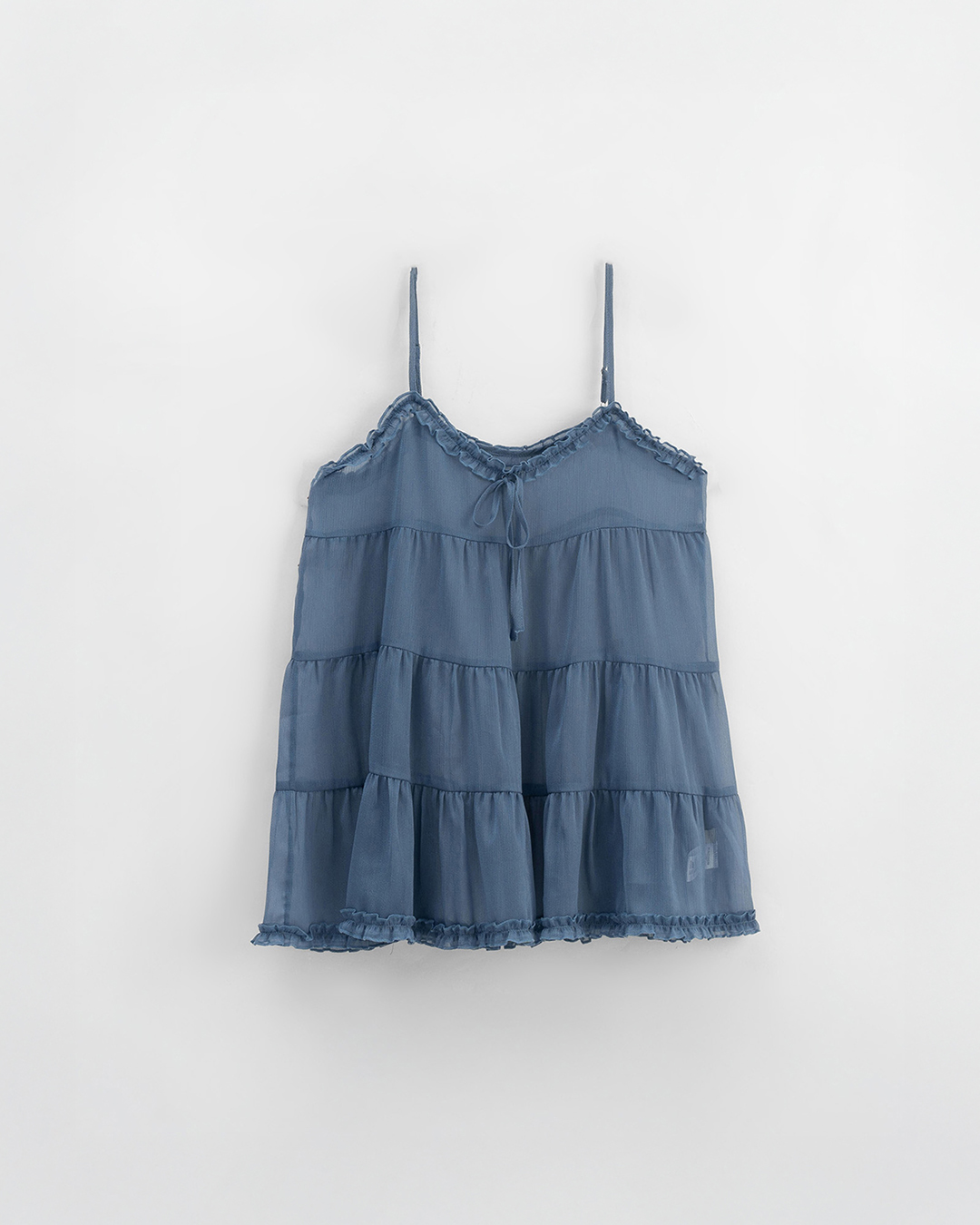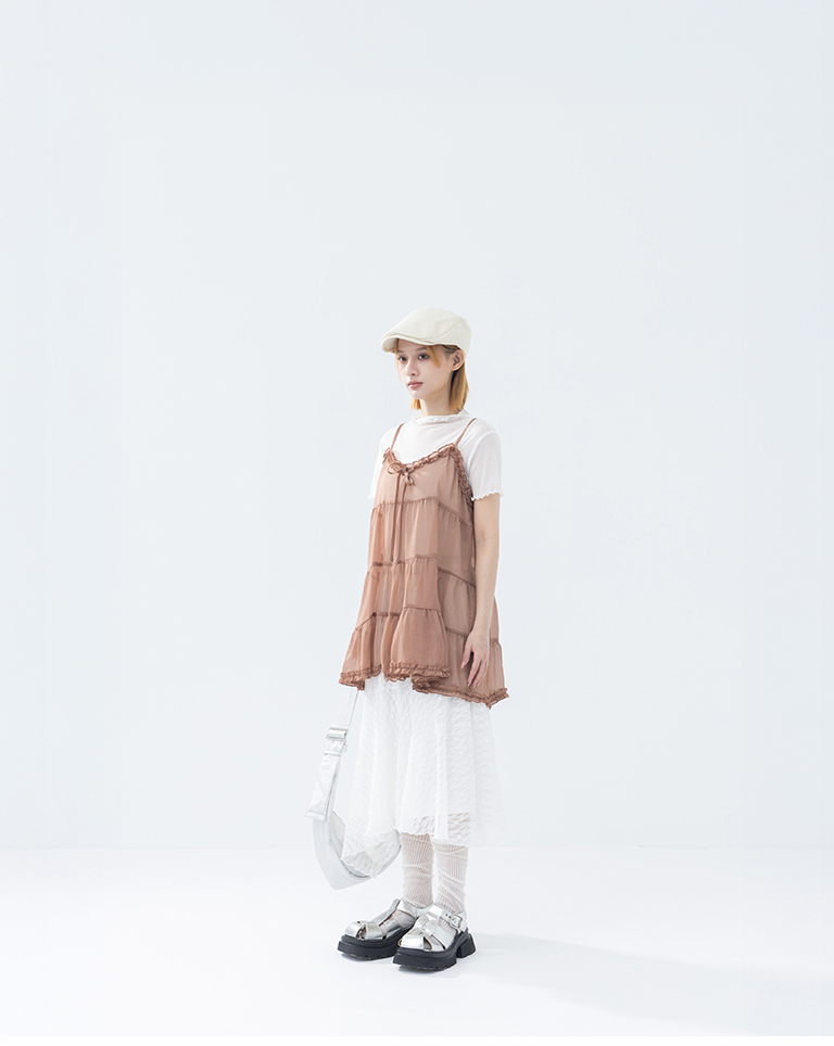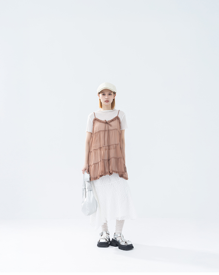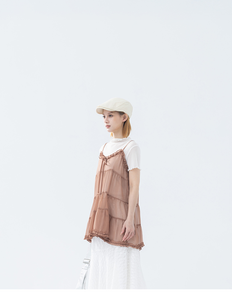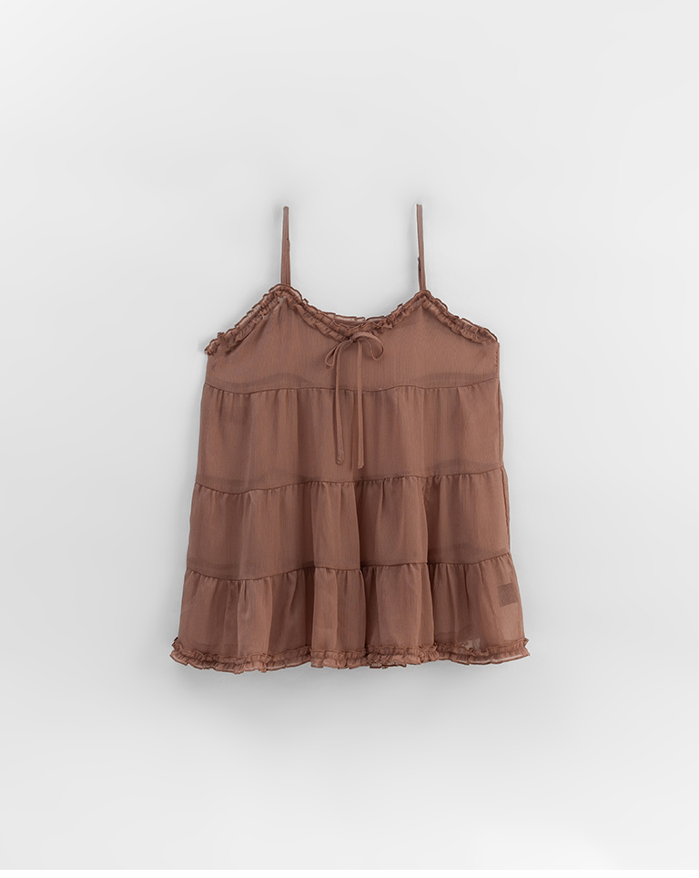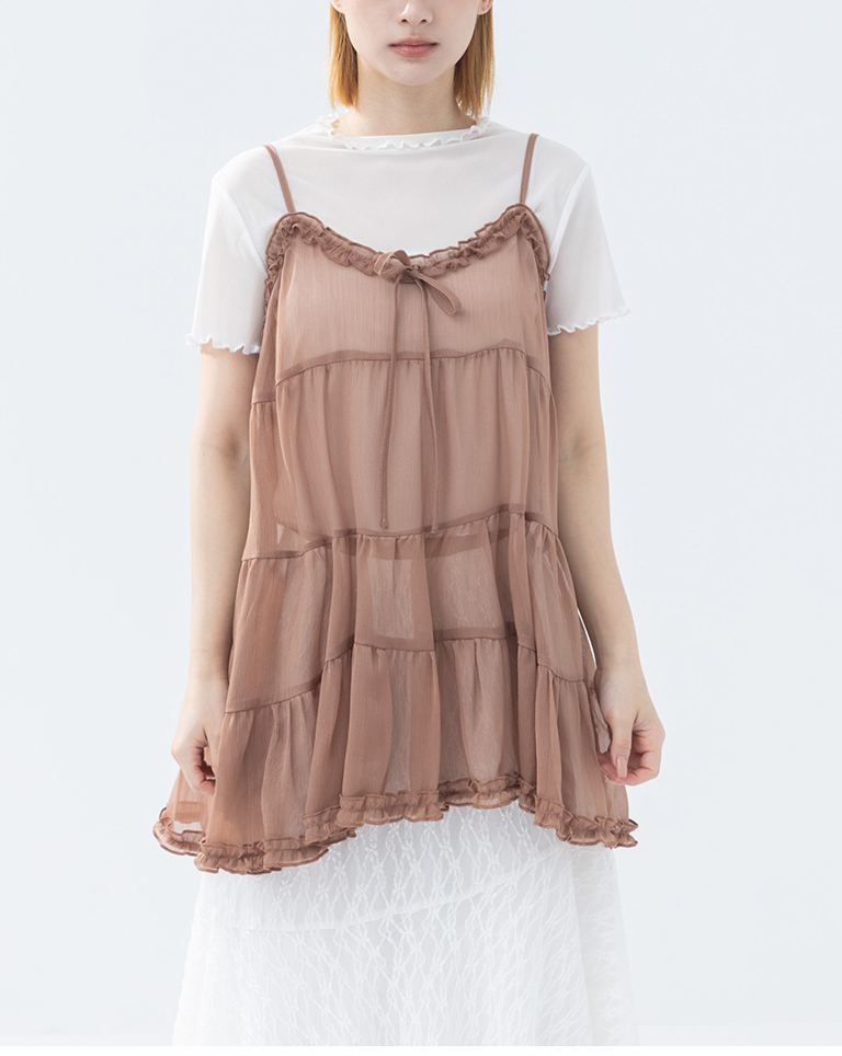 V領荷葉透紗蛋糕細肩罩衫背心-咖