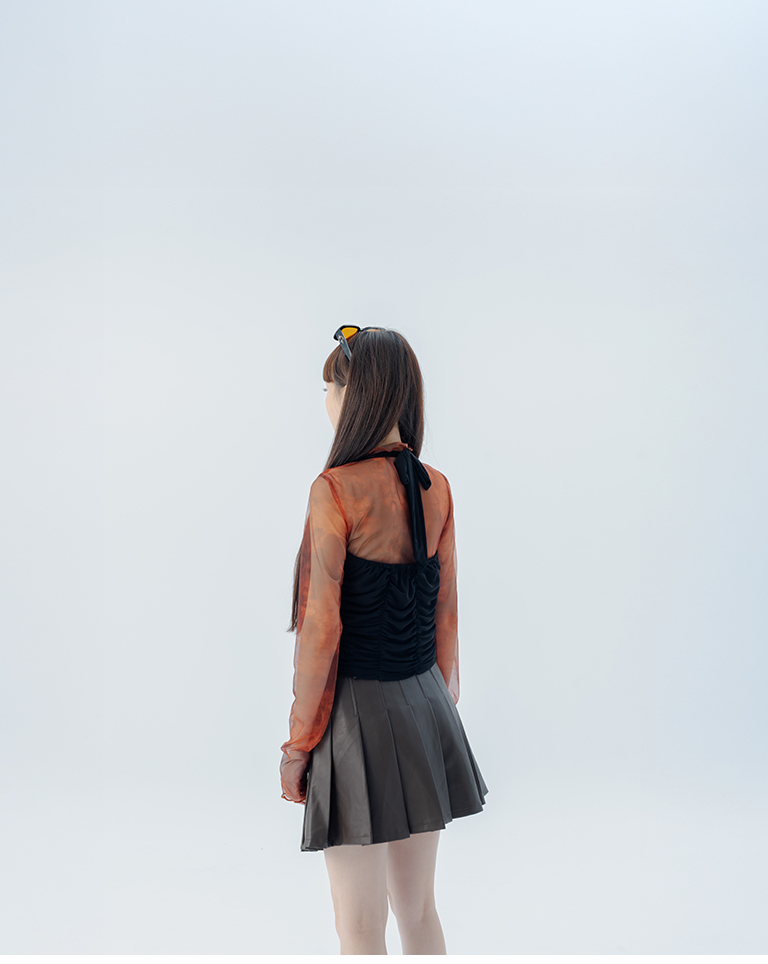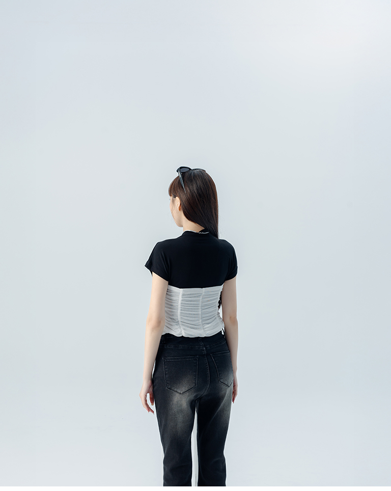 S~L身形實測!分尺寸皺皺木耳邊透膚高領長袖上衣