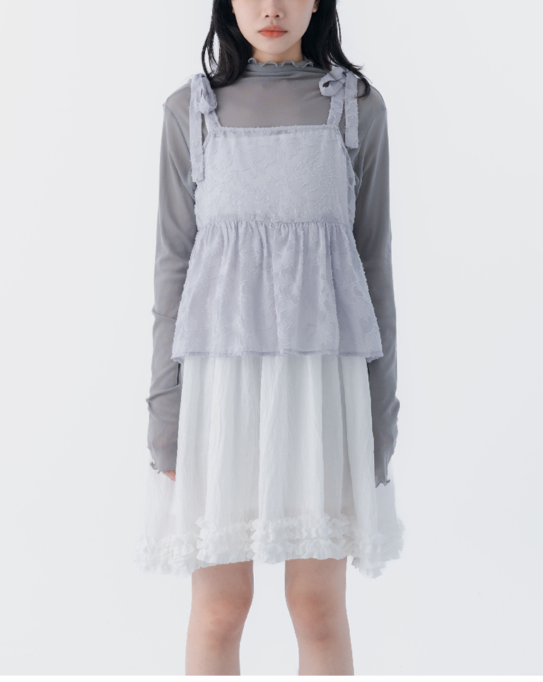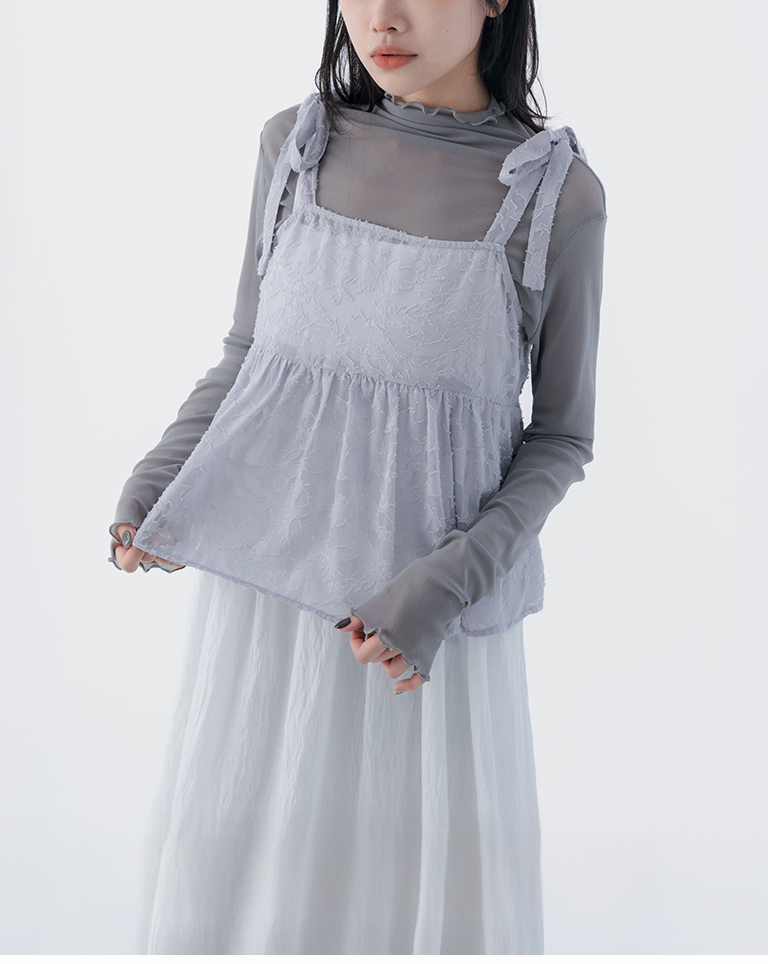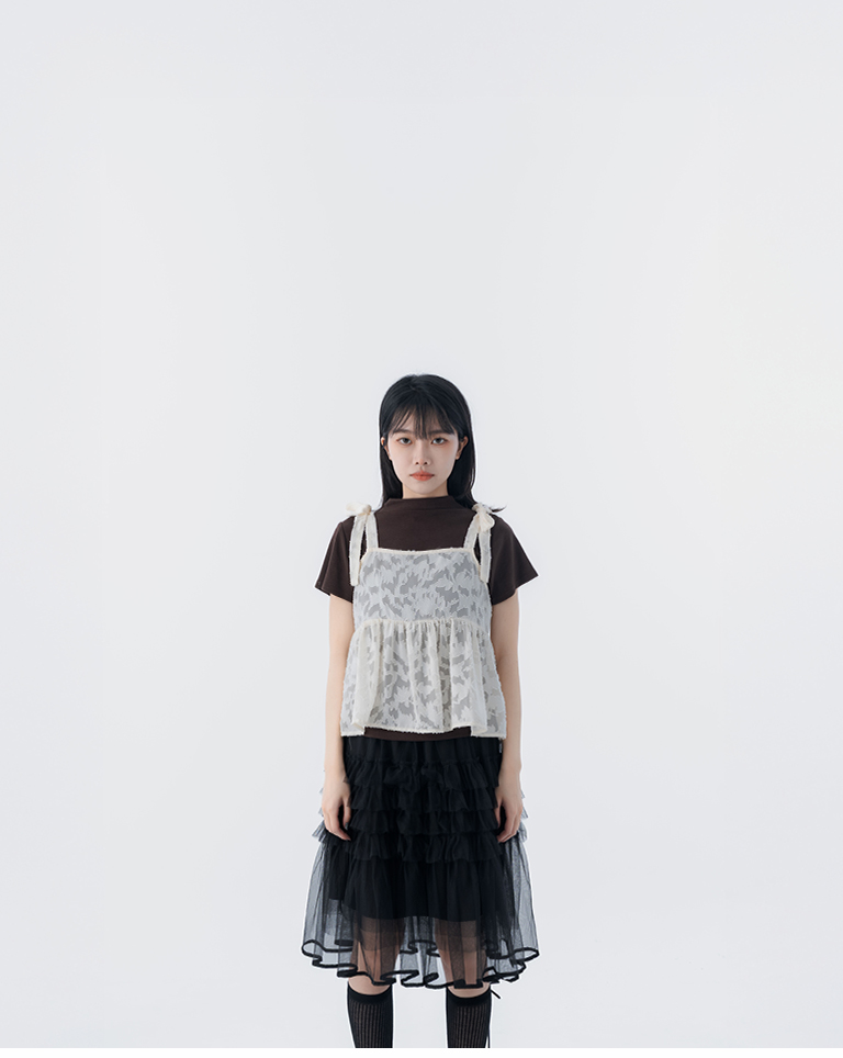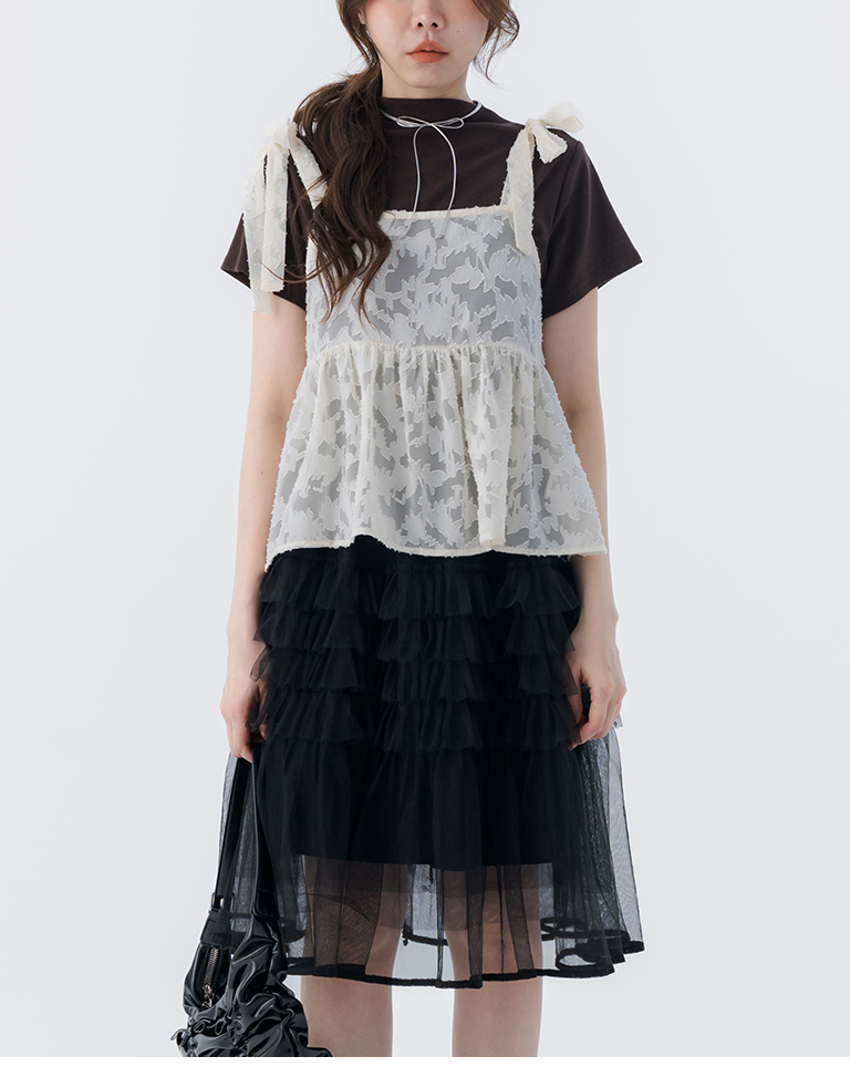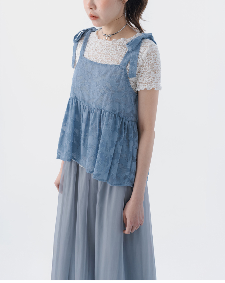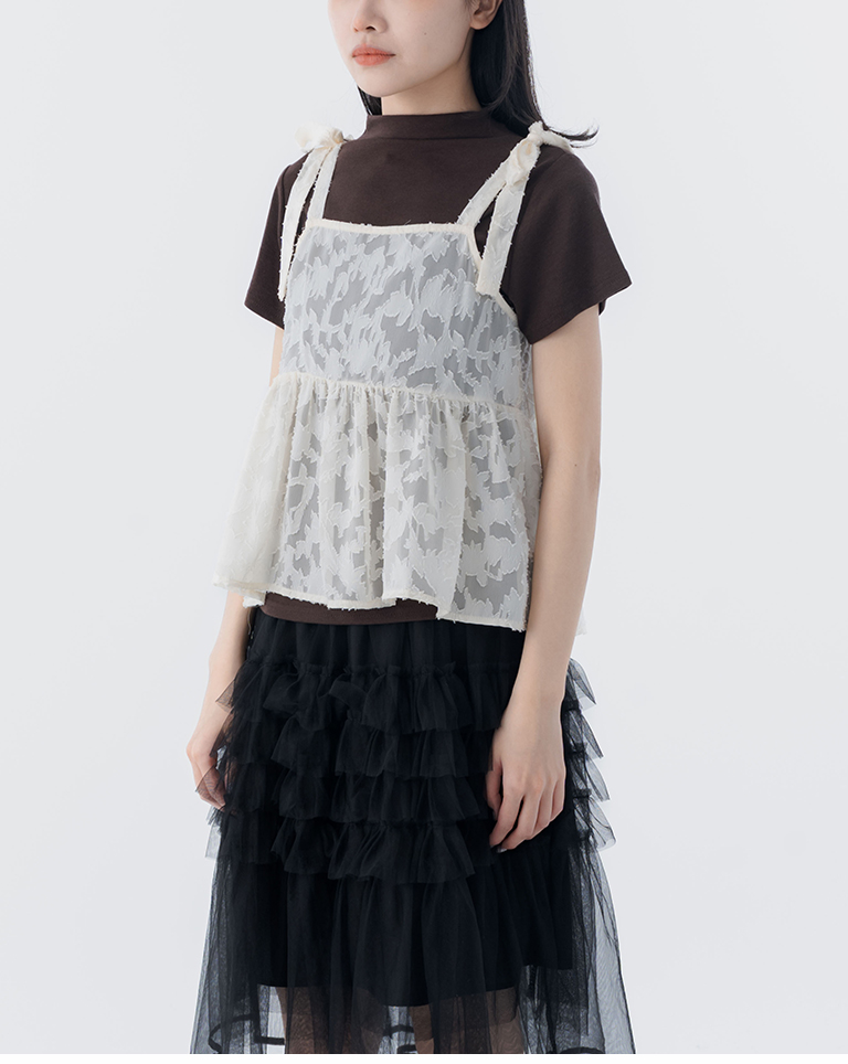 緹花透膚肩綁帶傘擺罩衫背心