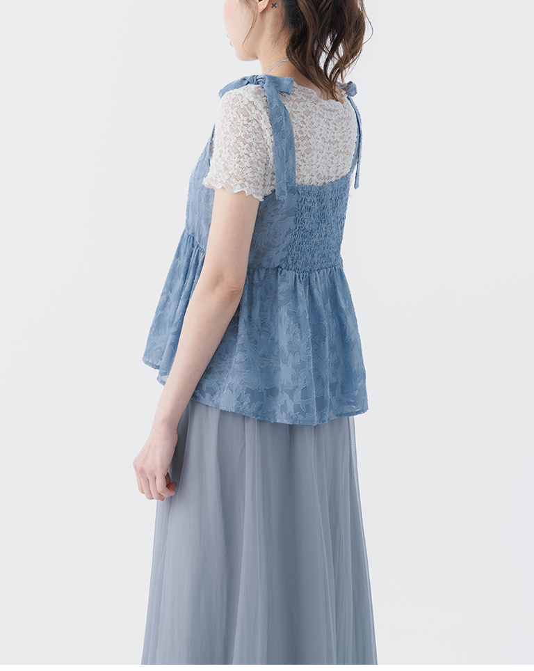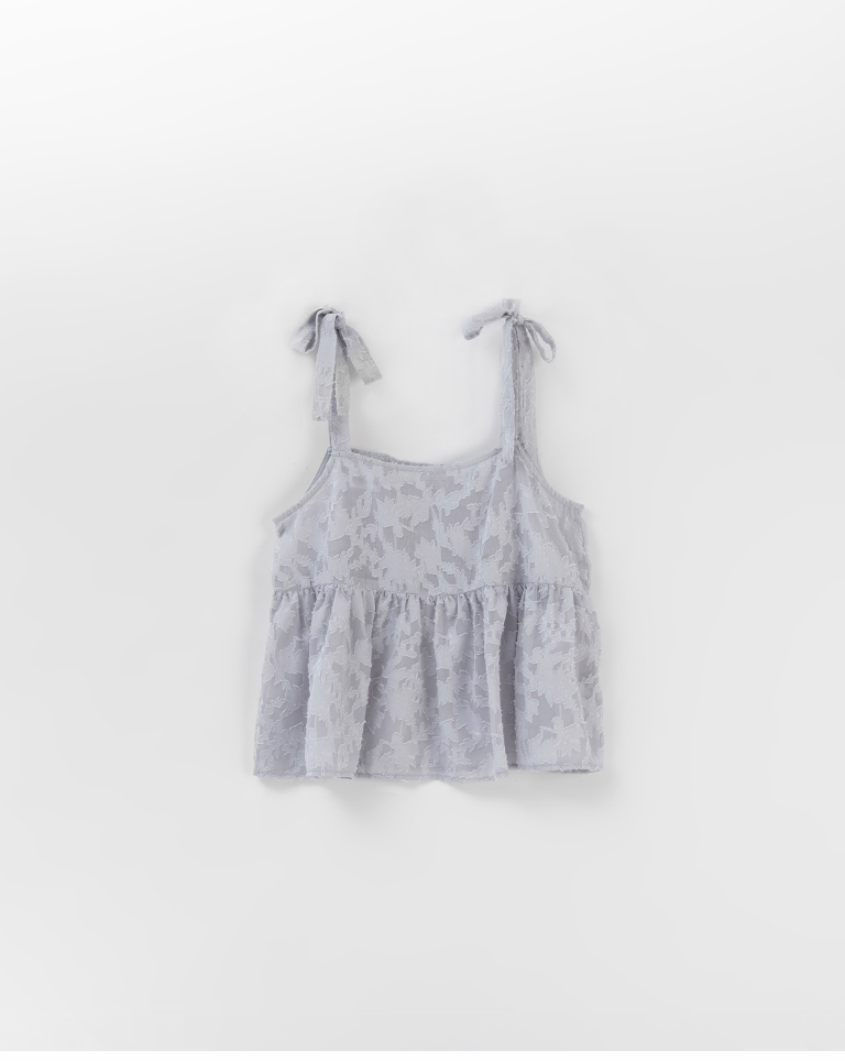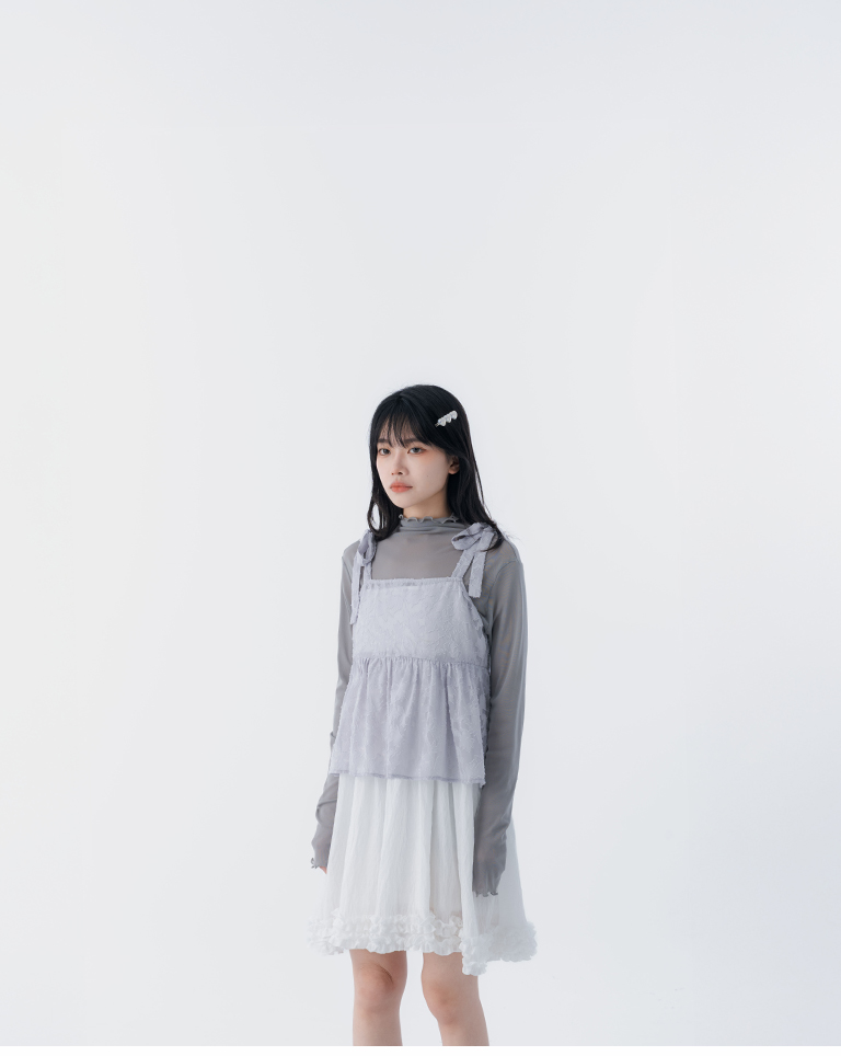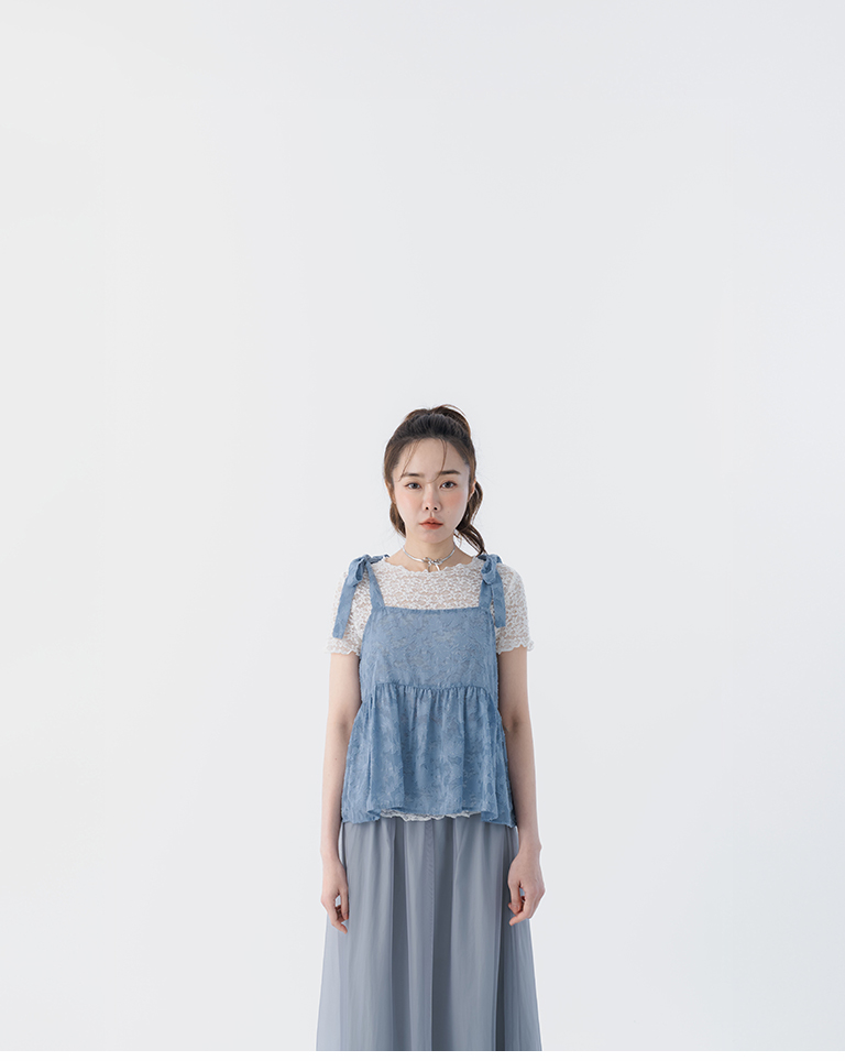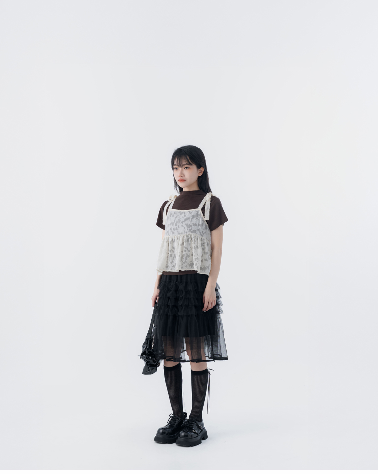 緹花透膚肩綁帶傘擺罩衫背心
