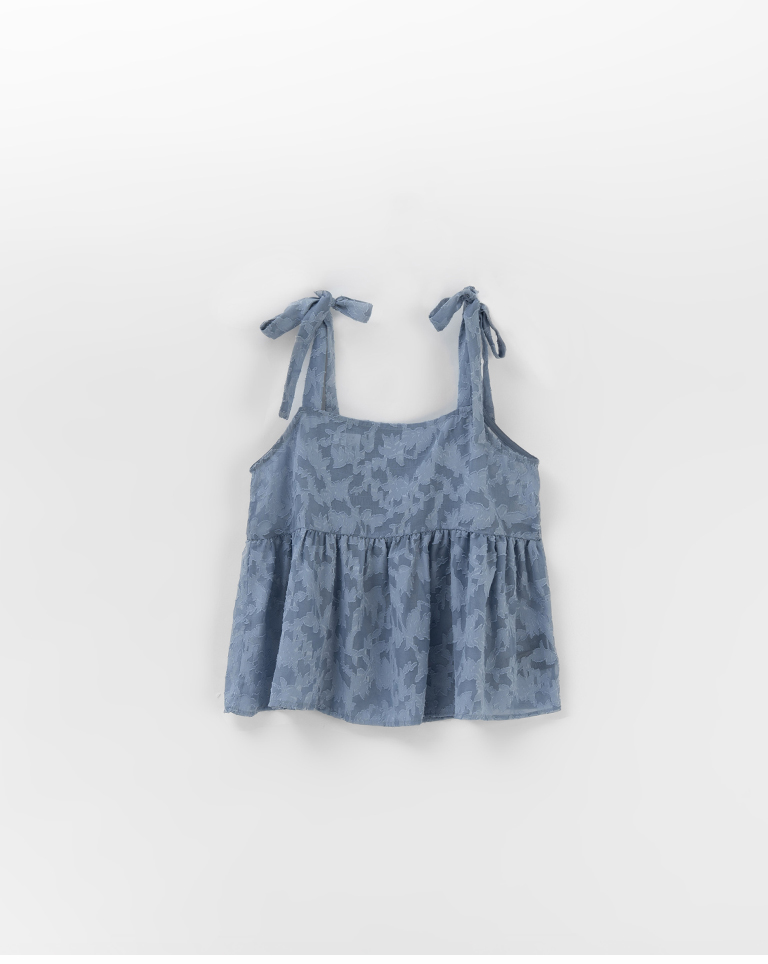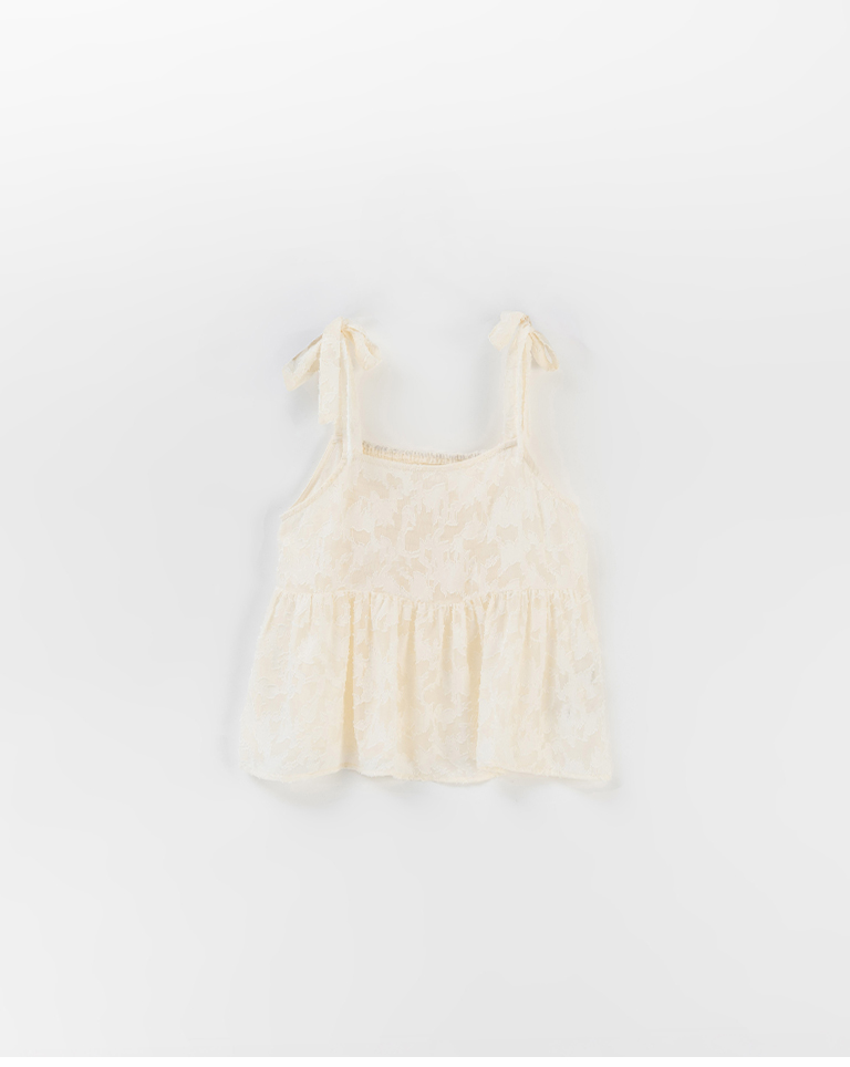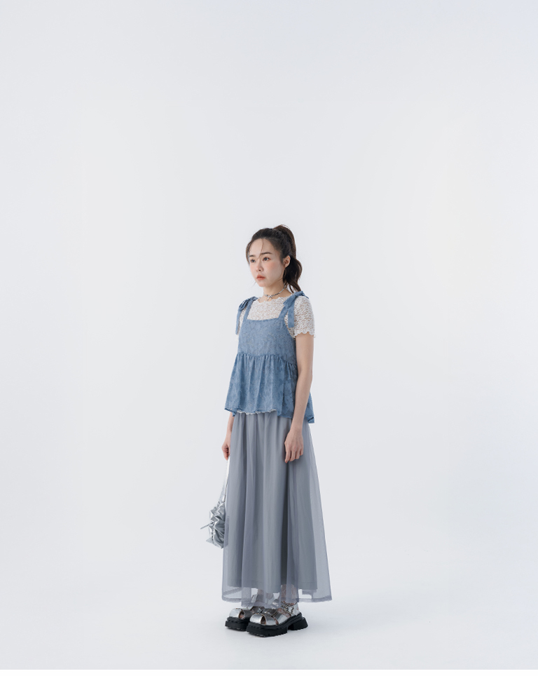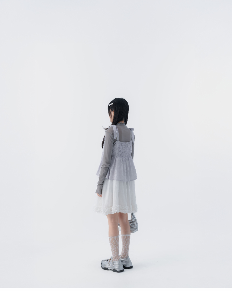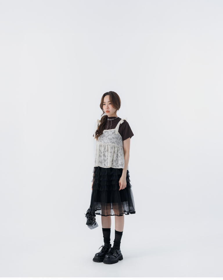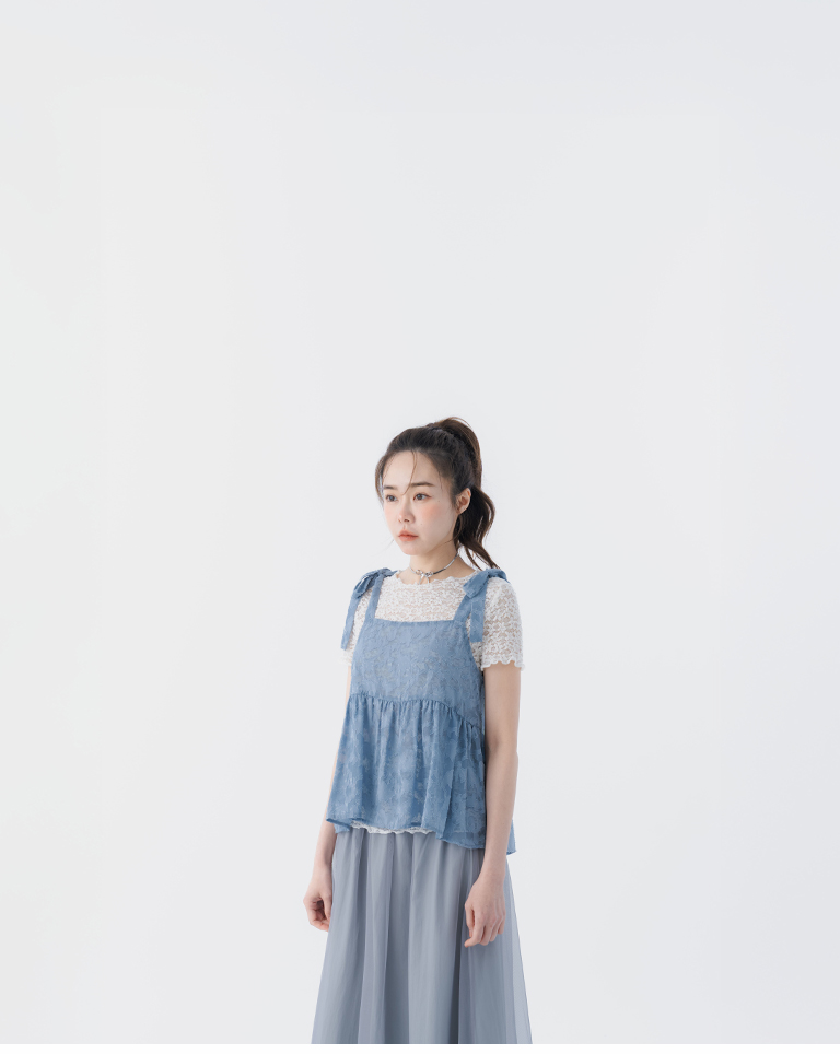 緹花透膚肩綁帶傘擺罩衫背心