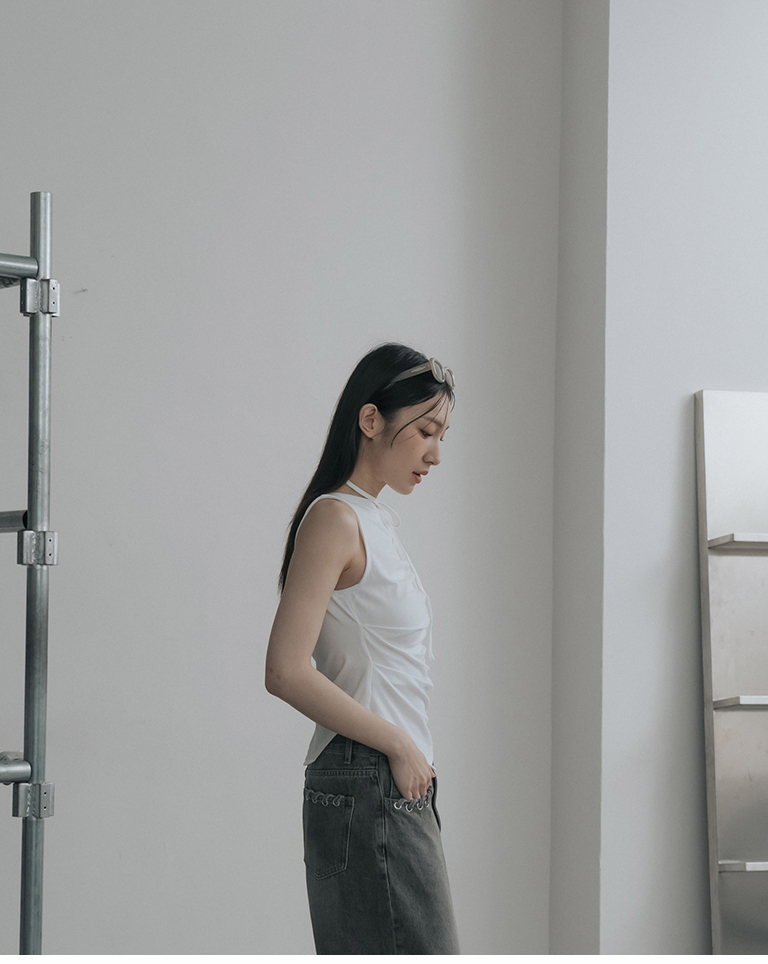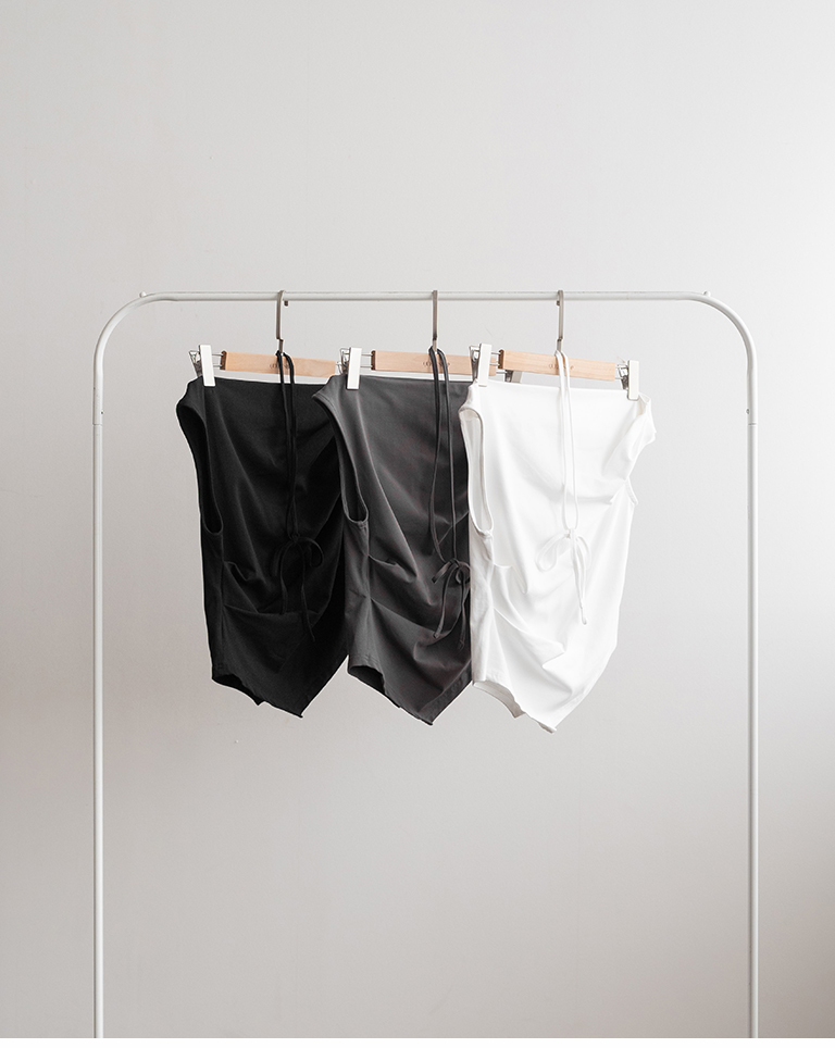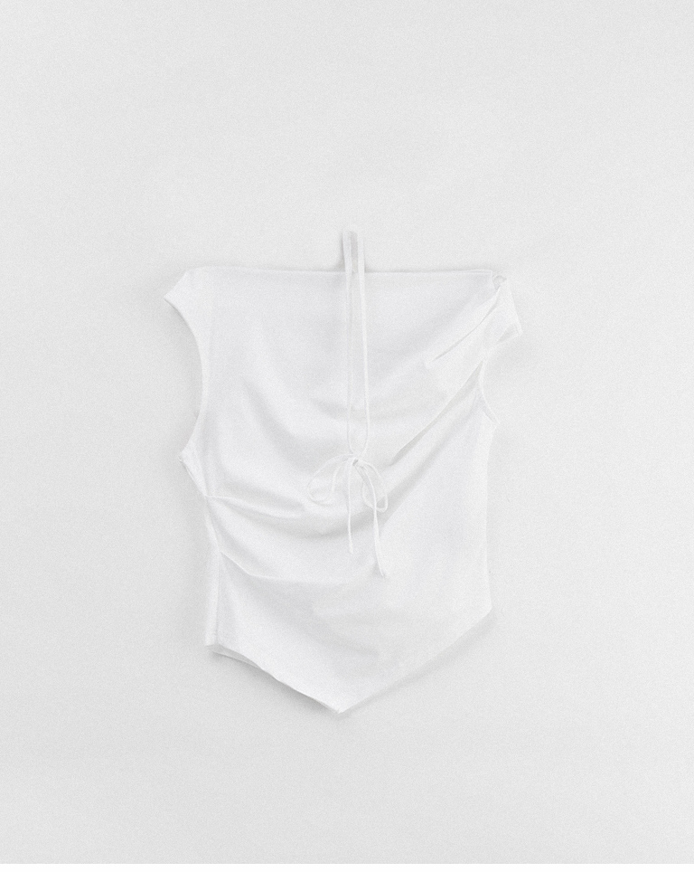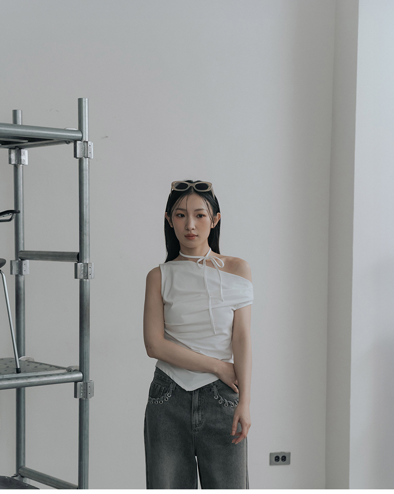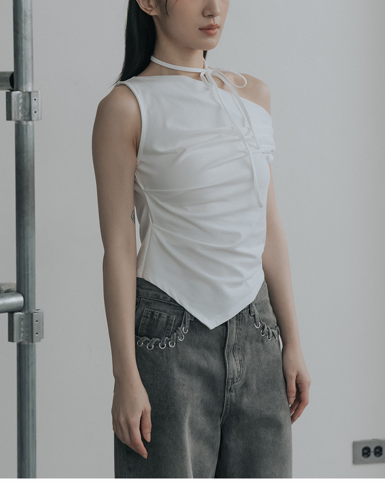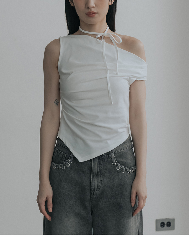 斜肩不對稱設計涼感上衣附綁帶-米白