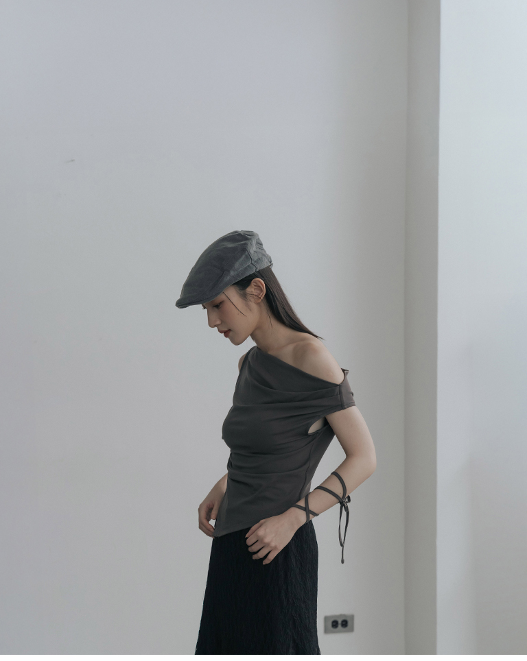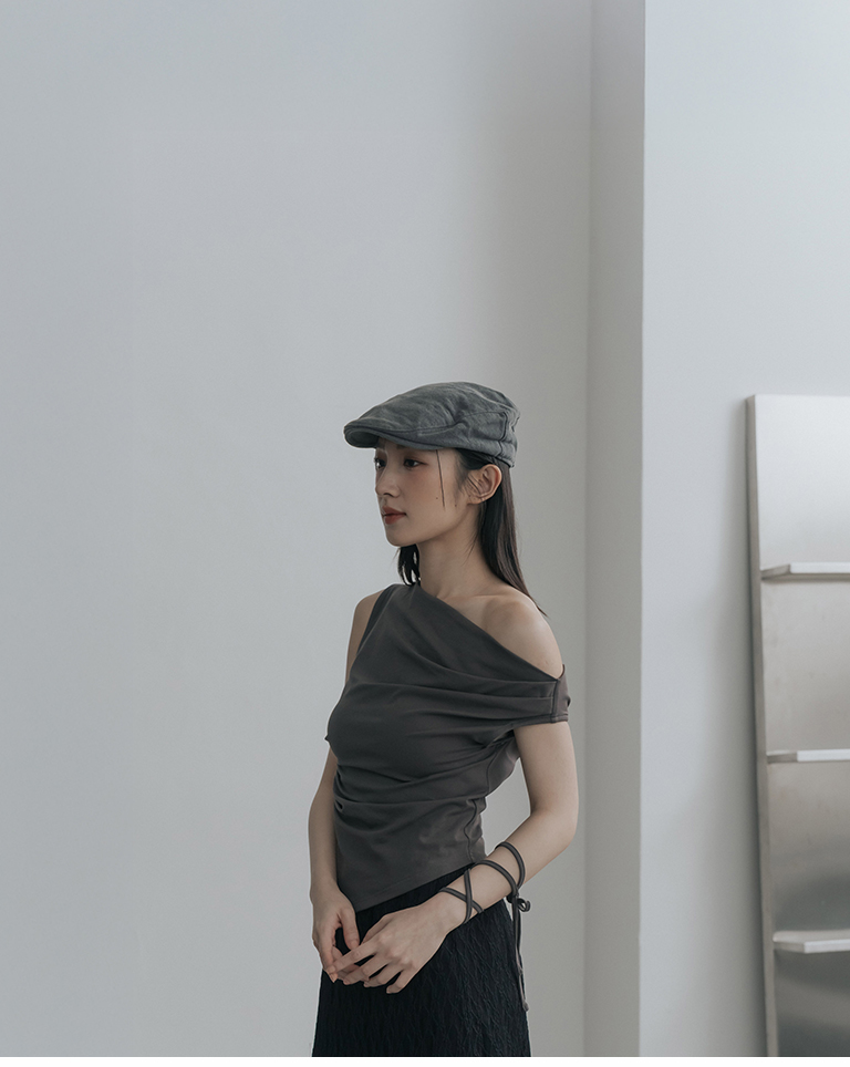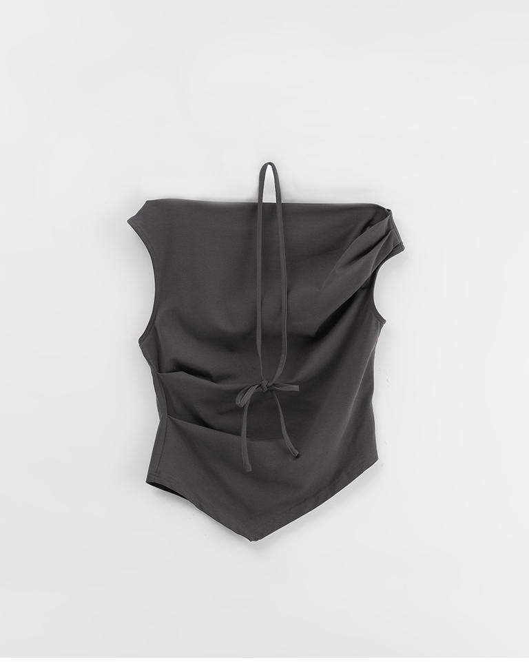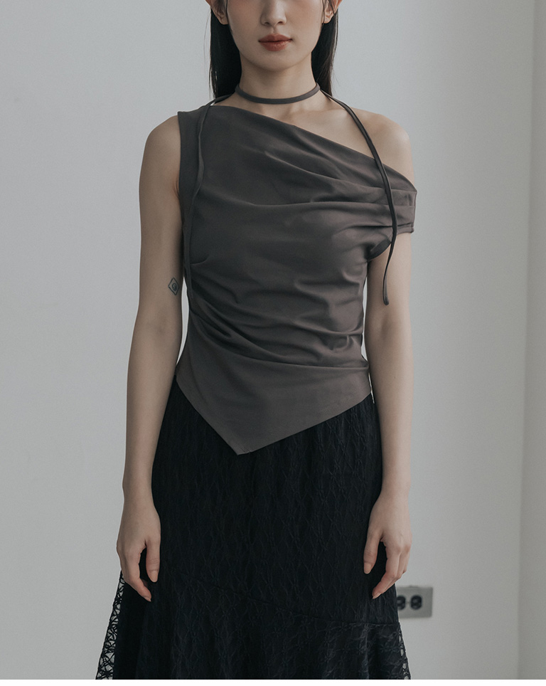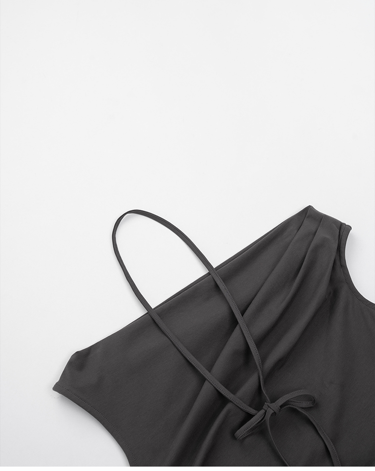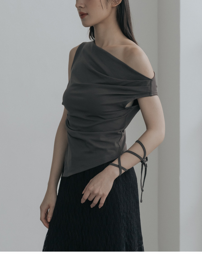 斜肩不對稱設計涼感上衣附綁帶-灰