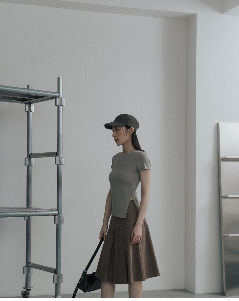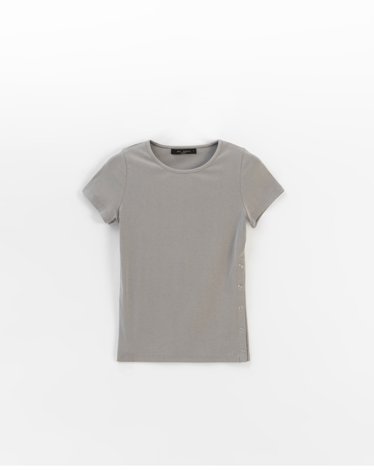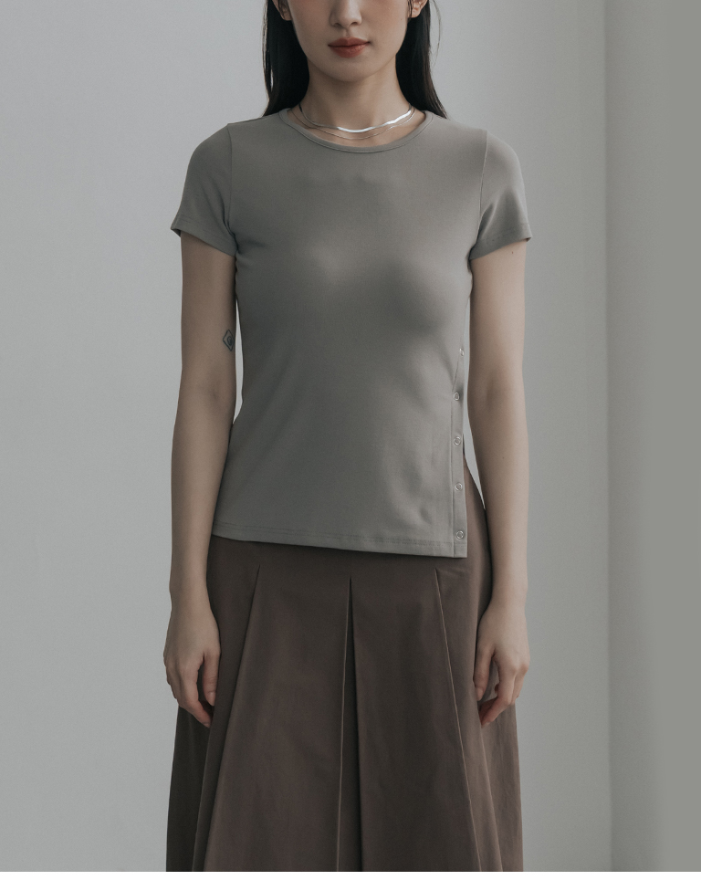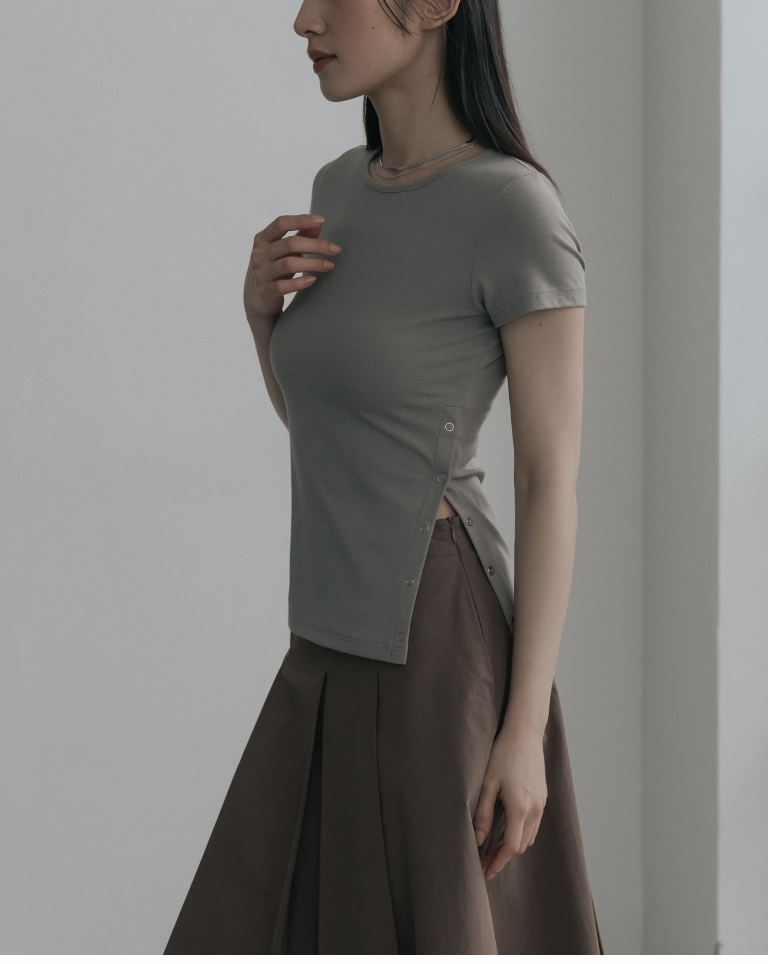 素面單邊壓釦設計彈性合身上衣-杏灰