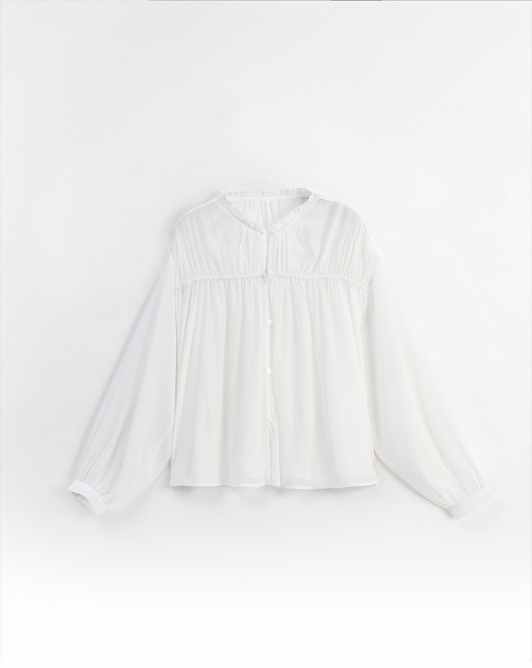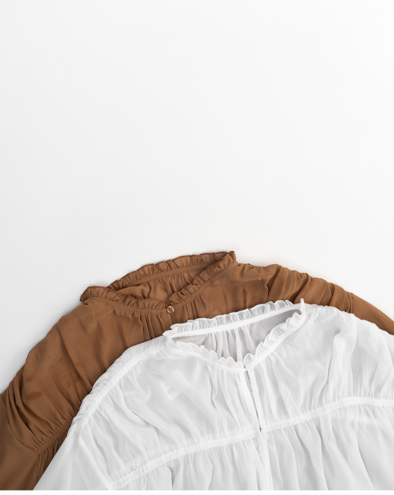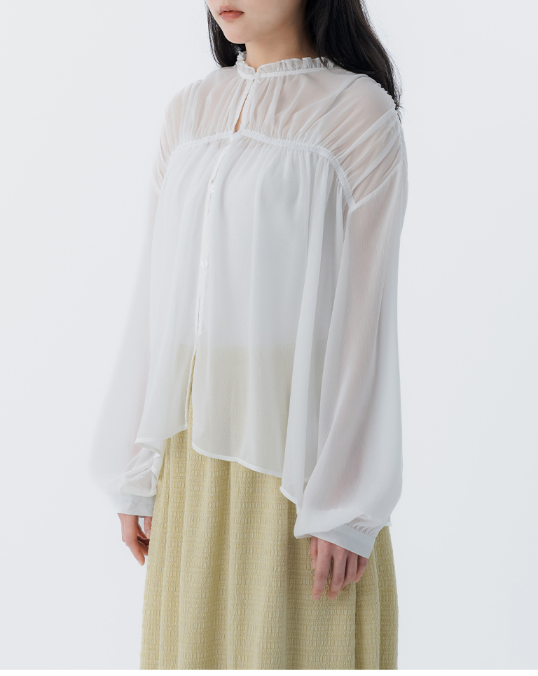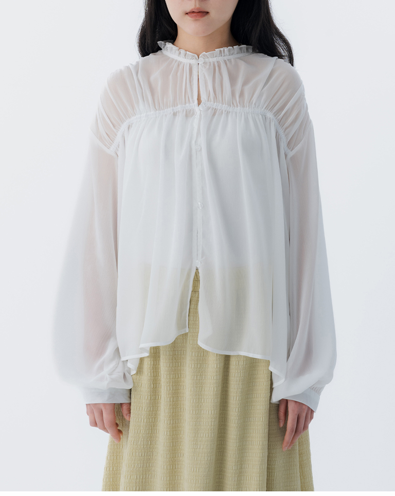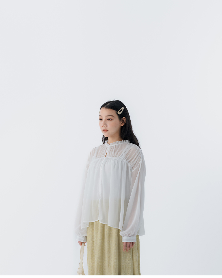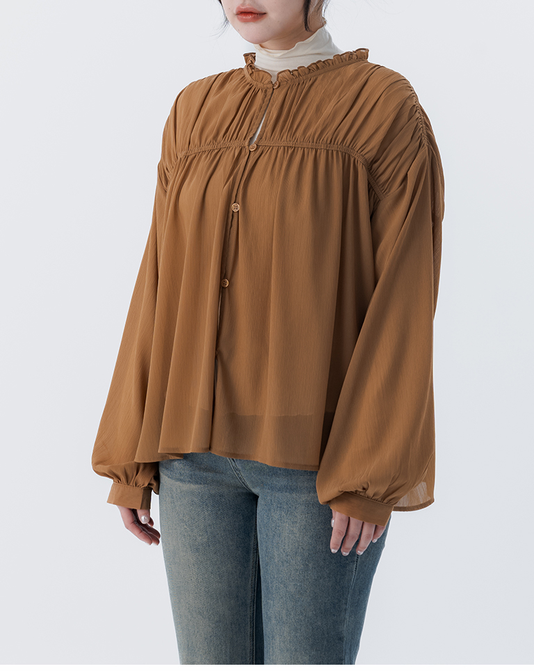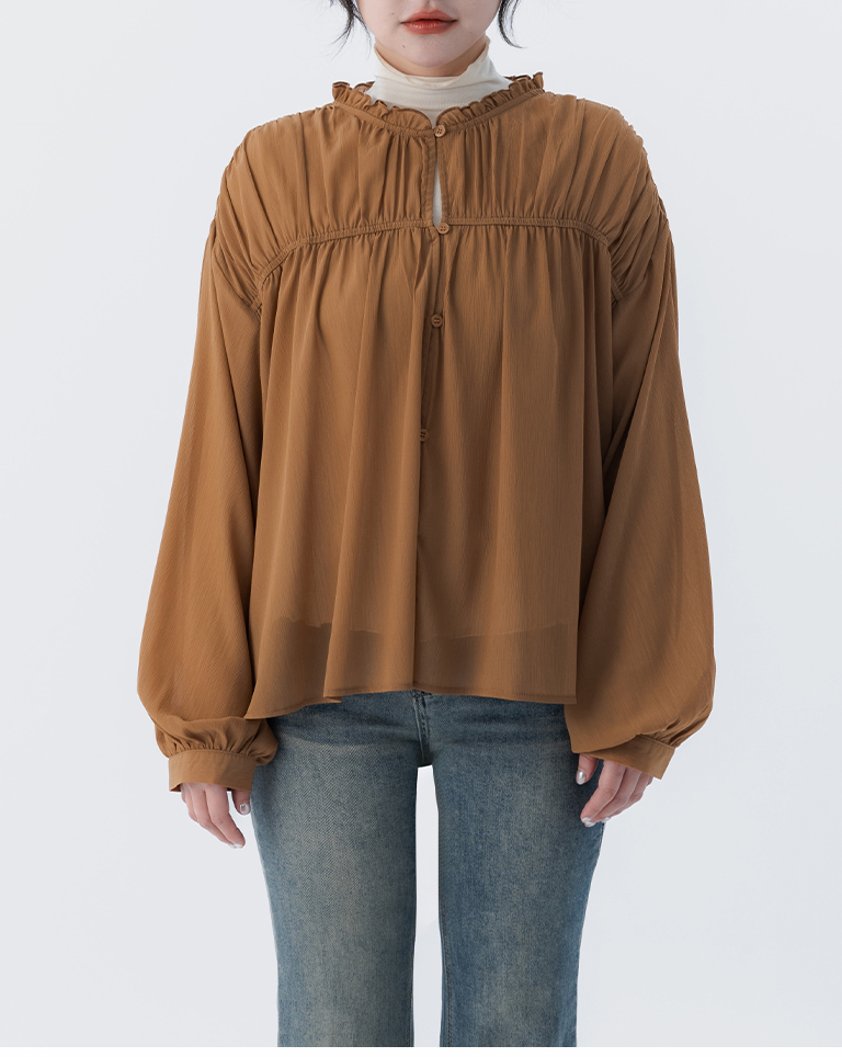 S~L身形實測!分尺寸皺皺木耳邊透膚高領長袖上衣