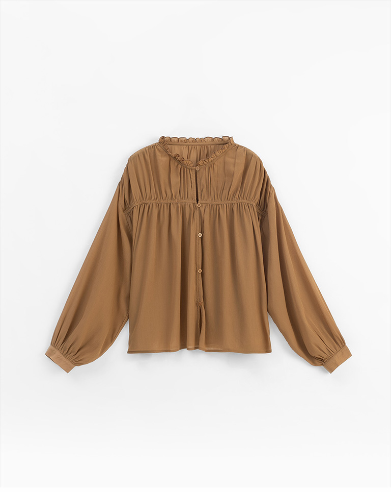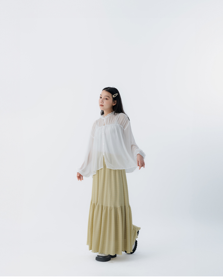 立領荷葉排釦透膚長袖上衣