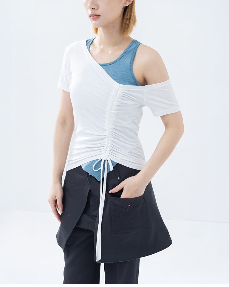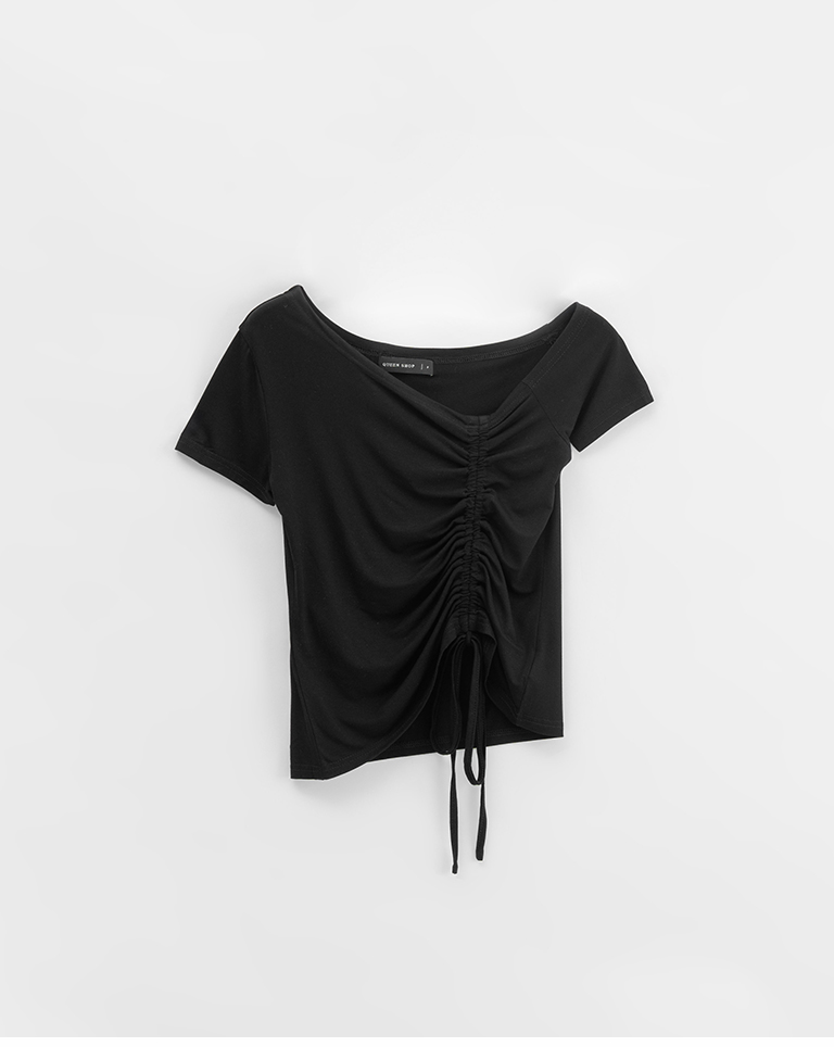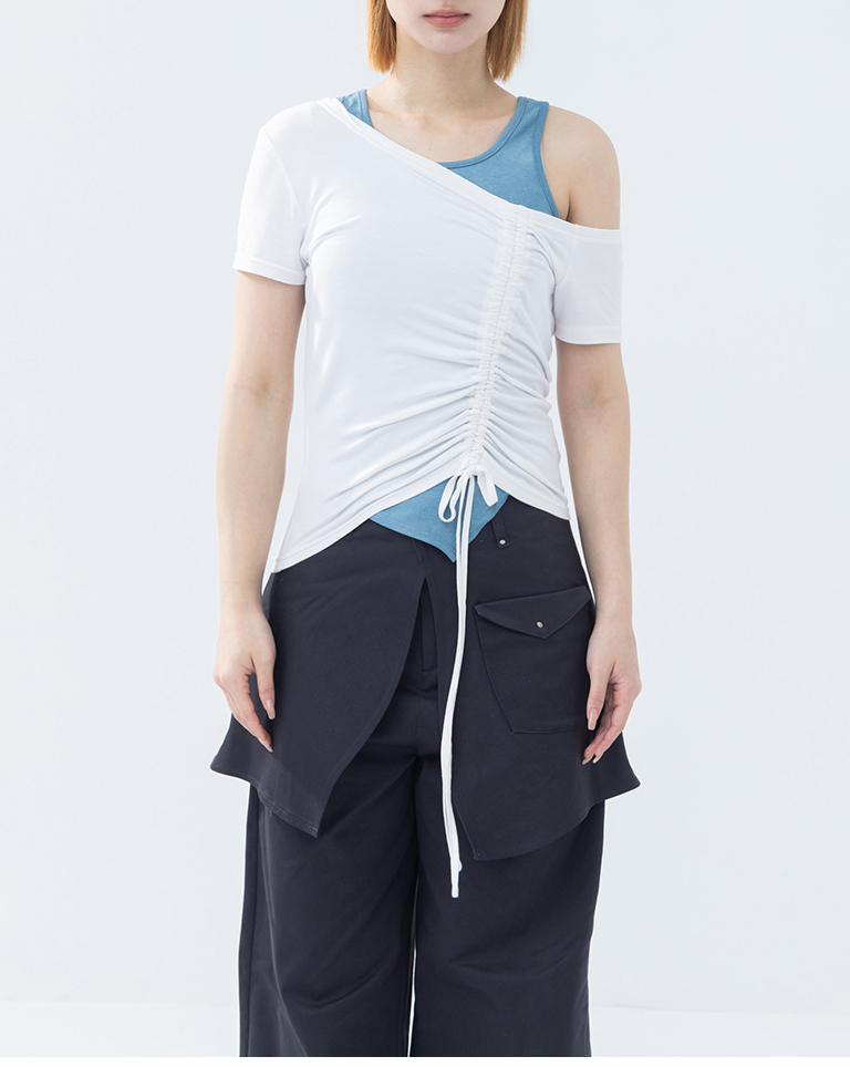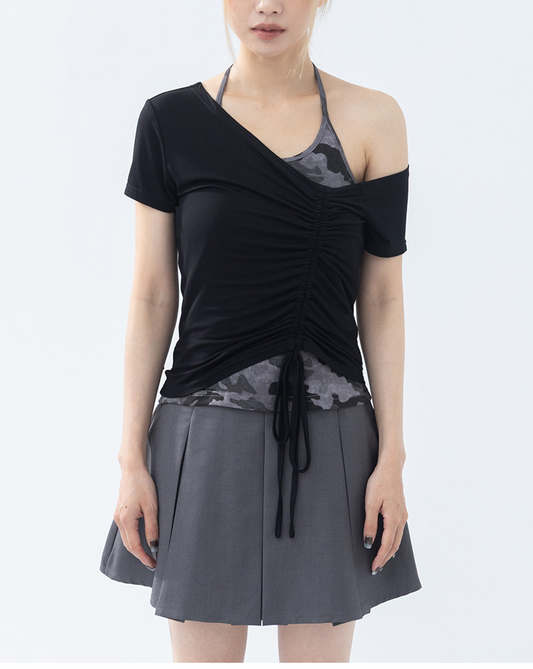 斜肩抽皺綁帶設計短袖上衣