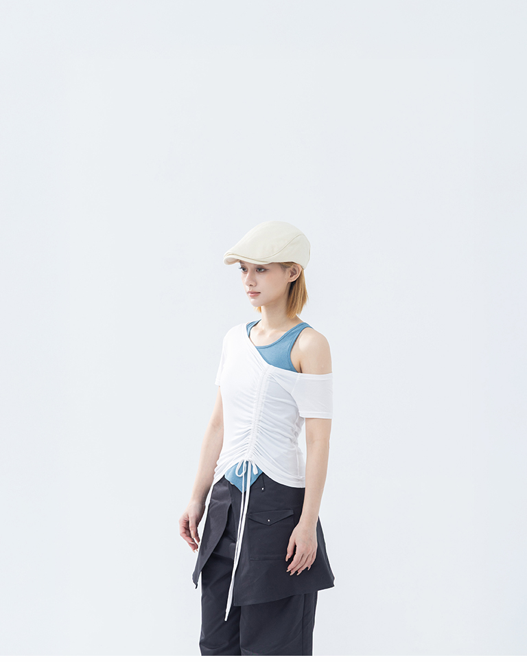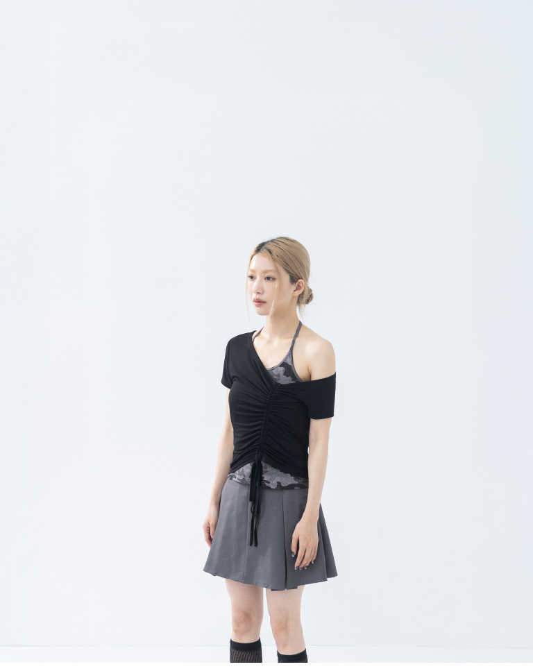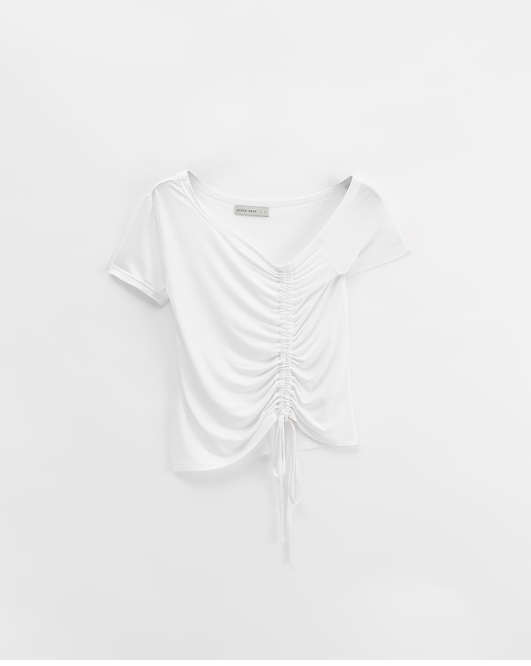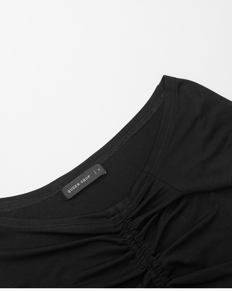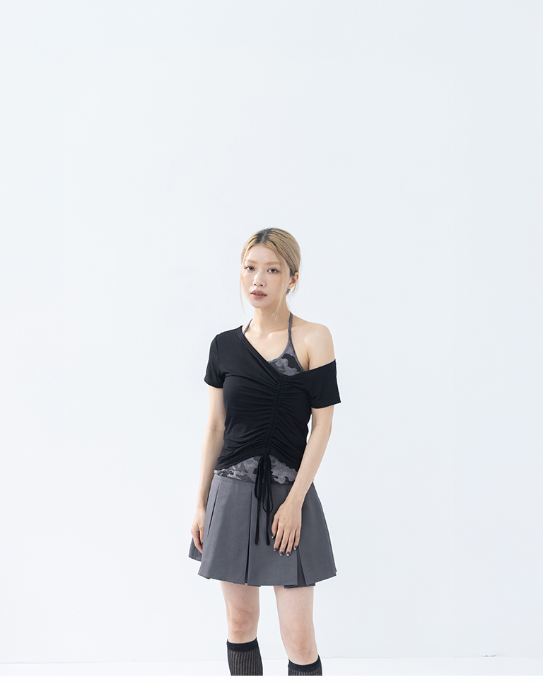 斜肩抽皺綁帶設計短袖上衣