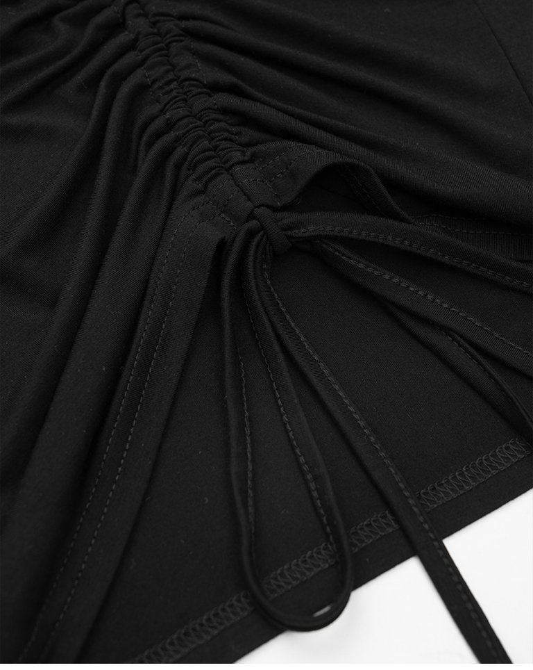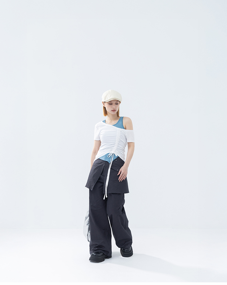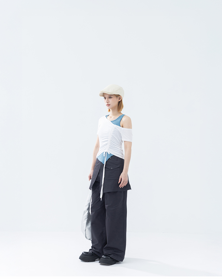 前斜抽皺結合綁帶設計 增添不對稱層次