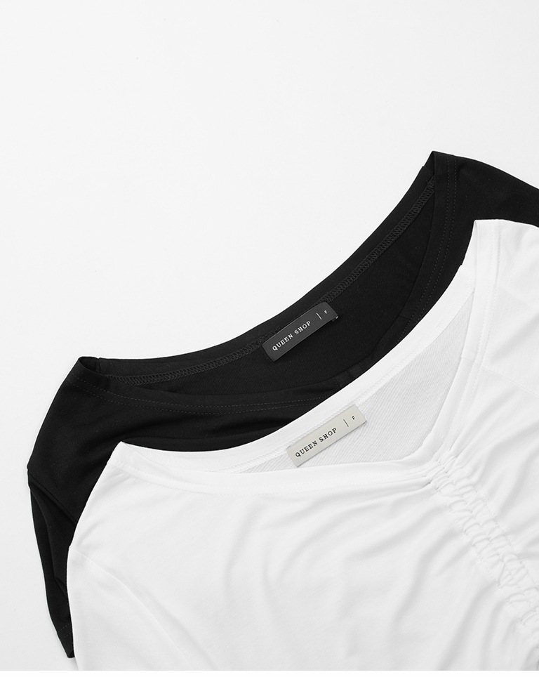 斜肩抽皺綁帶設計短袖上衣 兩色售