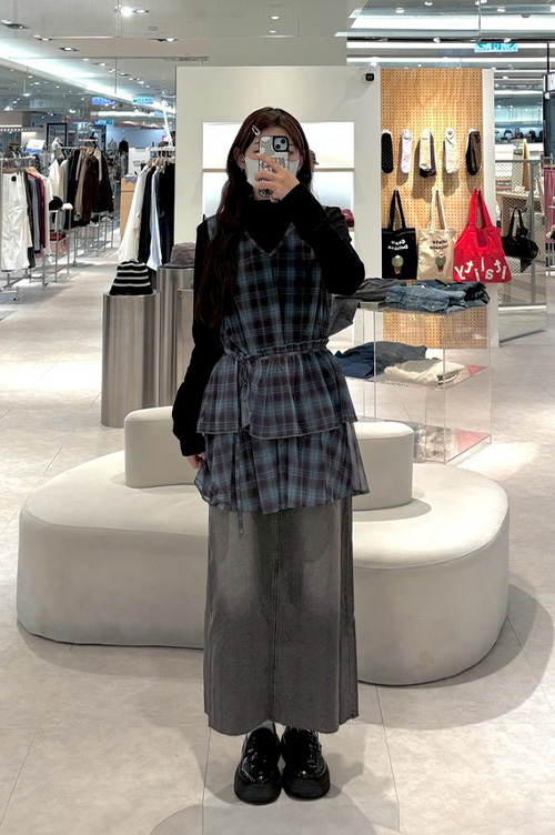 格紋透膚網紗兩件式附襯裙罩衫背心