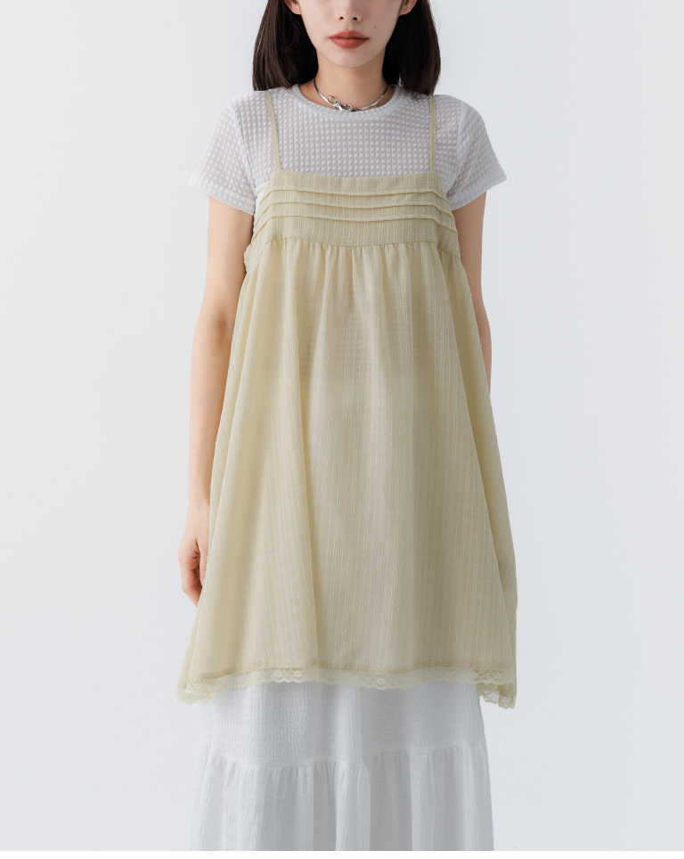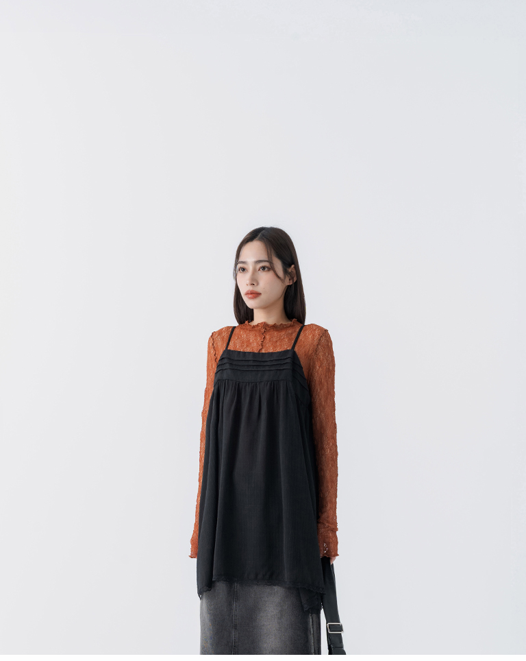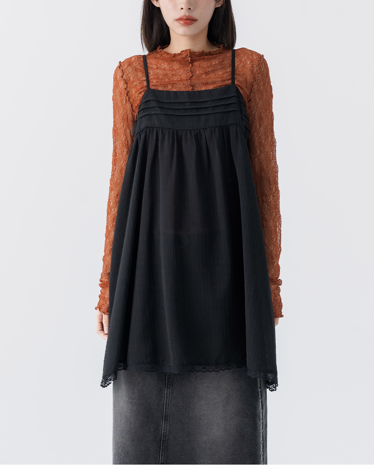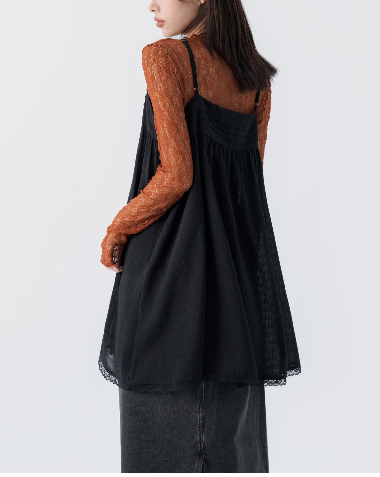 打褶下擺蕾絲設計細肩罩衫背心 三色售