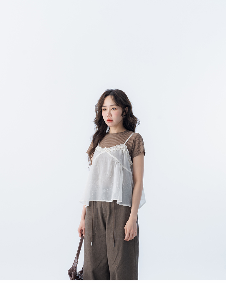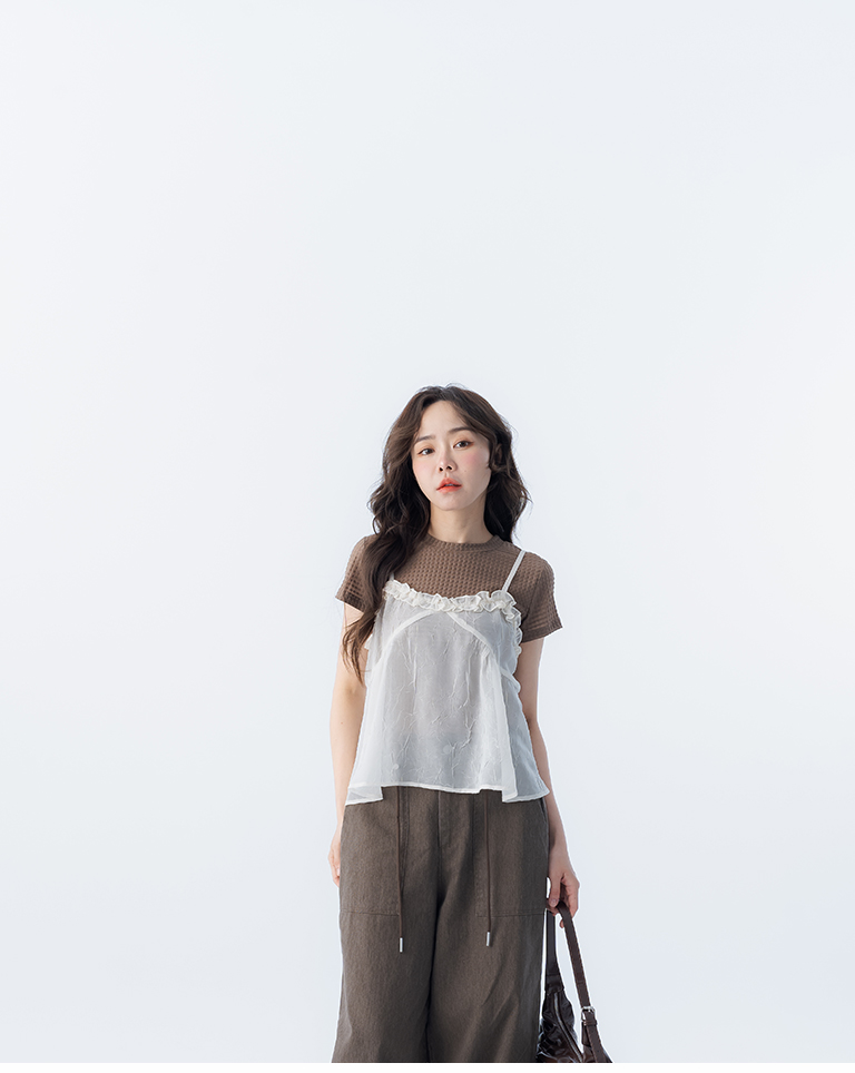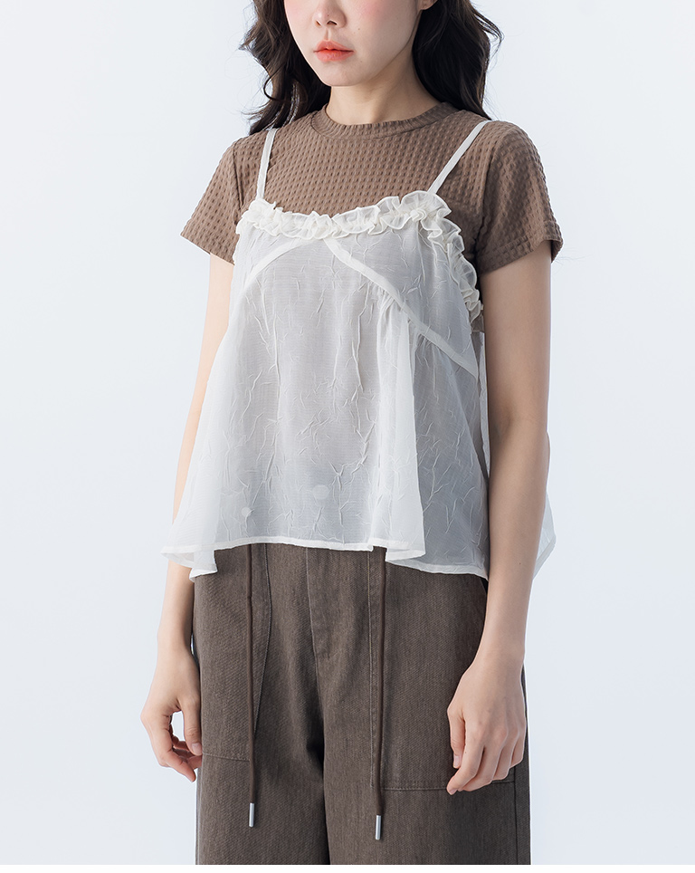 荷葉V領皺皺網紗設計細肩背心