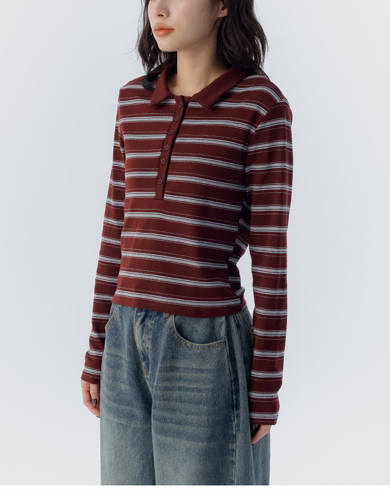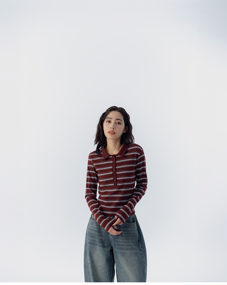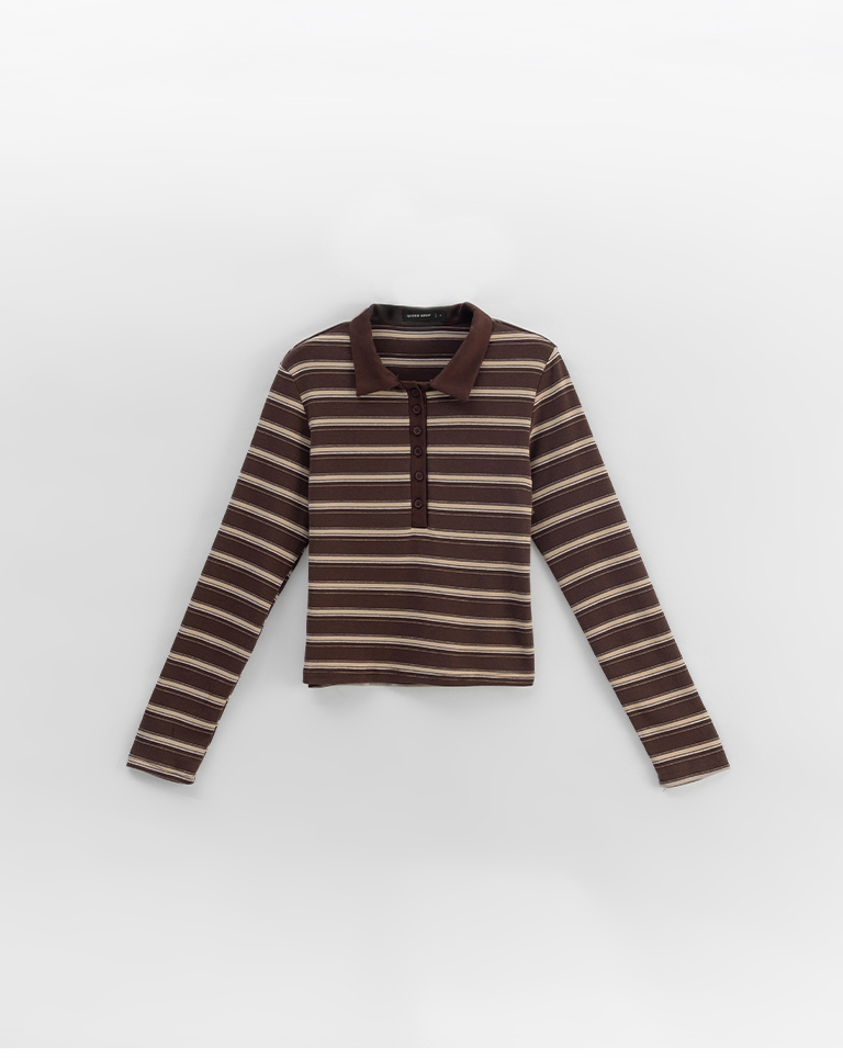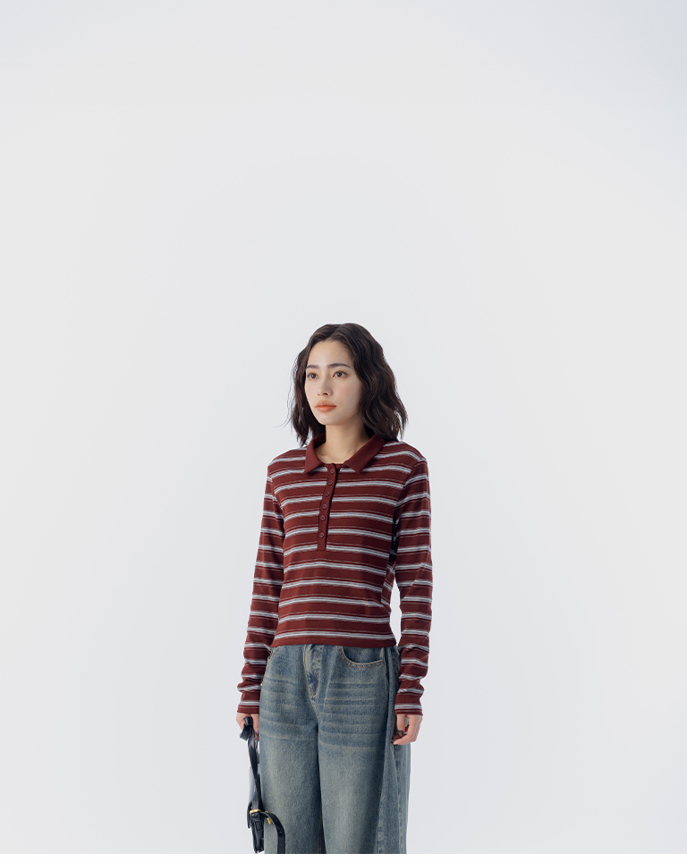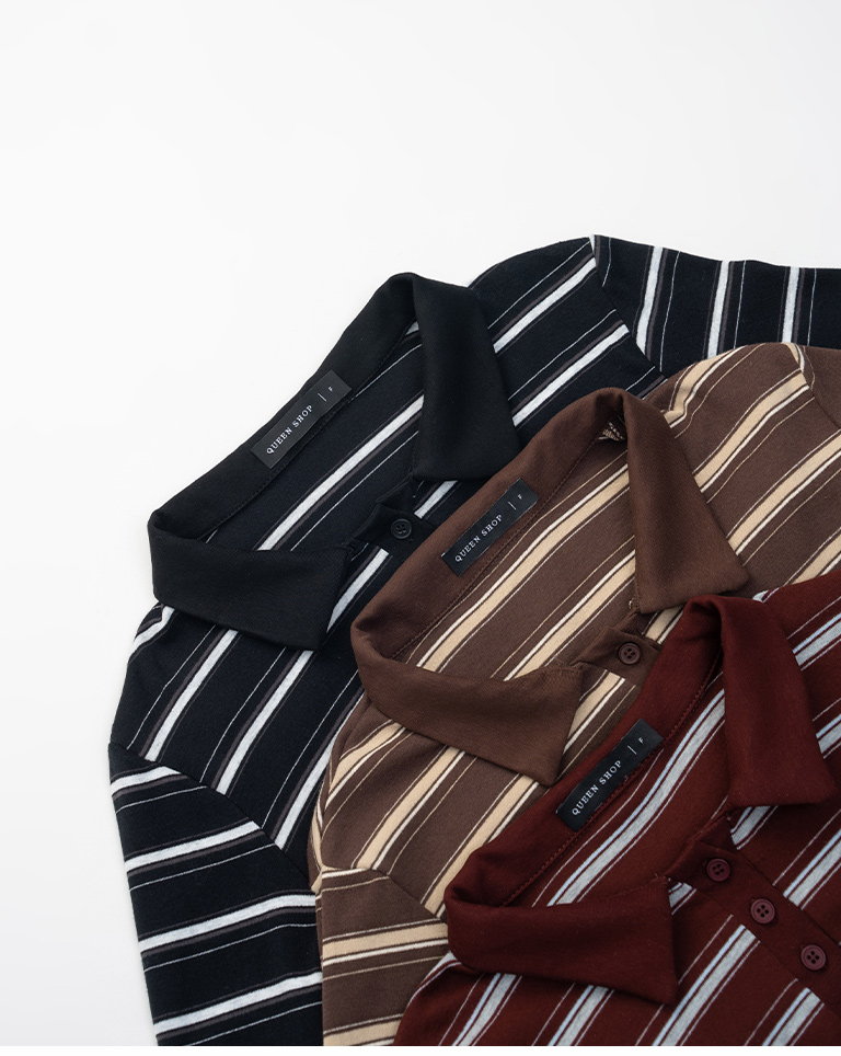 配色條紋合身polo領長袖上衣 三色售