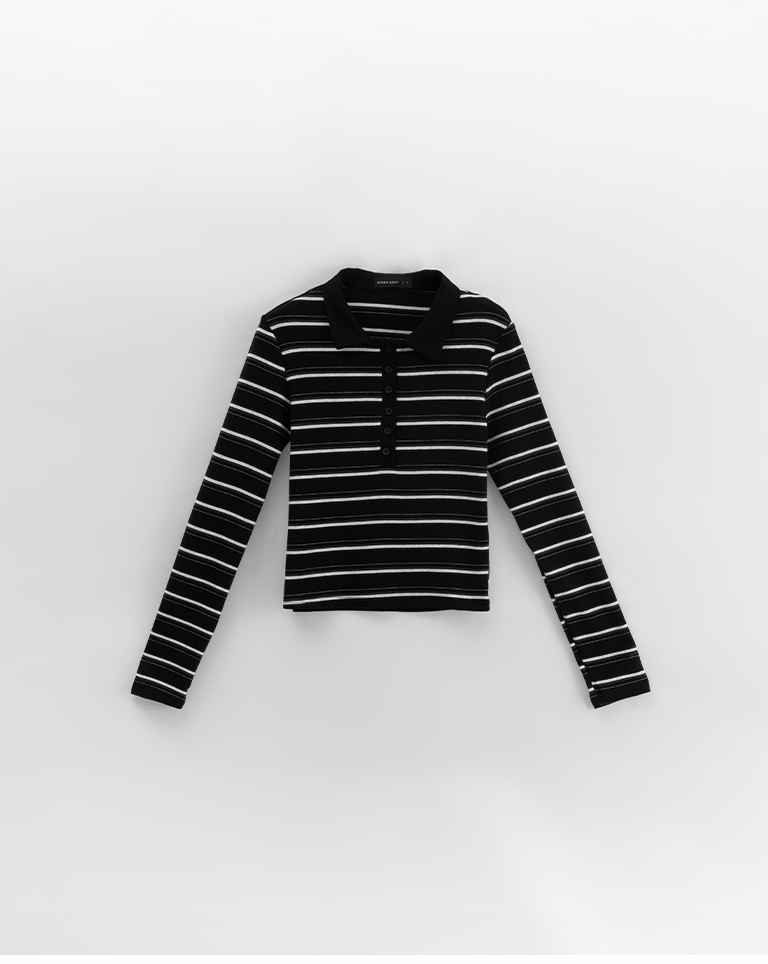 配色條紋合身polo領長袖上衣