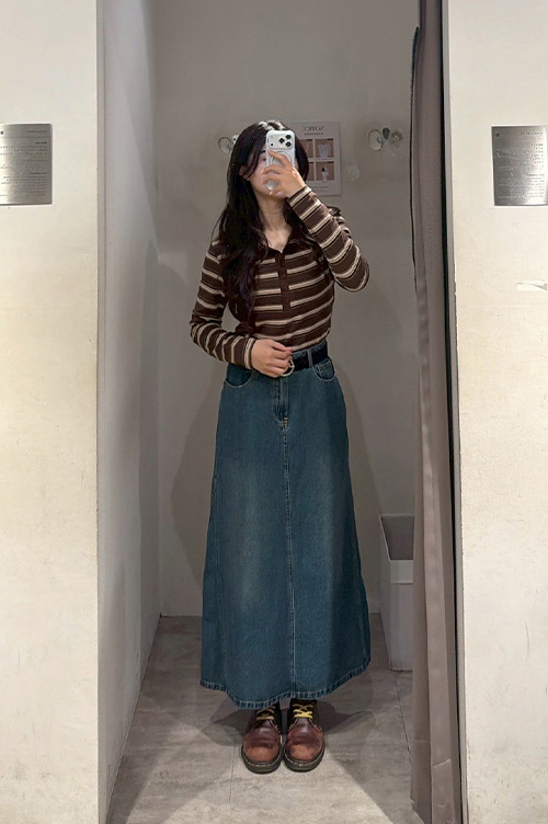 配色條紋合身polo領長袖上衣 三色售