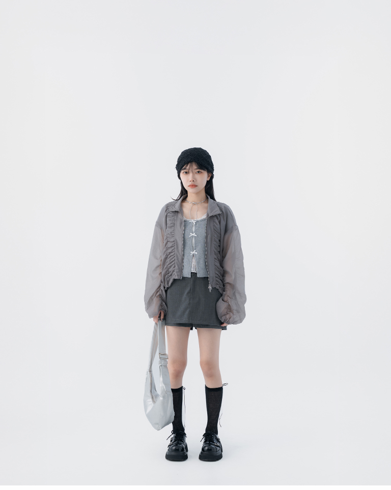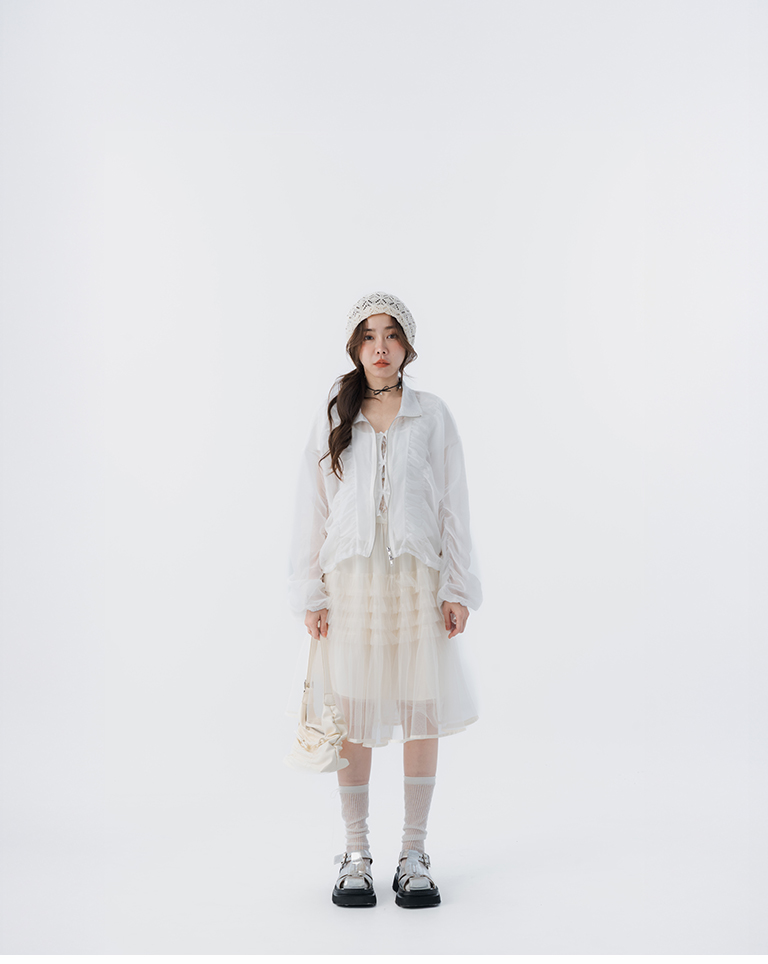 S~L身形實測!分尺寸皺皺木耳邊透膚高領長袖上衣