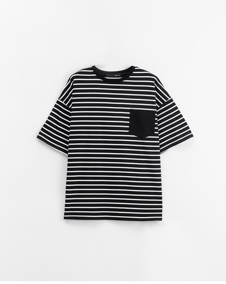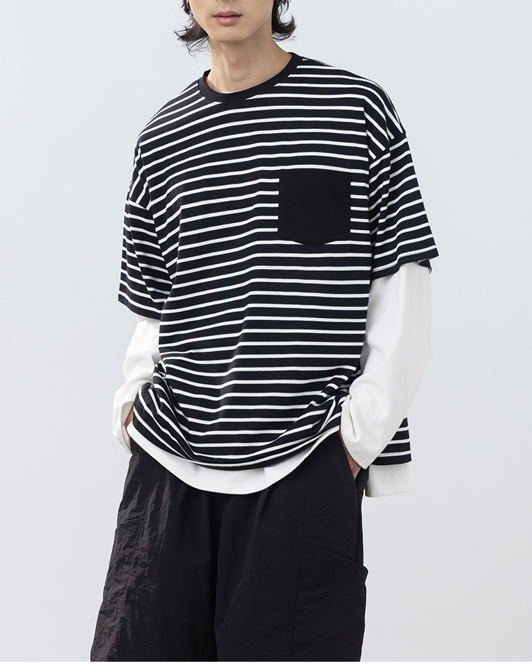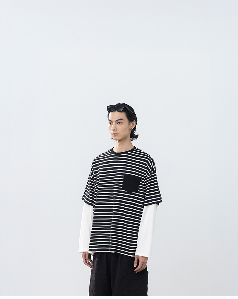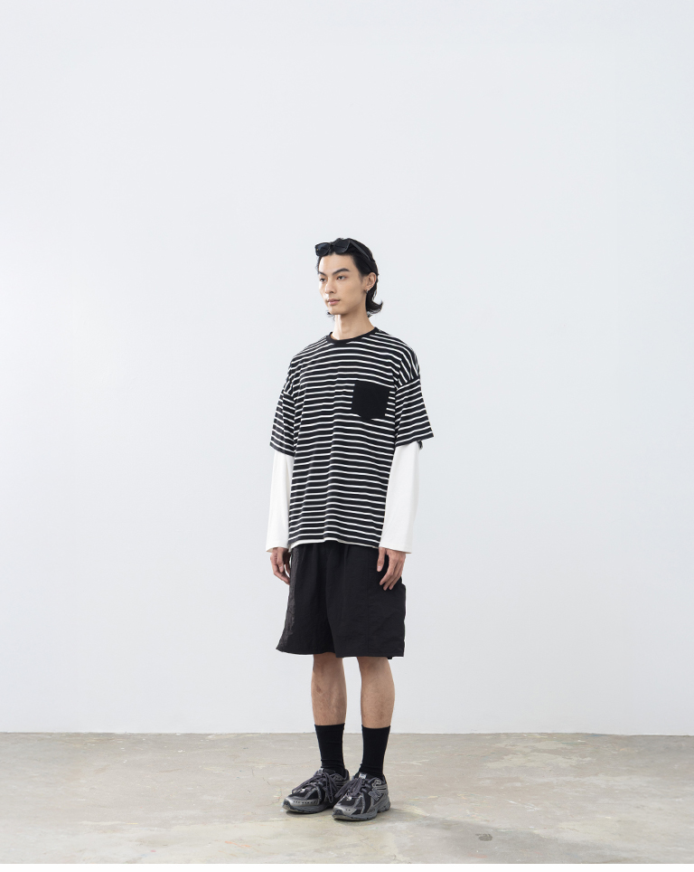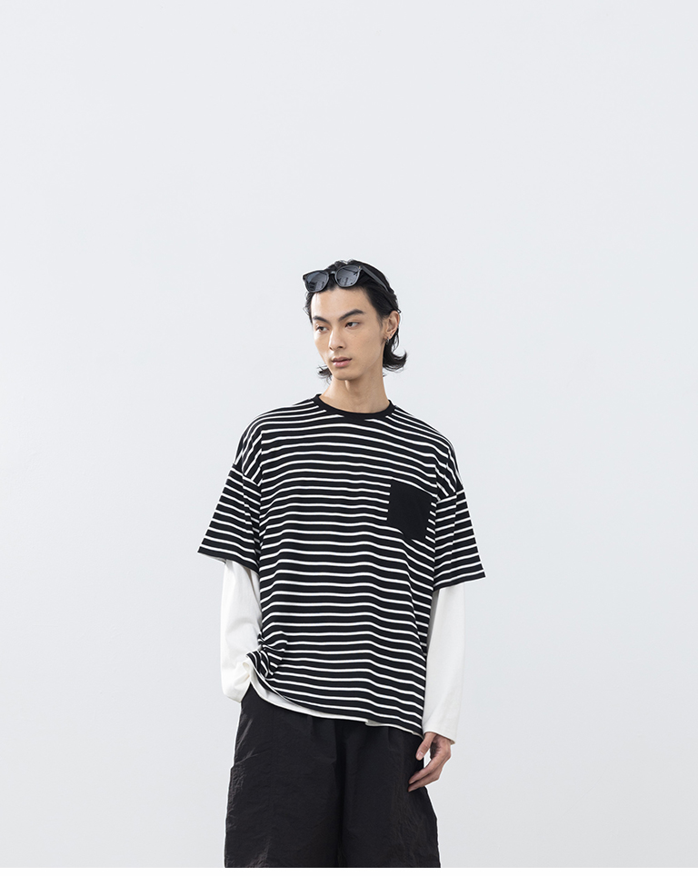 男裝 條紋配色口袋短袖上衣-黑M/L/XL