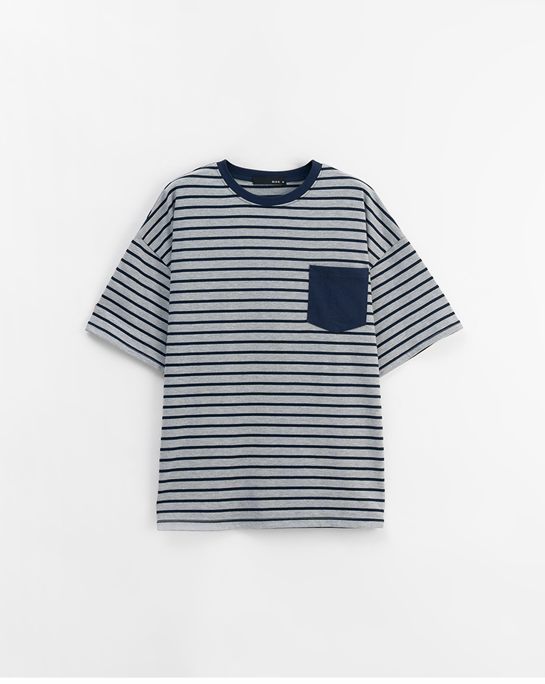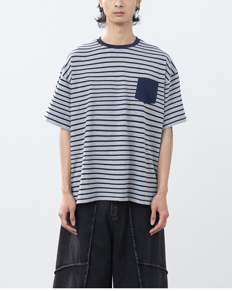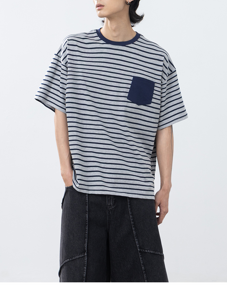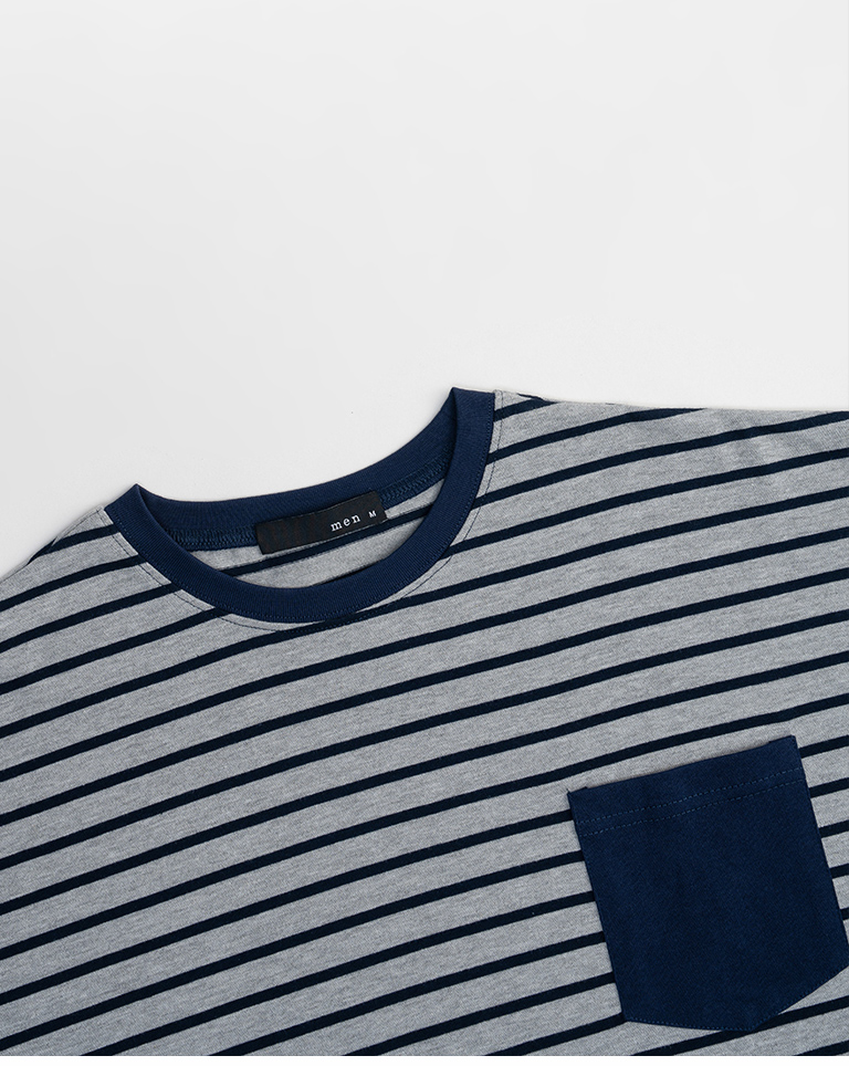 男裝 條紋配色口袋短袖上衣-灰M/L/XL