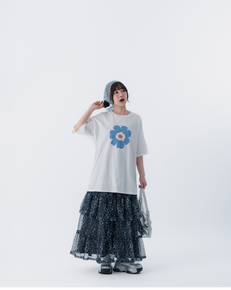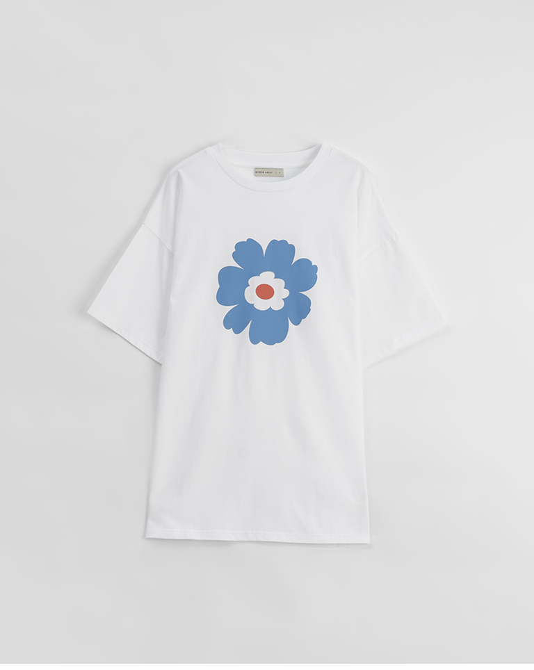 花花印圖寬版短袖上衣-白