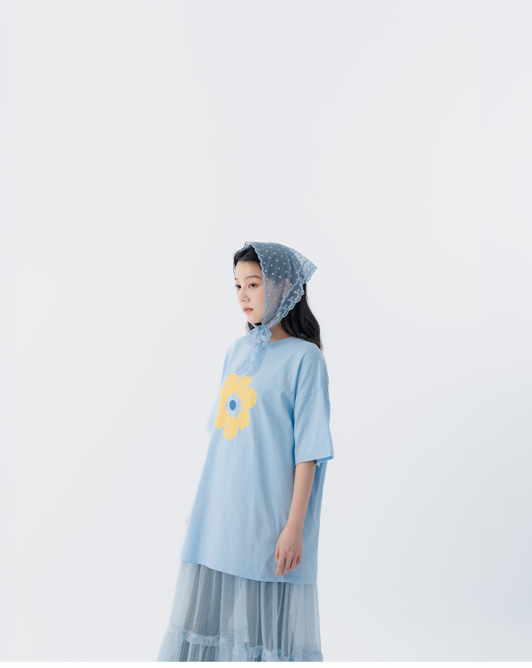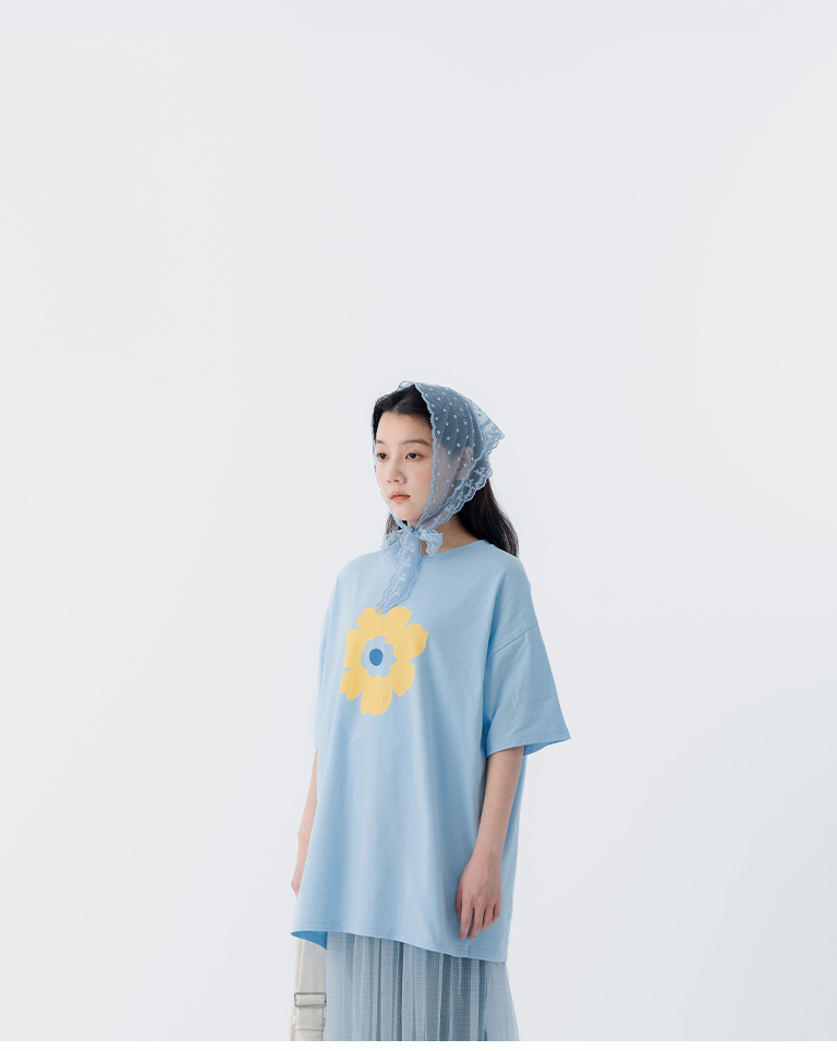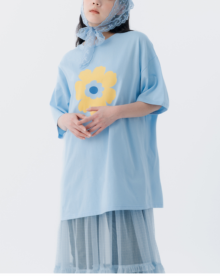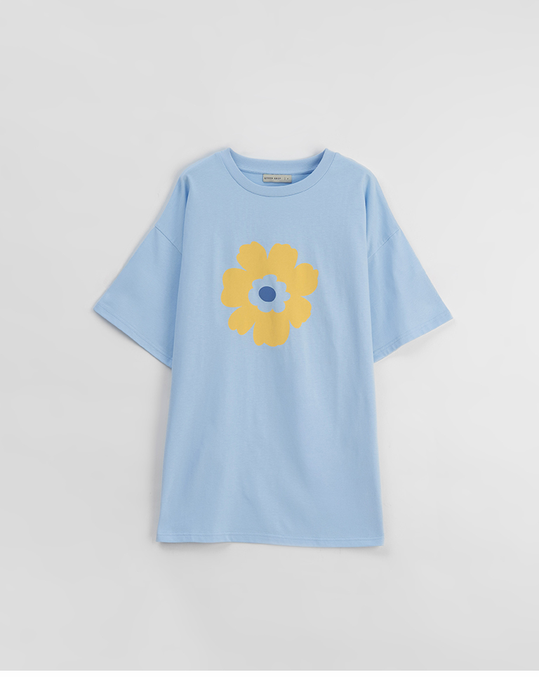 花花印圖寬版短袖上衣-藍