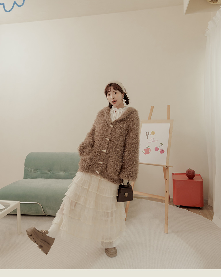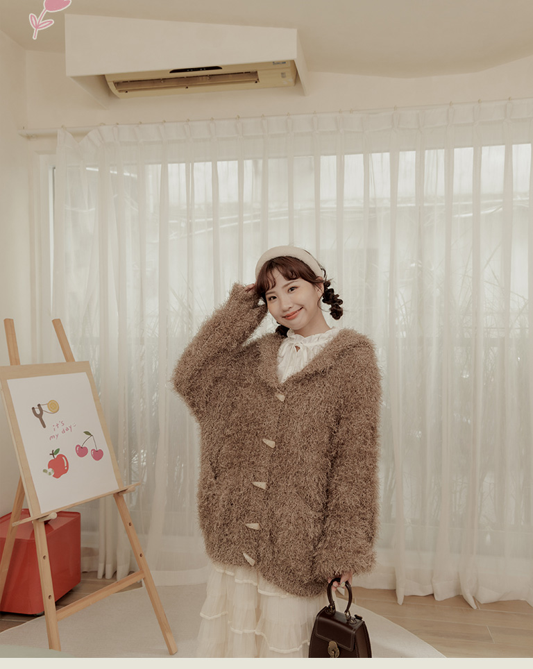 姿佑聯名 針織毛茸茸牛角扣連帽外套-棕