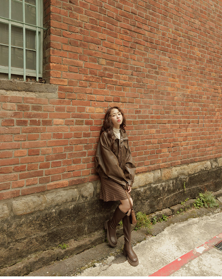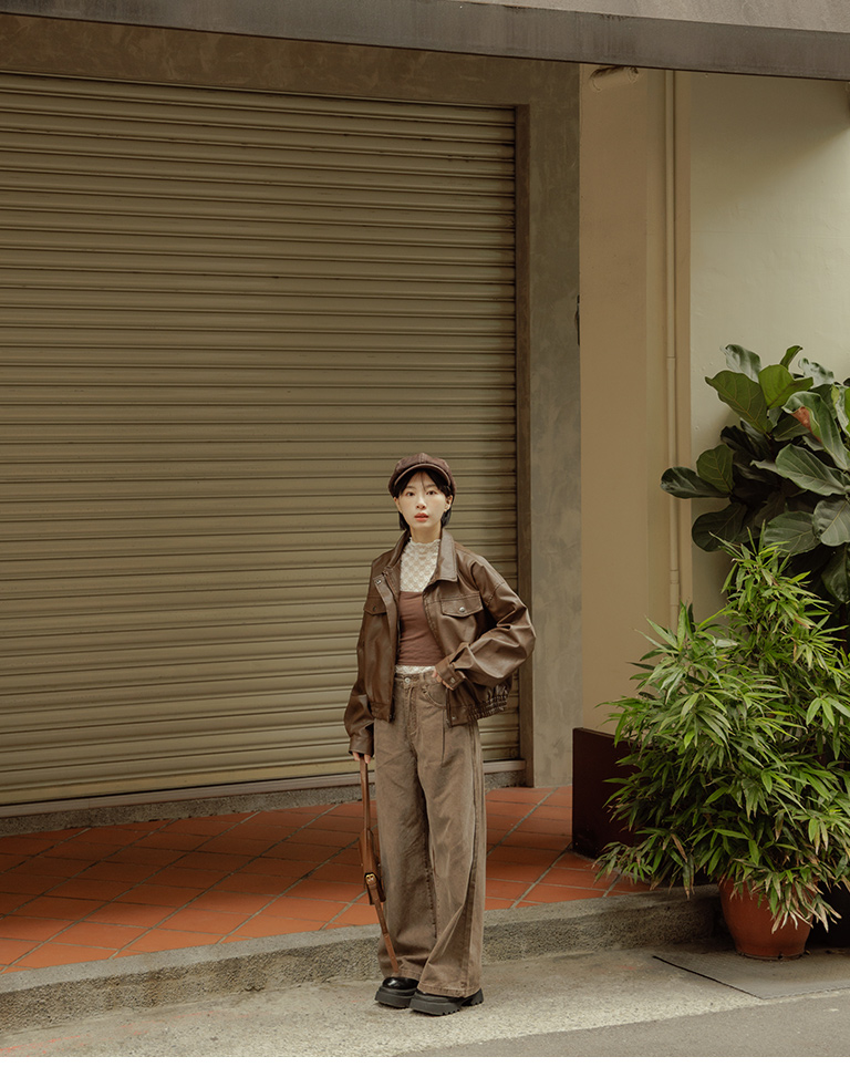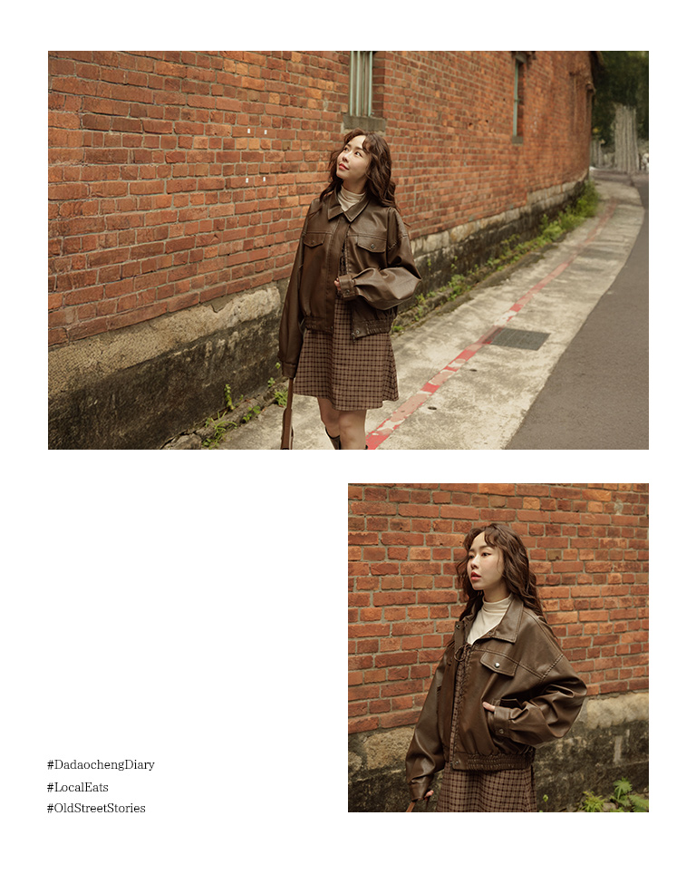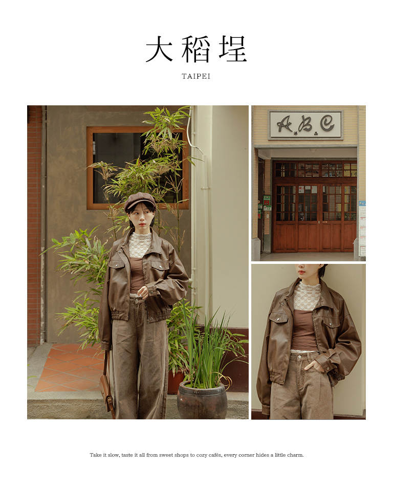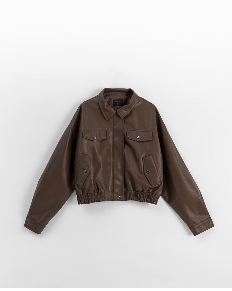 翻蓋口袋造型短版皮革夾克外套-咖啡