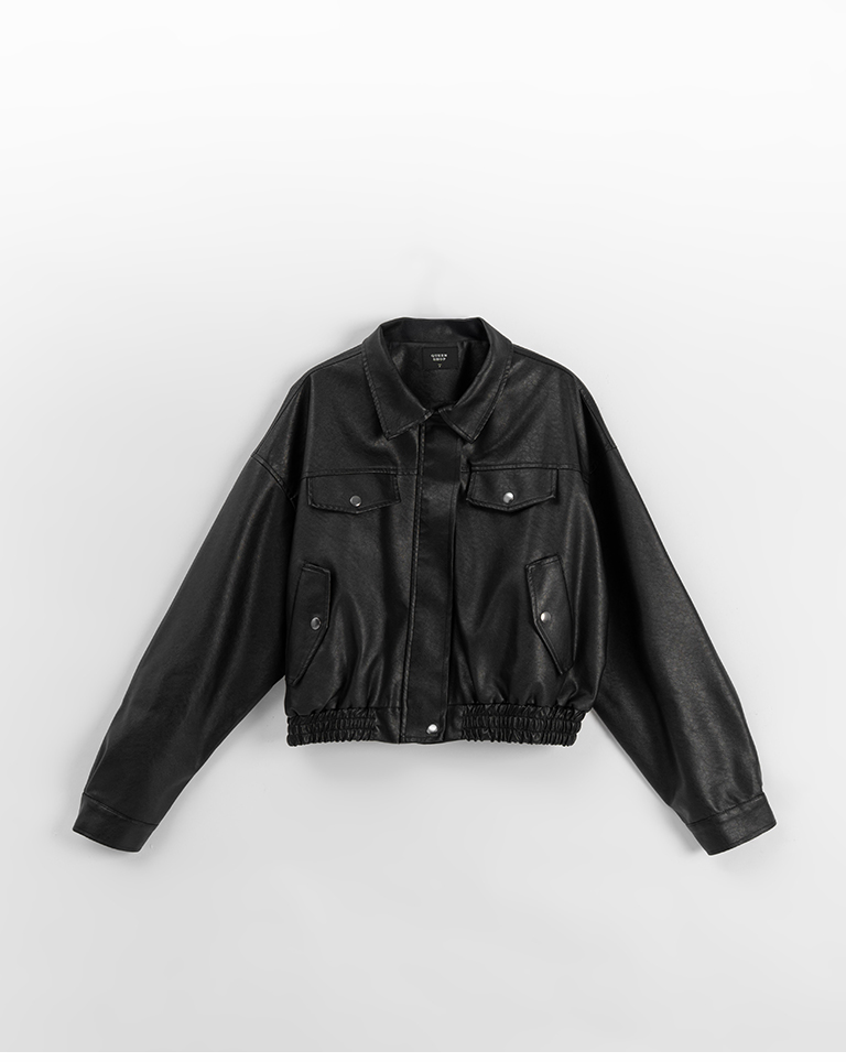 翻蓋口袋造型短版皮革夾克外套-黑