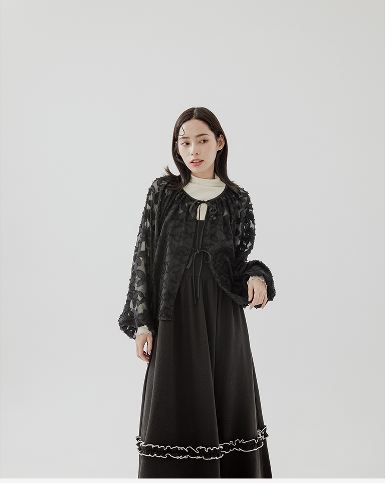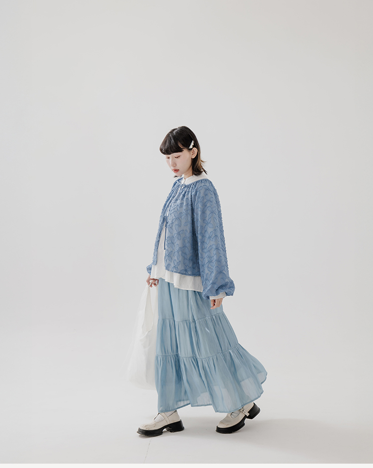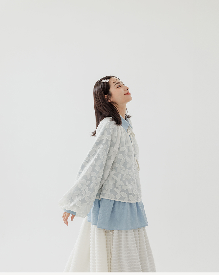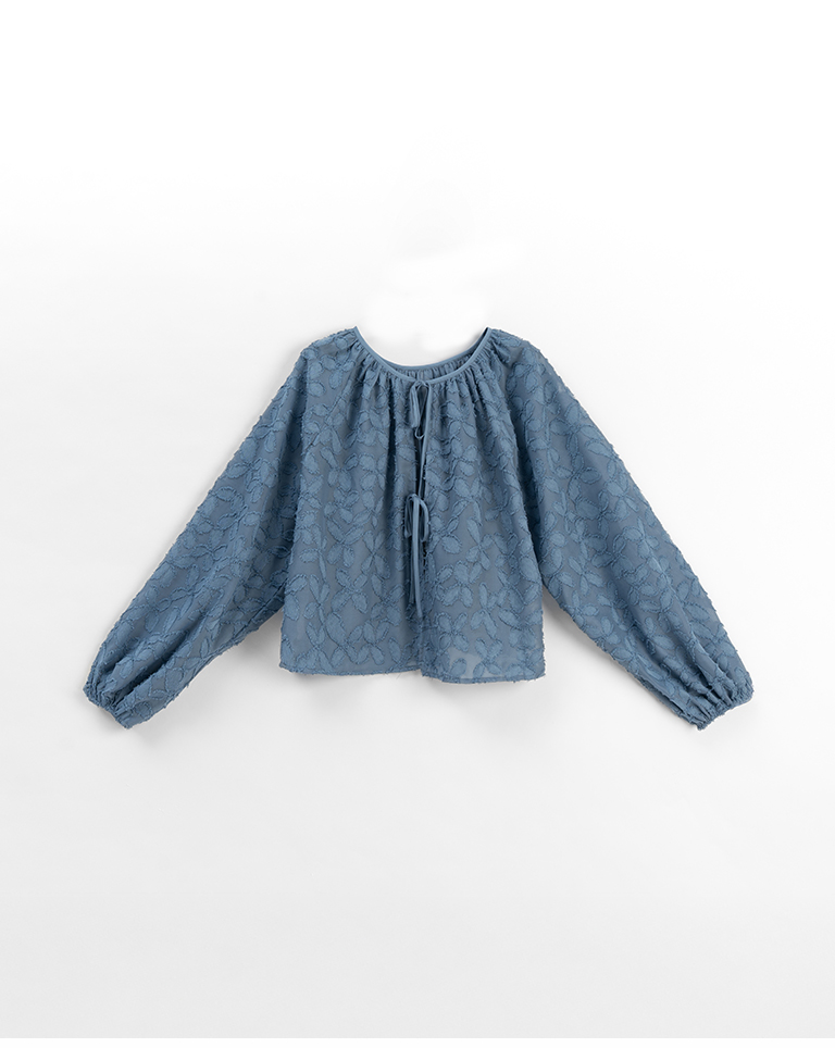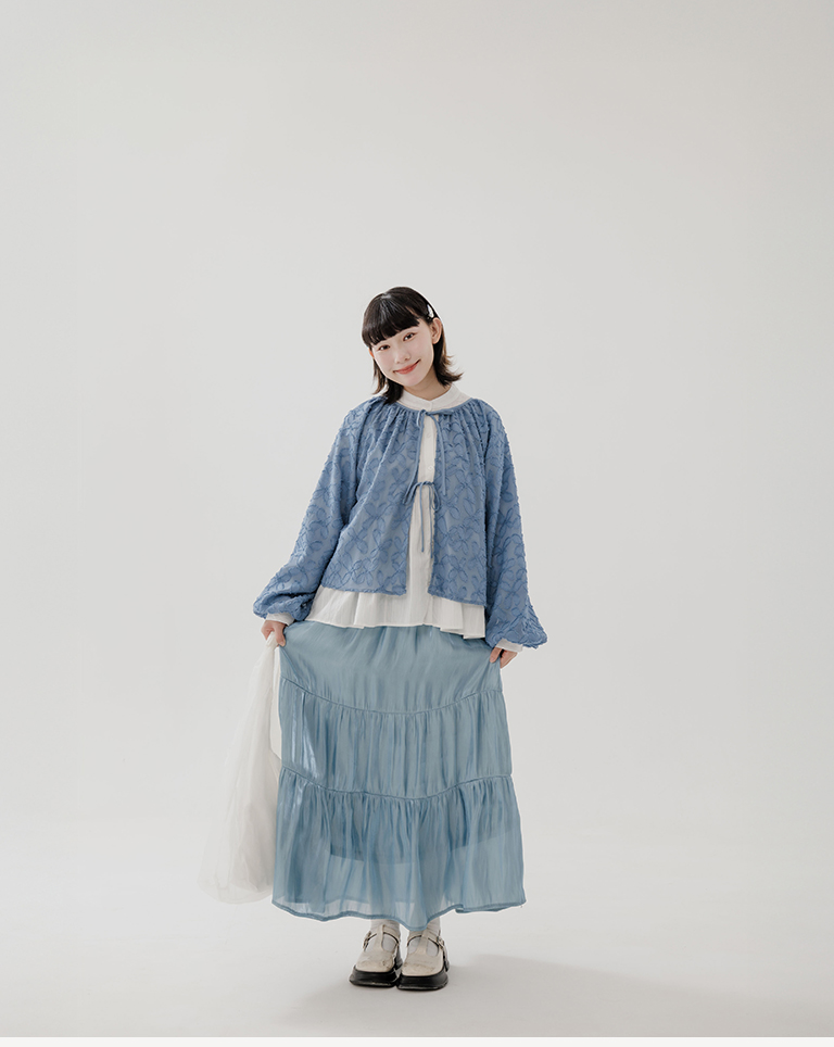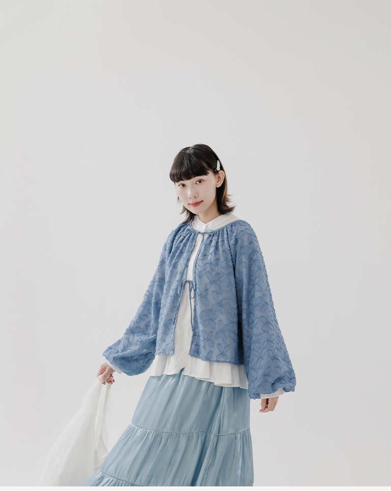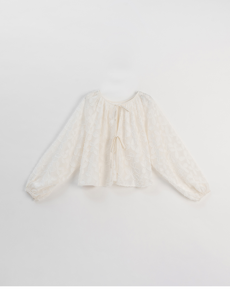 棉花糖 緹花澎袖綁帶長袖罩衫