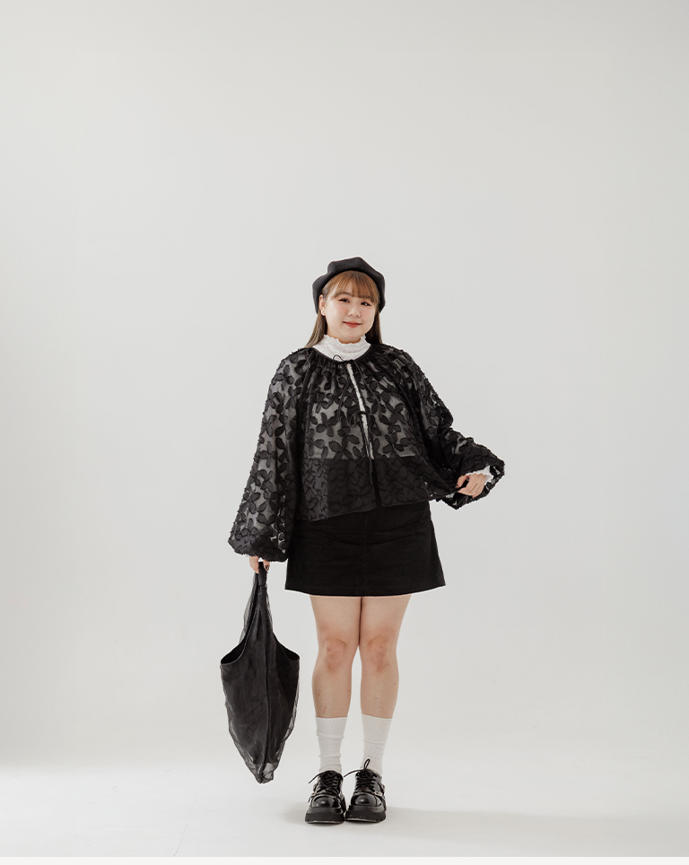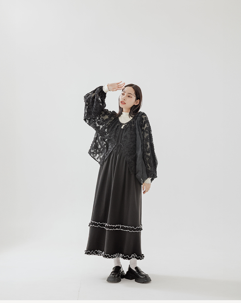 S~L身形實測!分尺寸皺皺木耳邊透膚高領長袖上衣