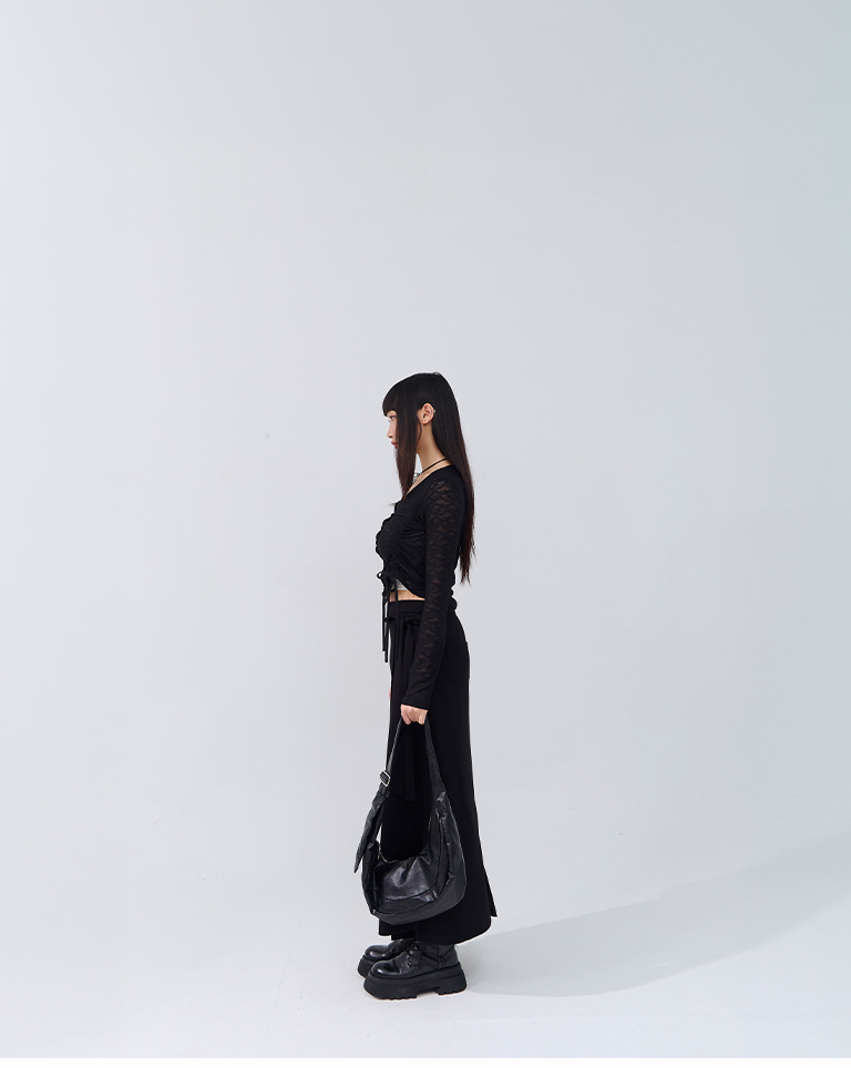 S~L身形實測!分尺寸皺皺木耳邊透膚高領長袖上衣