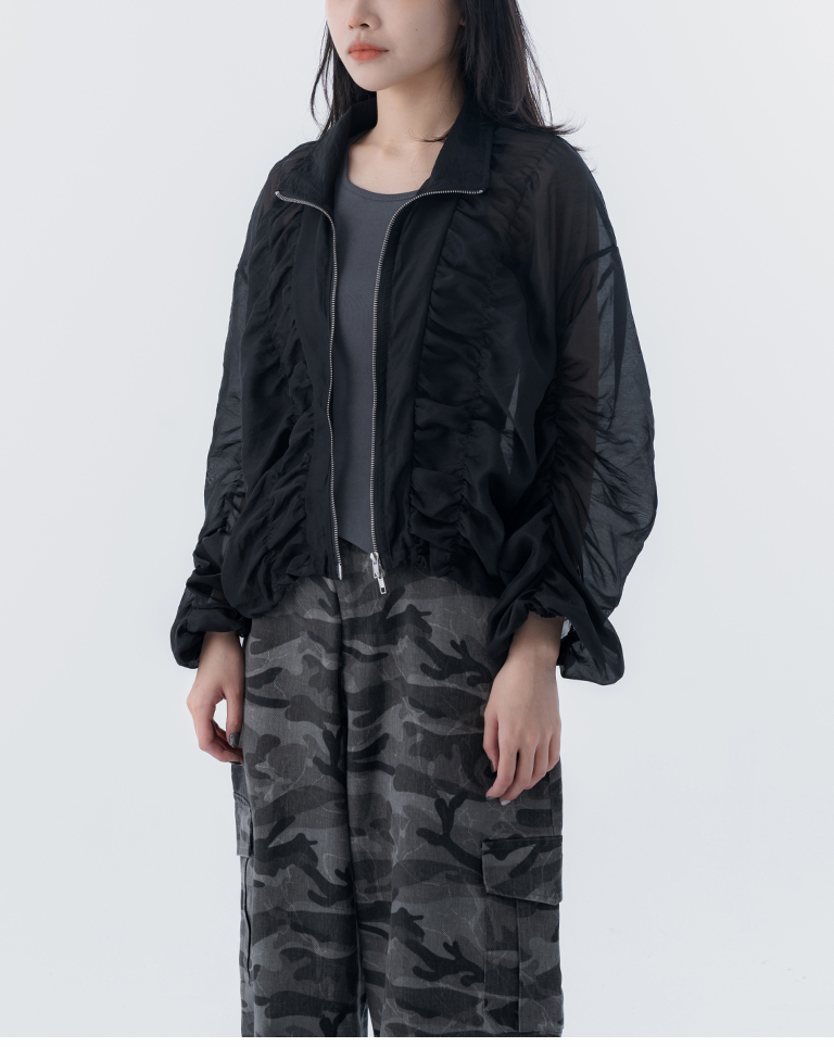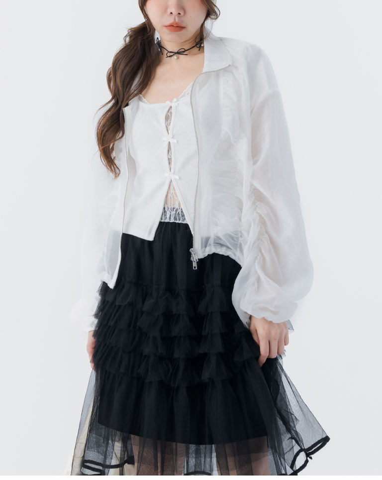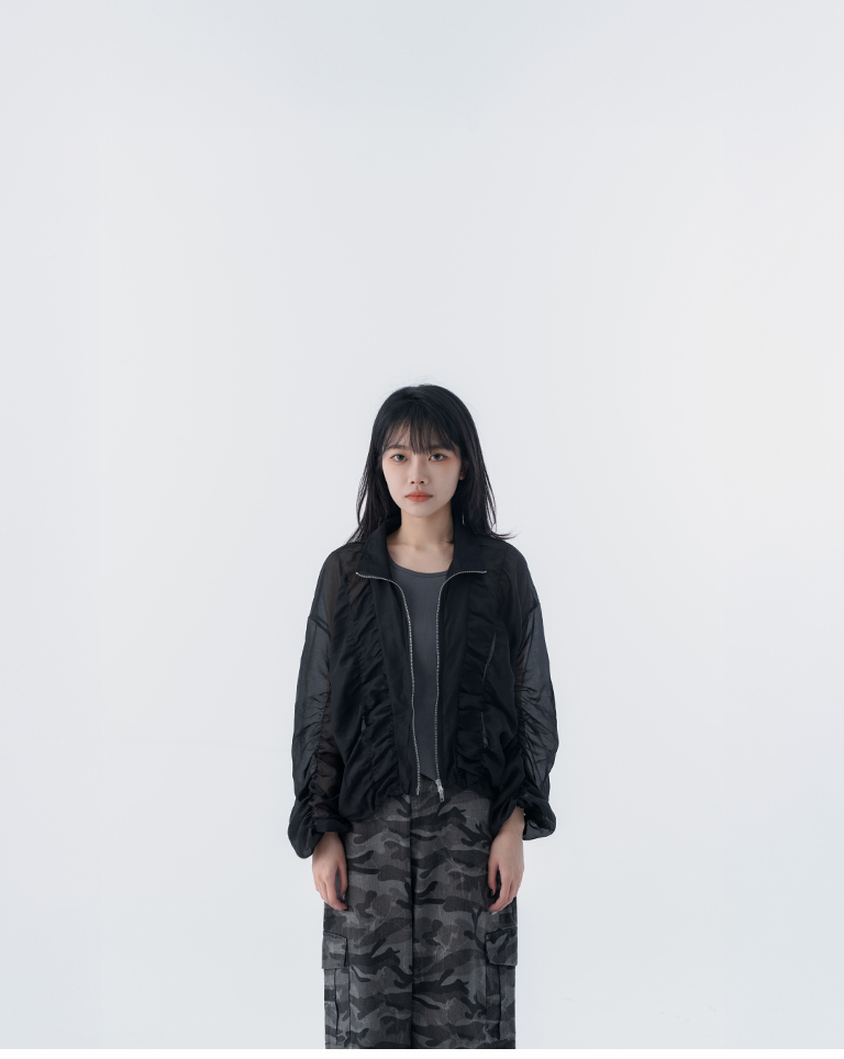 S~L身形實測!分尺寸皺皺木耳邊透膚高領長袖上衣